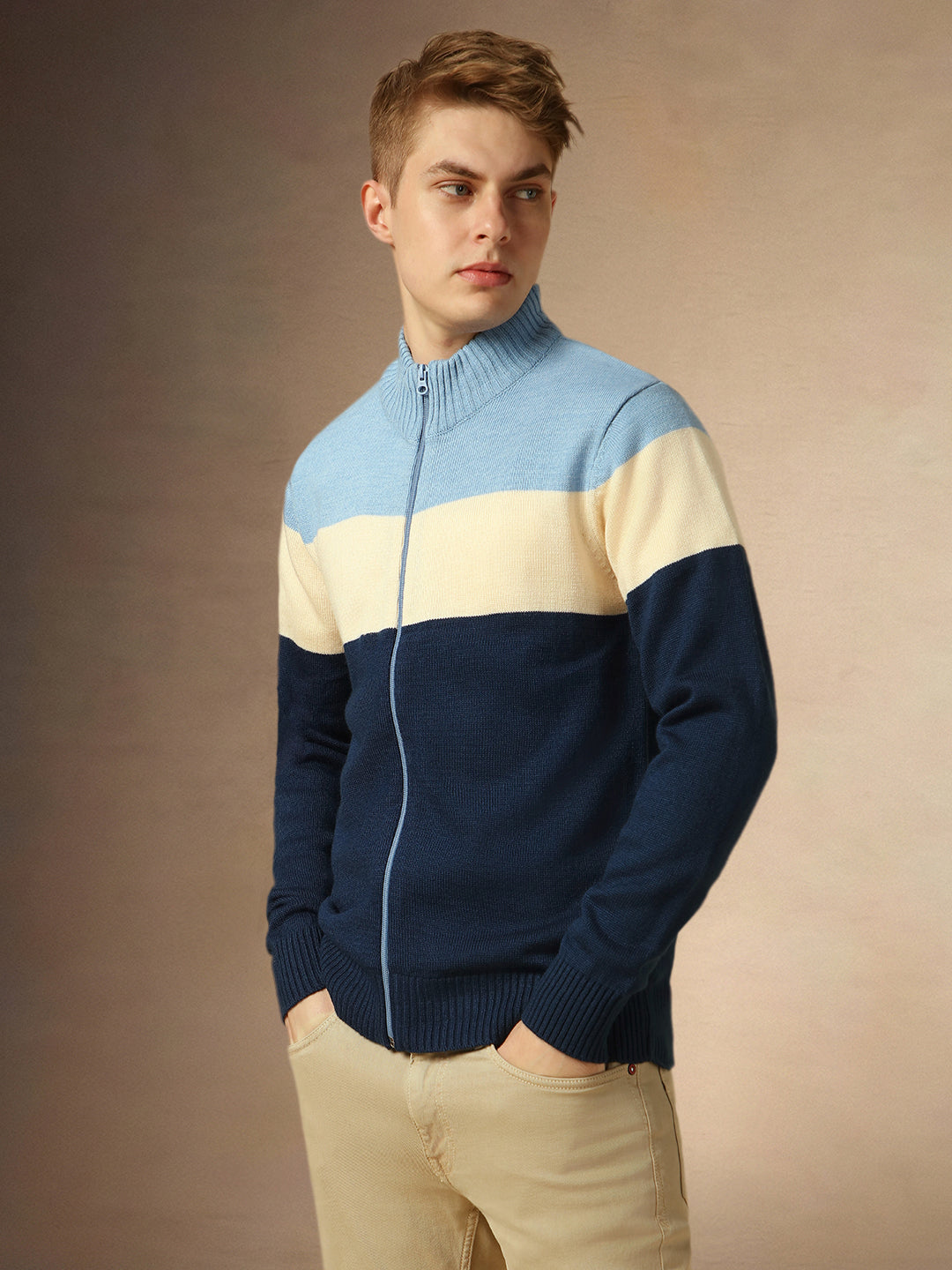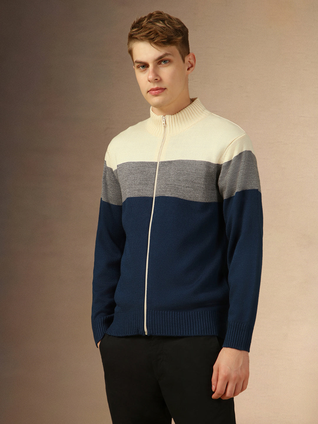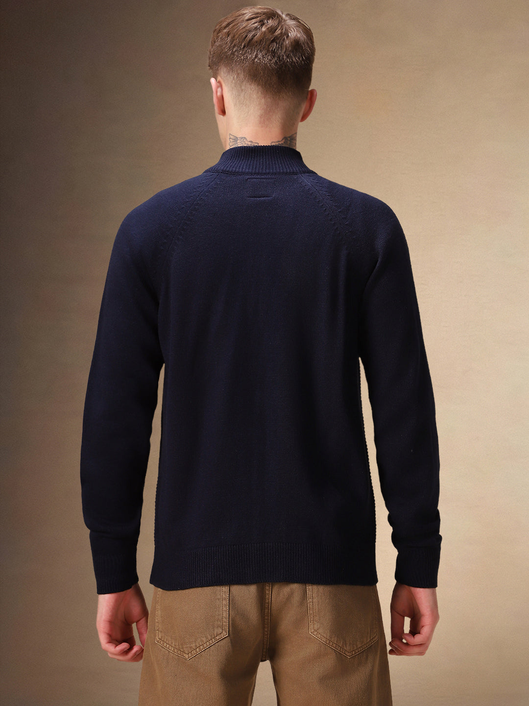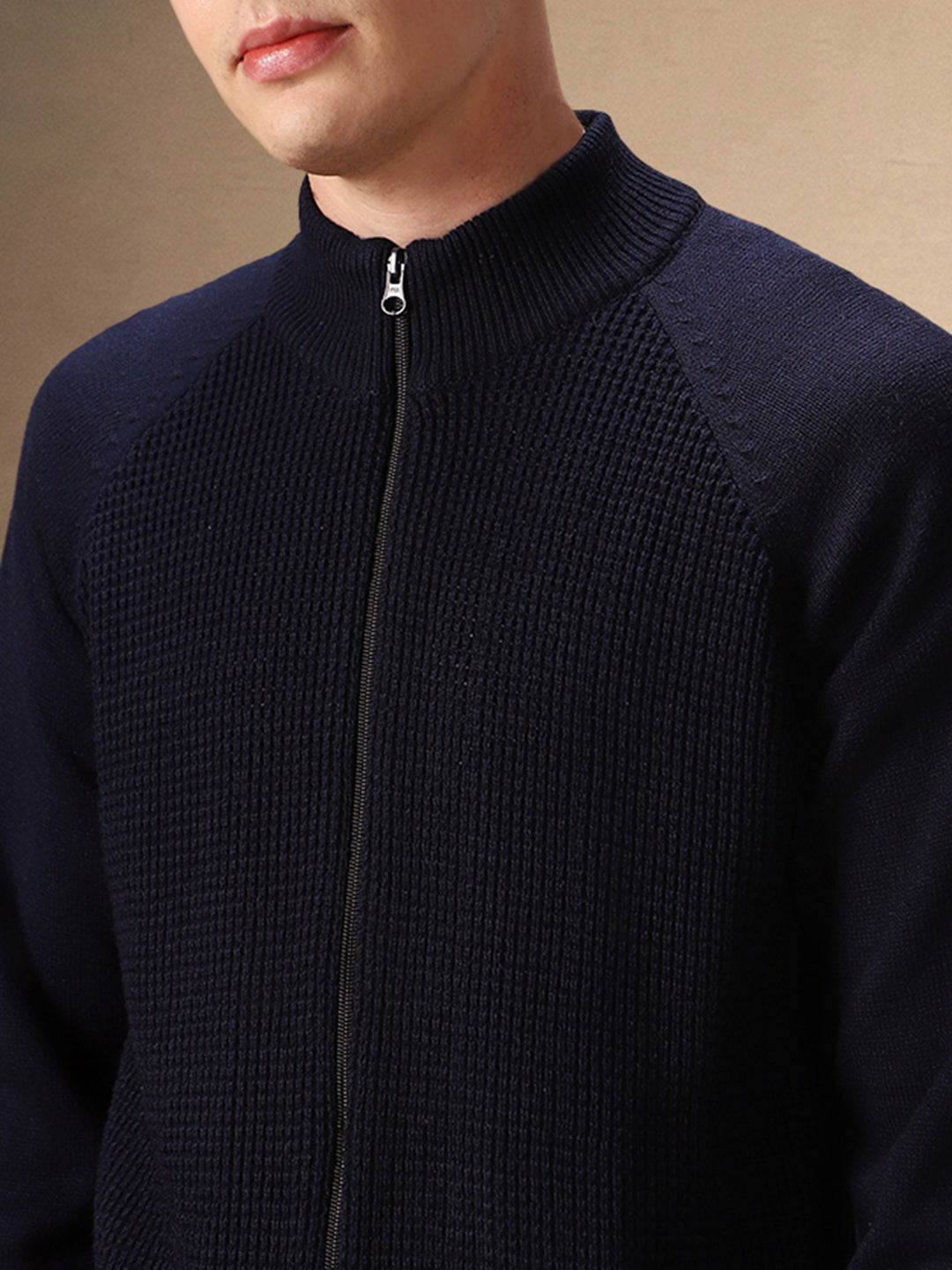 Men's Navy Blue Solid High Neck Full Sleeves Front-Open Sweater