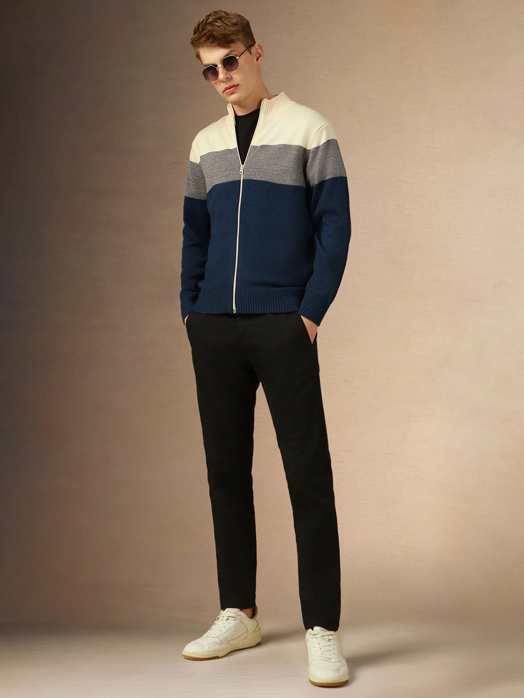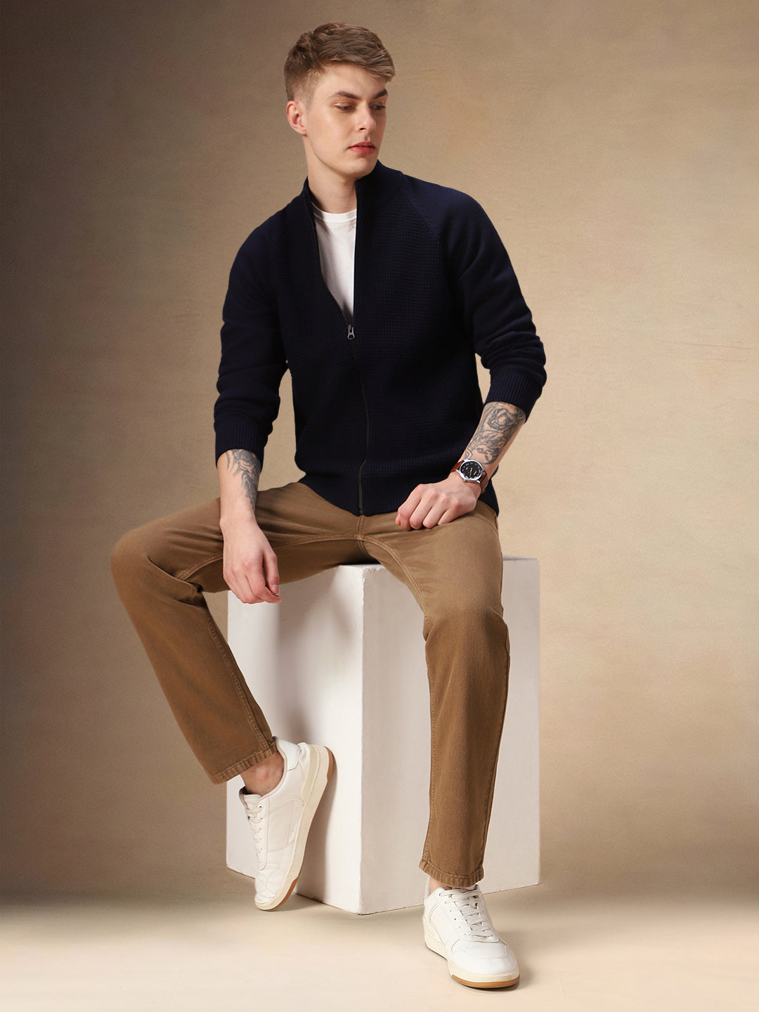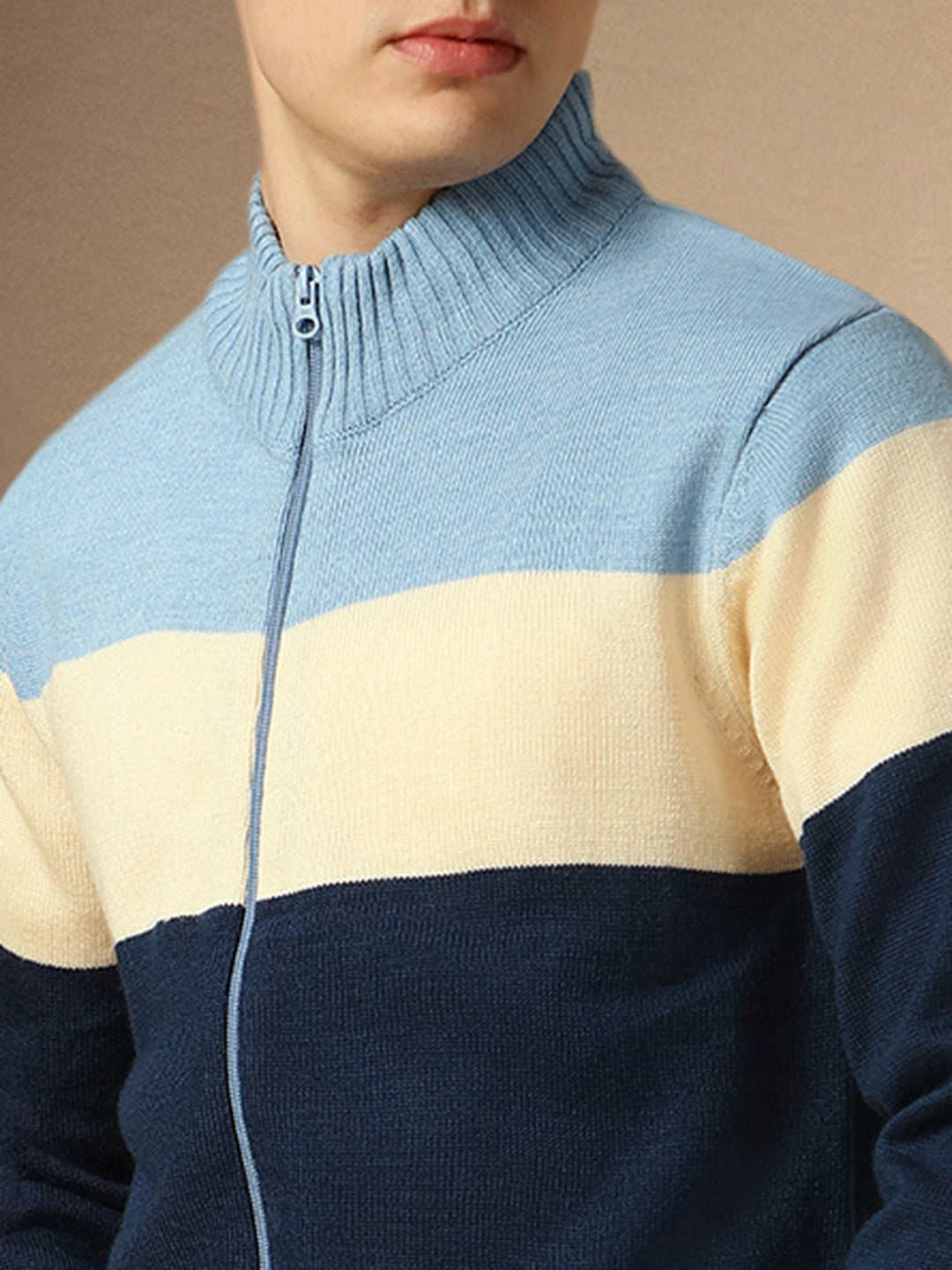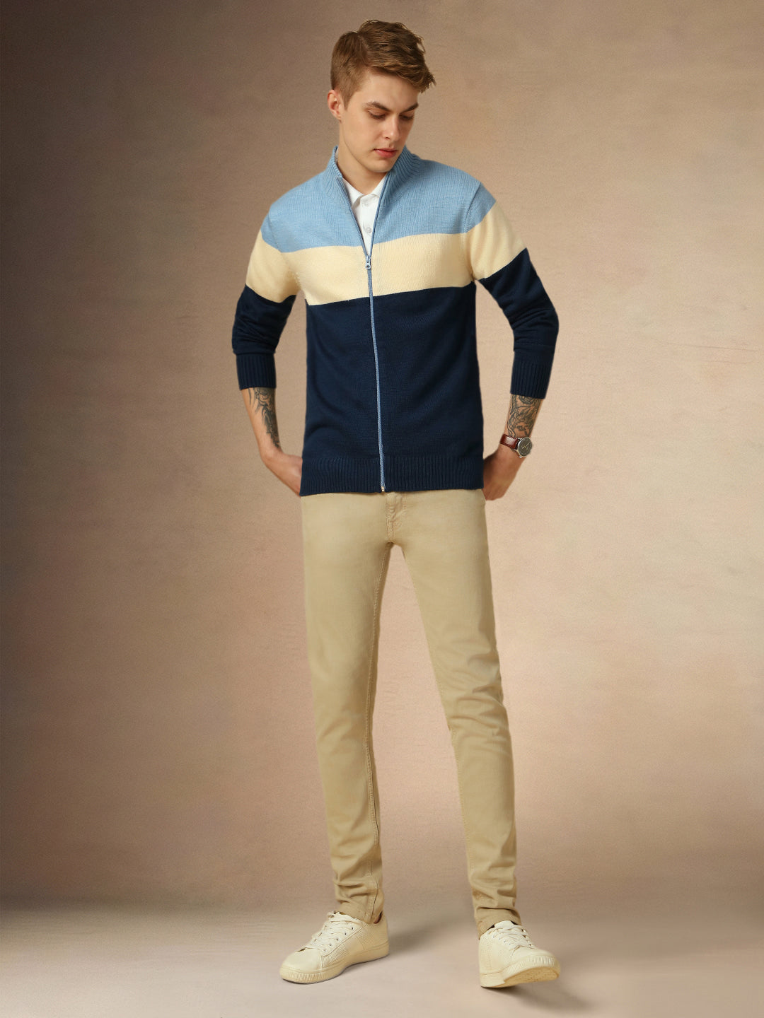 Men's Navy Blue Solid High Neck Full Sleeves Front-Open Sweater