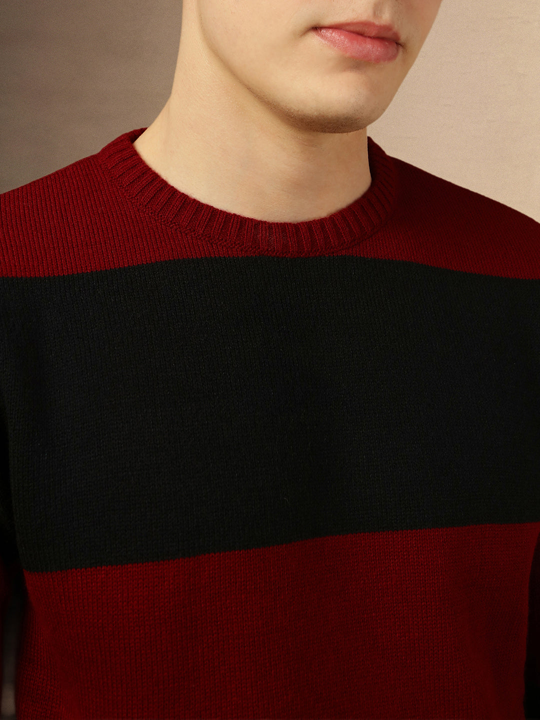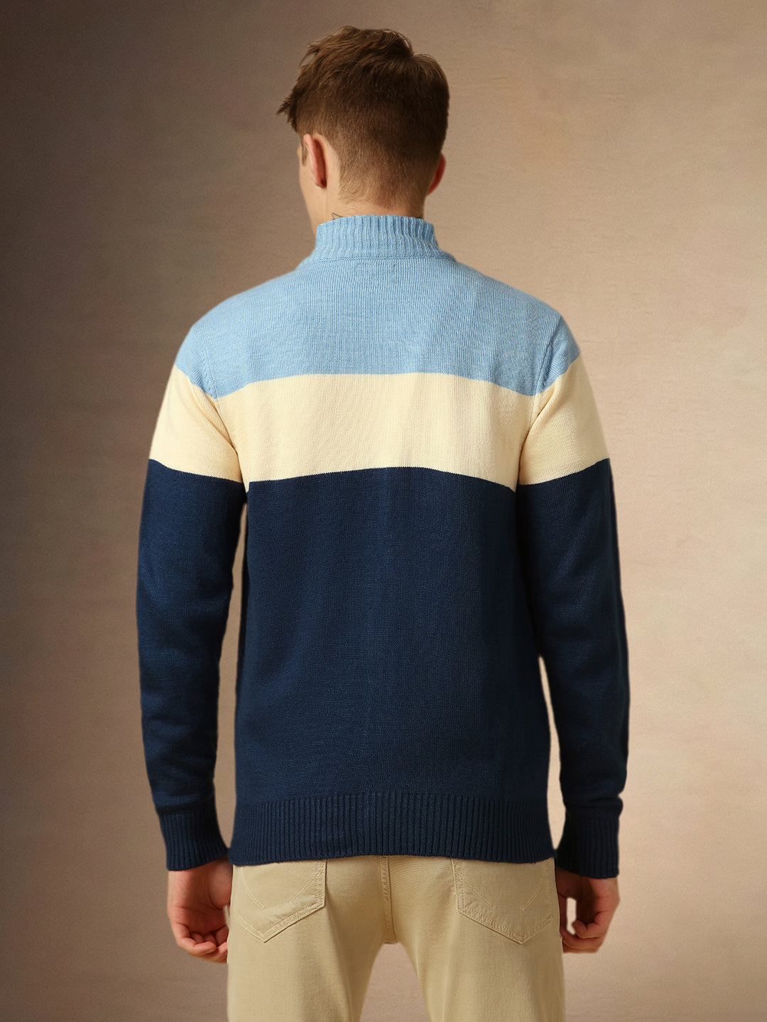 Men's Light Blue ColorBlock Round Neck Pullover Sweater
