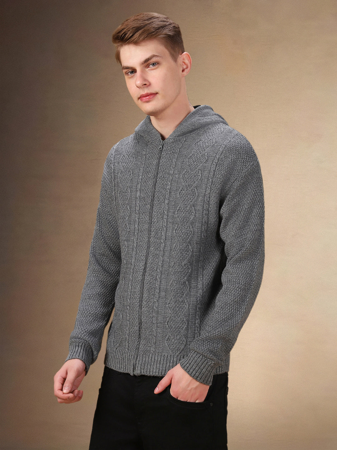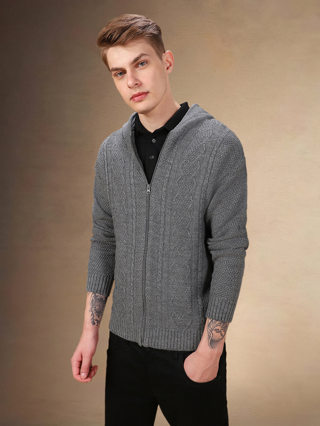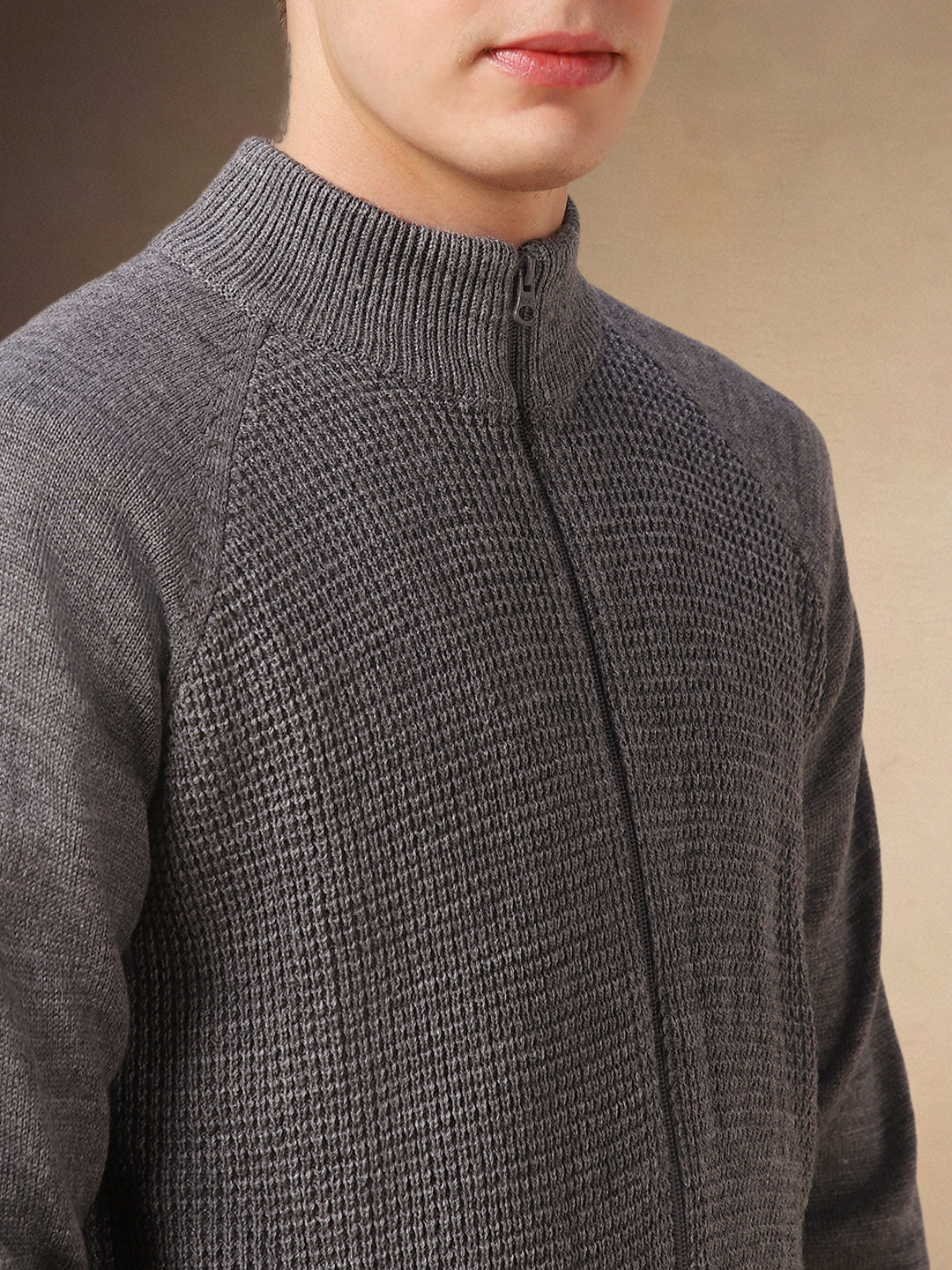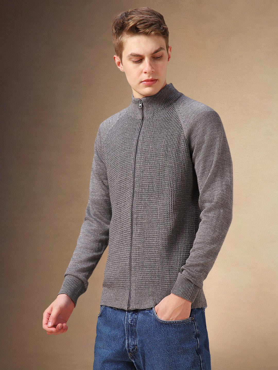Men's Grey Solid High Neck Full Sleeves Front-Open Sweater