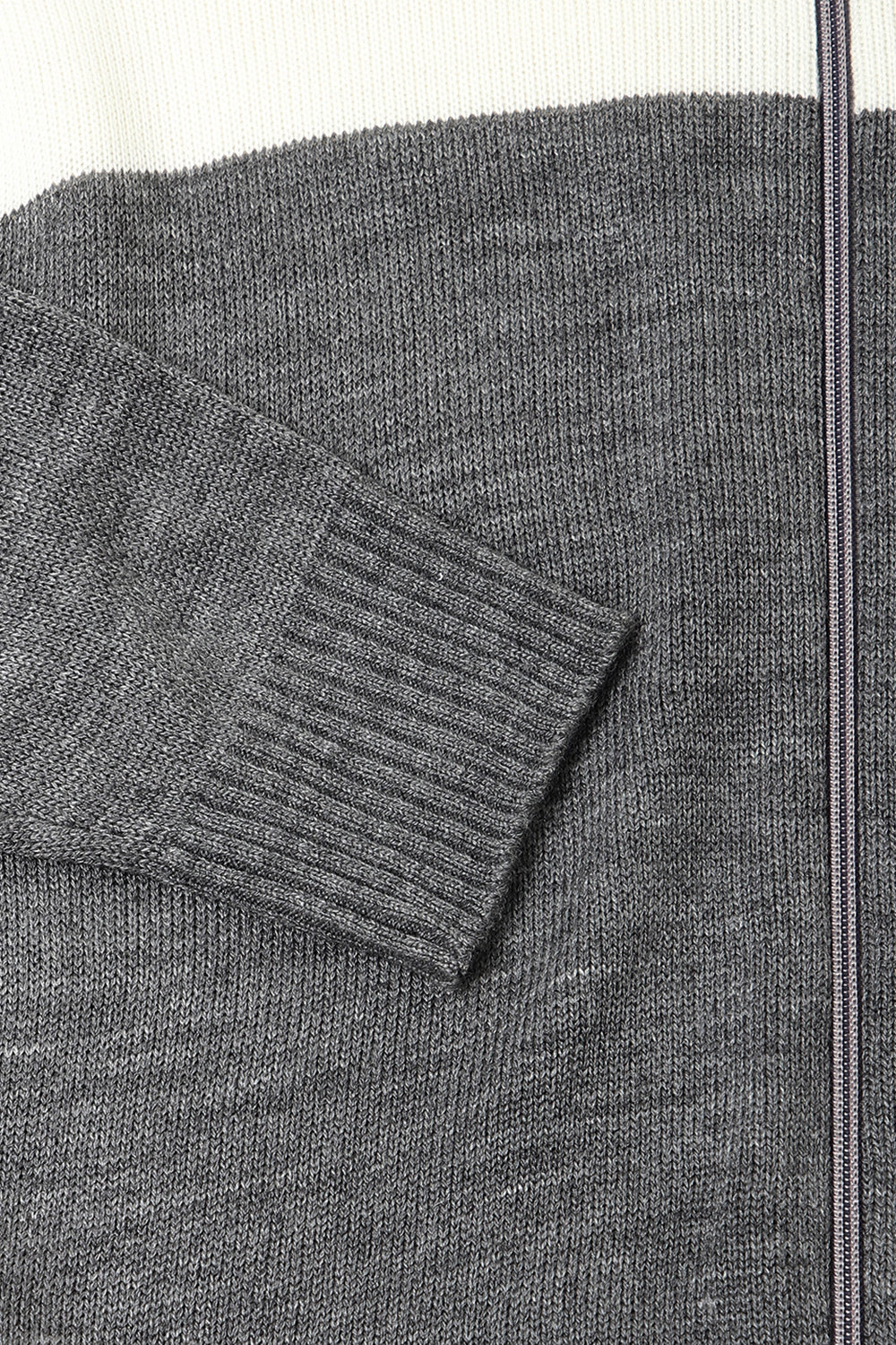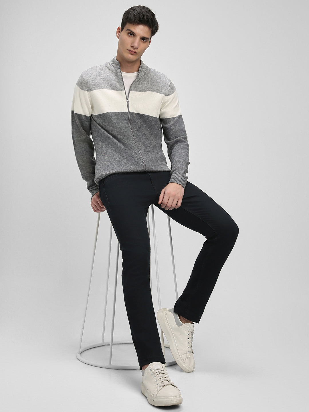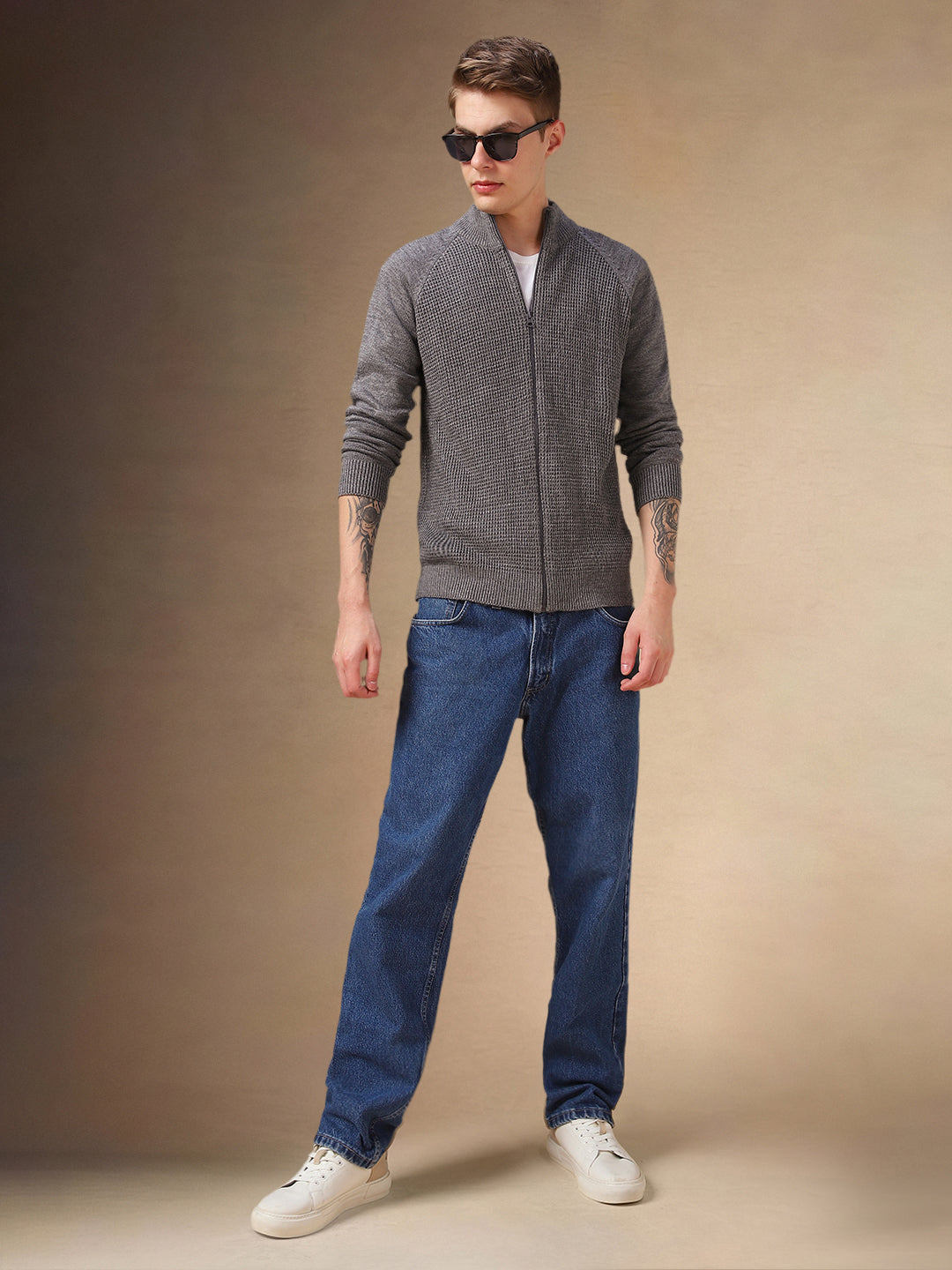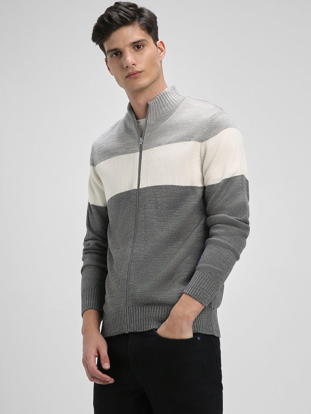 Men's Grey Solid High Neck Full Sleeves Front-Open Sweater