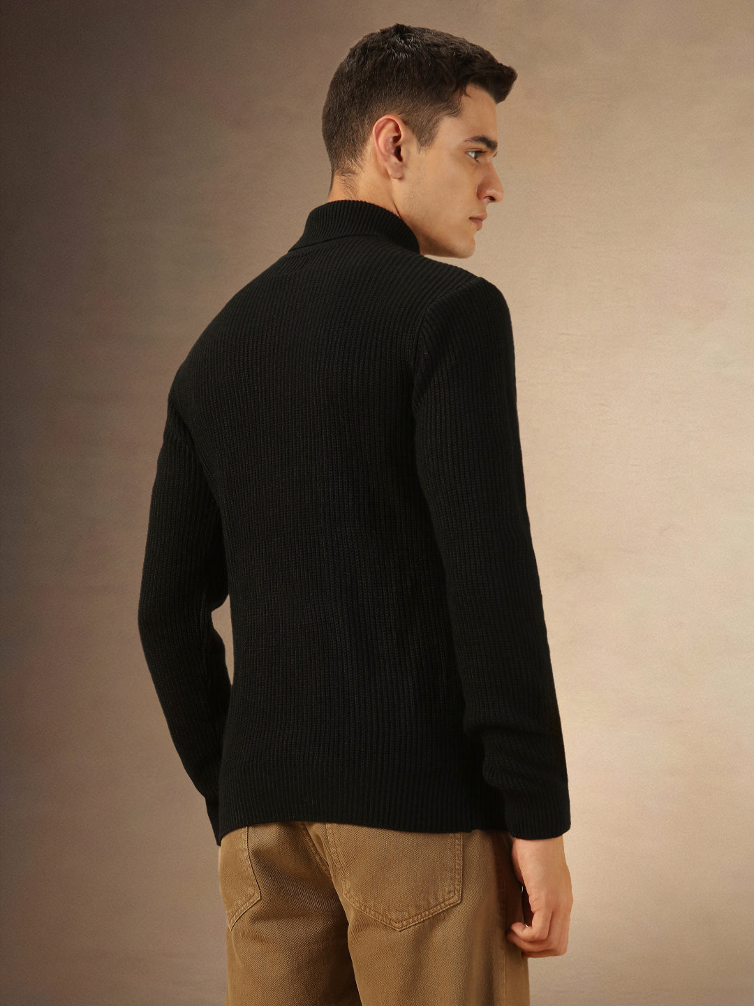 Men's Solid Black Full Sleeves High Neck Front-Open sweater