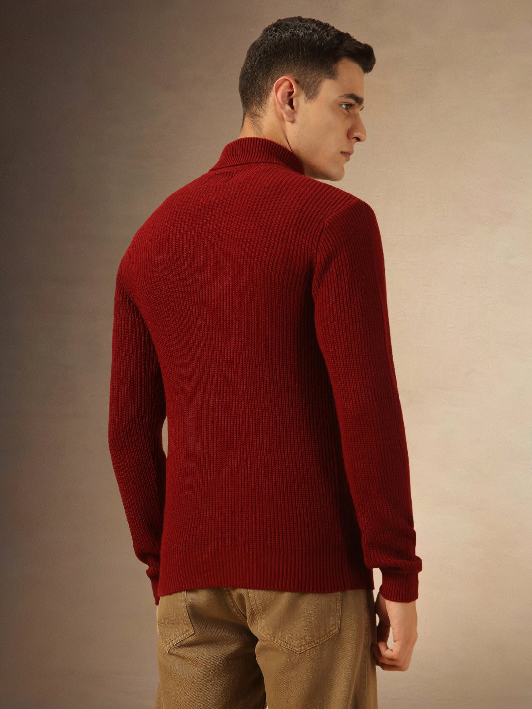 Men's Red Mock Neck Full Sleeves Slim Fit Pullover Sweater