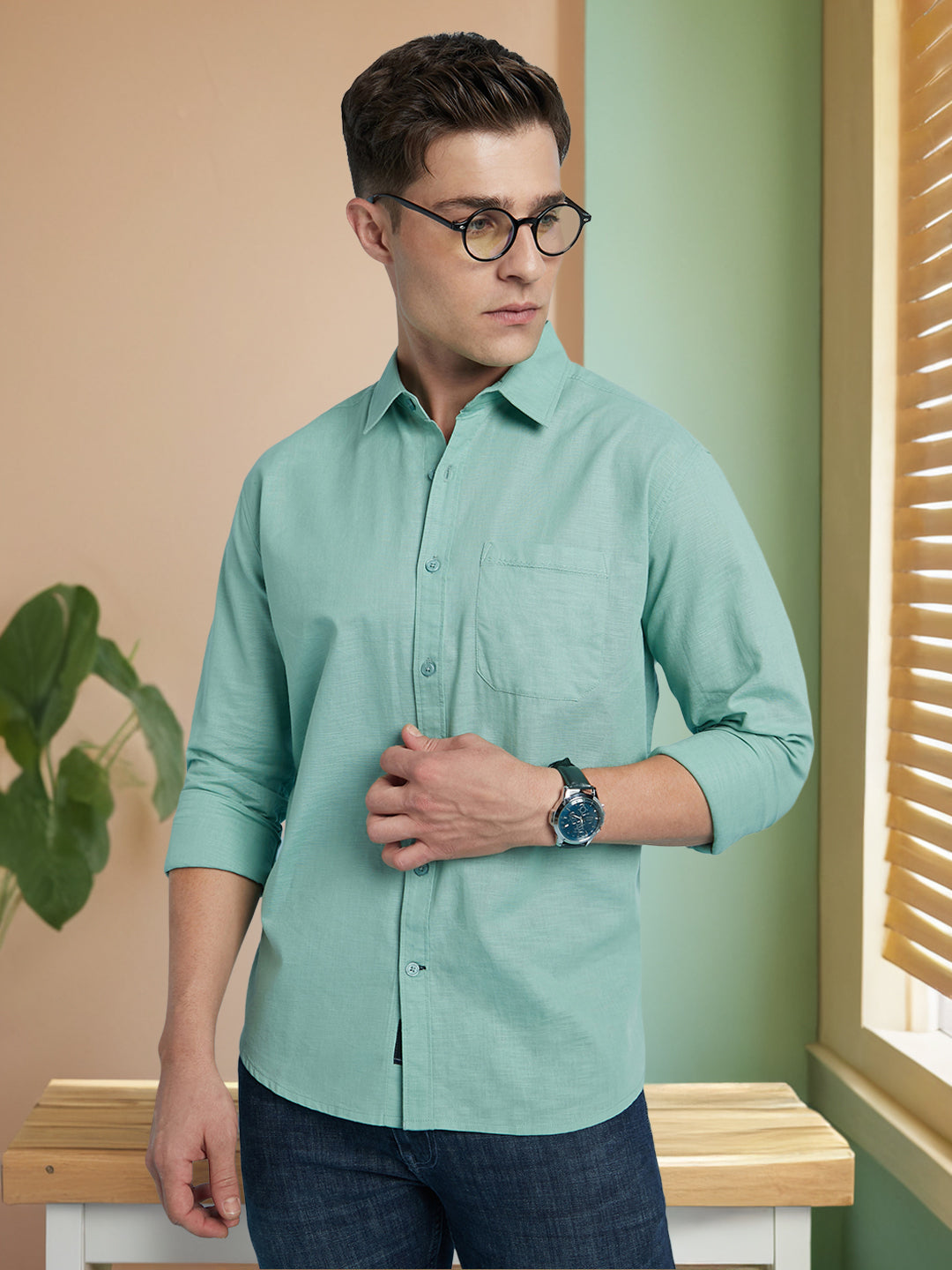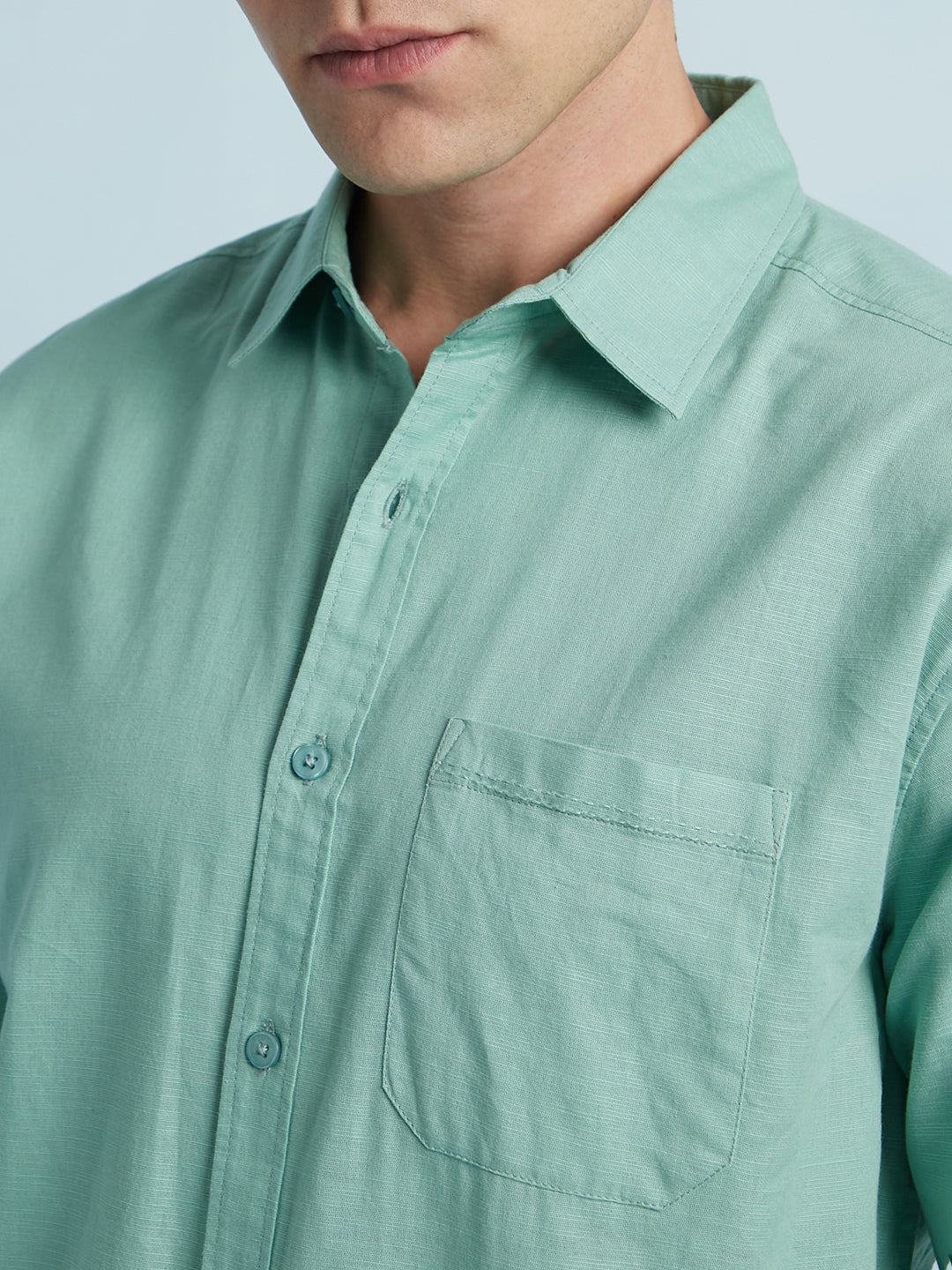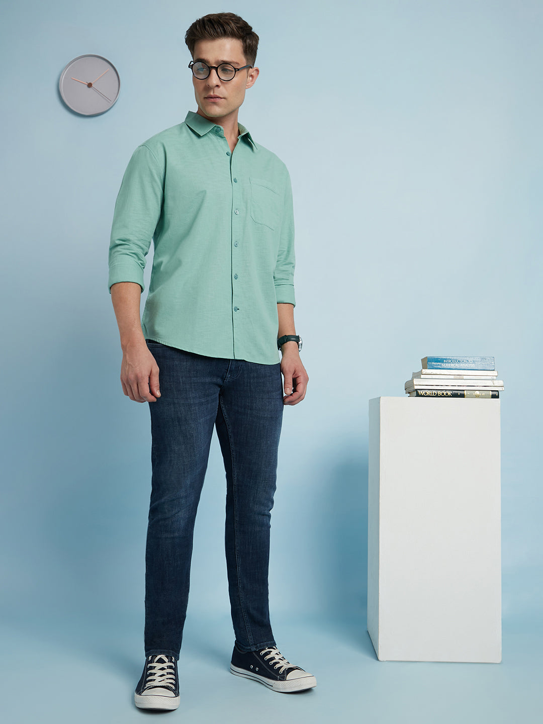 Men's Sage Green Textured Spread Collar Full Sleeves Regular Fit Shirt