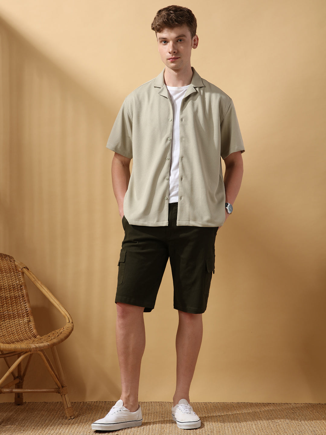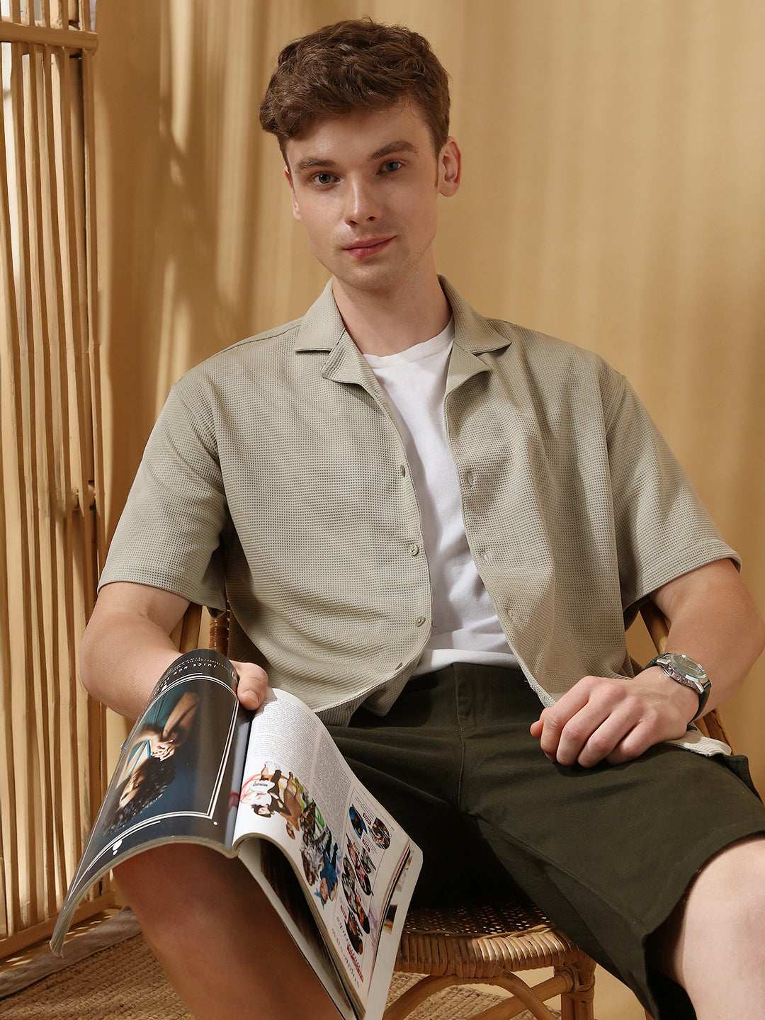 Men's Olive Textured Cuban Collar Half Sleeves Relaxed Fit Shirt