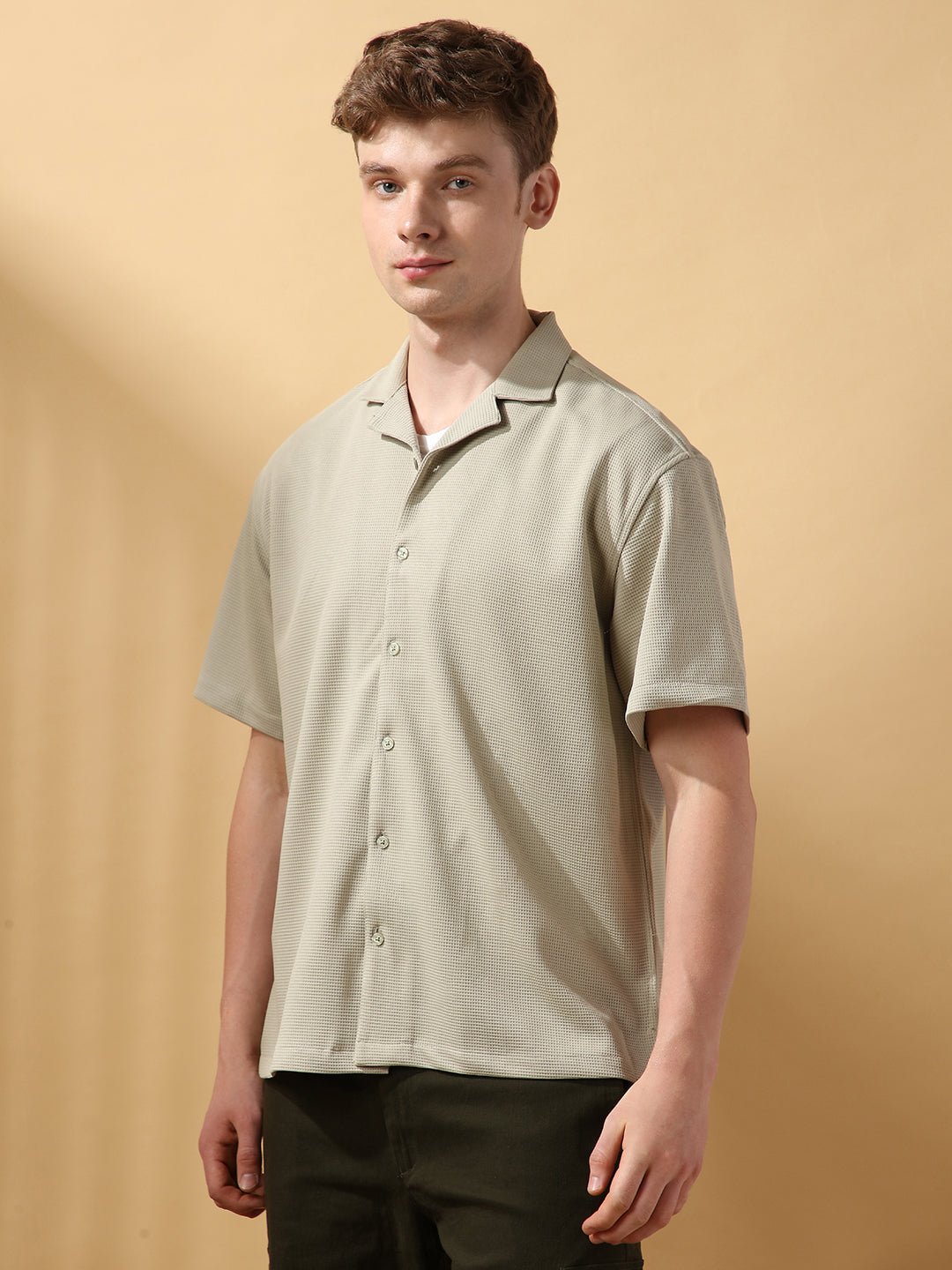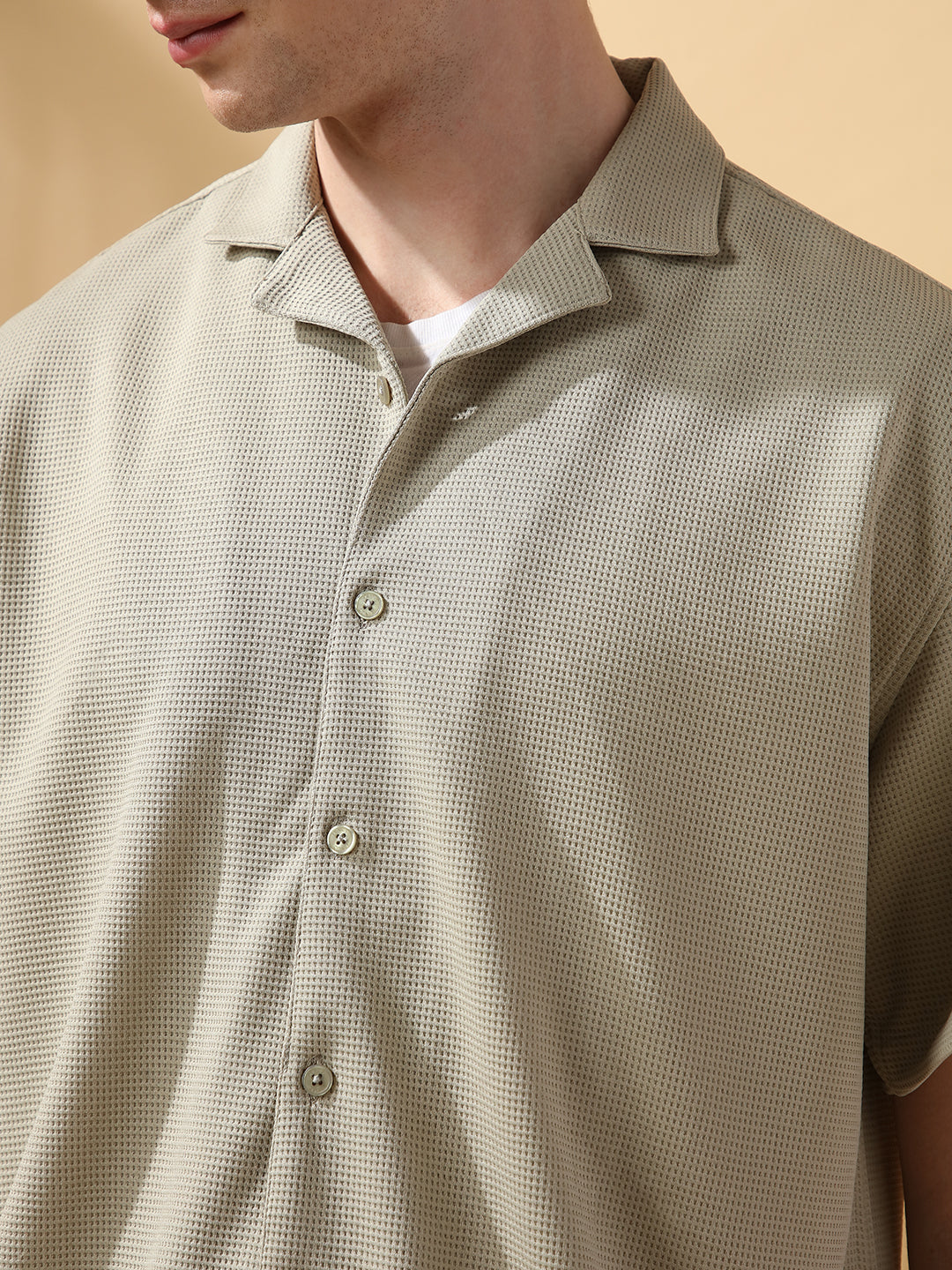 Men's Beige Textured Cuban Collar Half Sleeves Relaxed Fit Shirt
