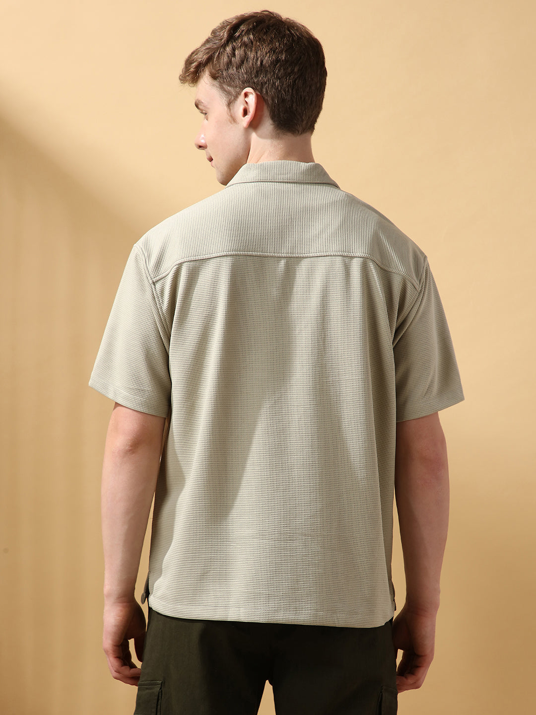 Men's Grey Solid Textured Cuban Collar Half Sleeves Casual Shirt
