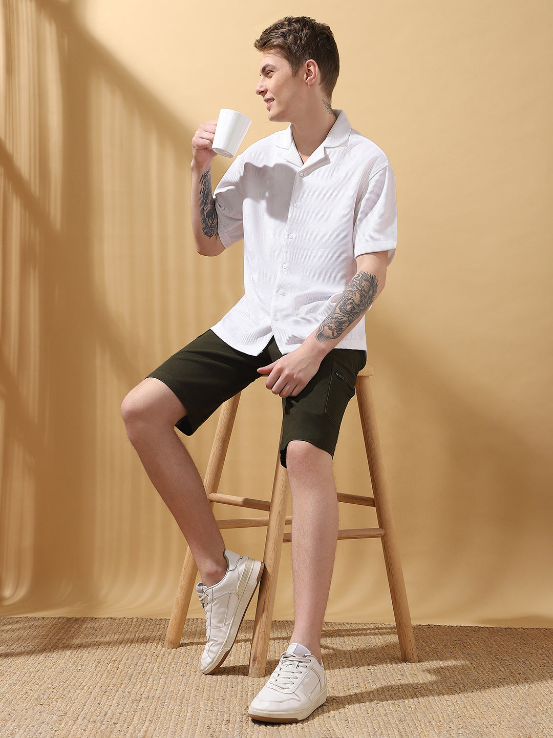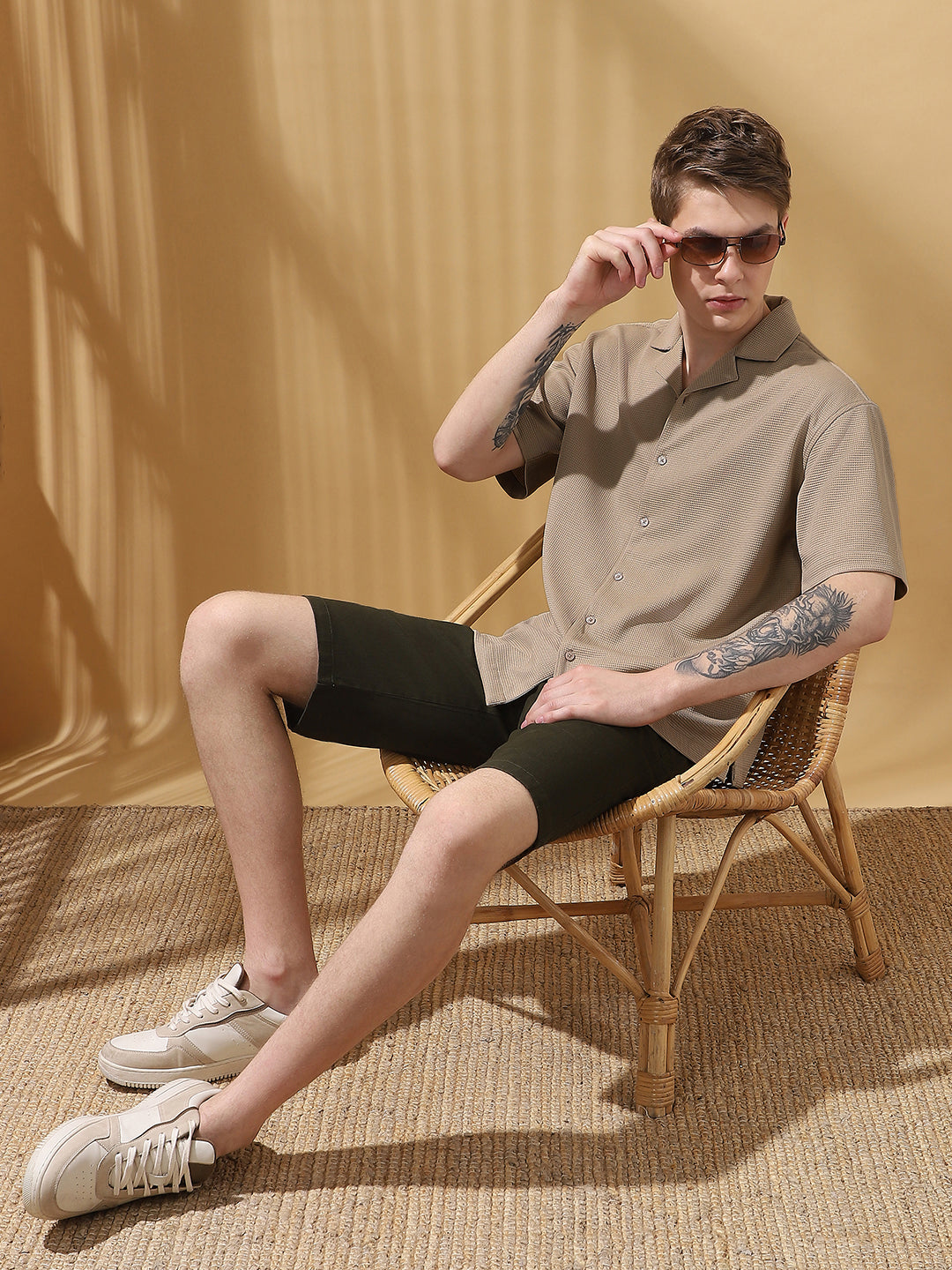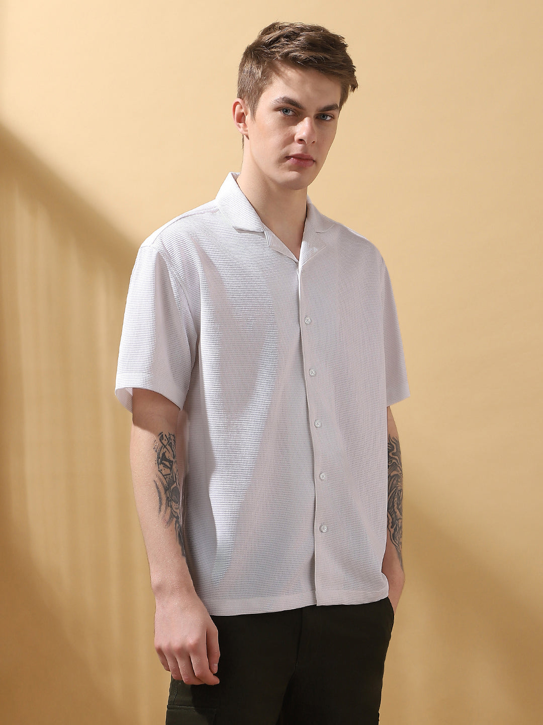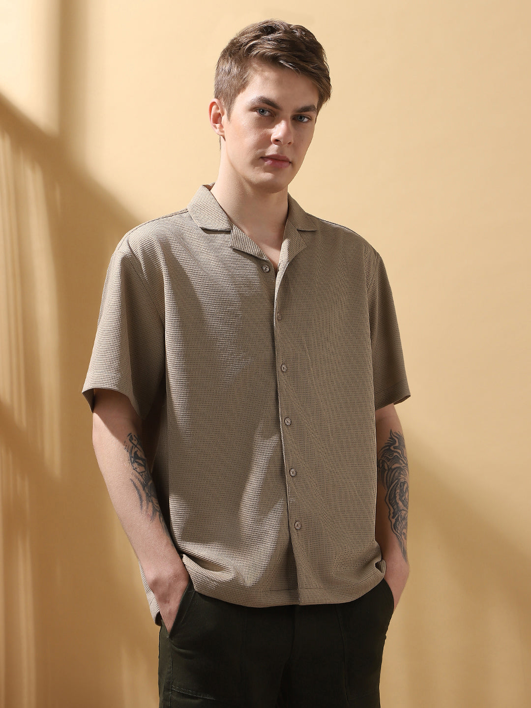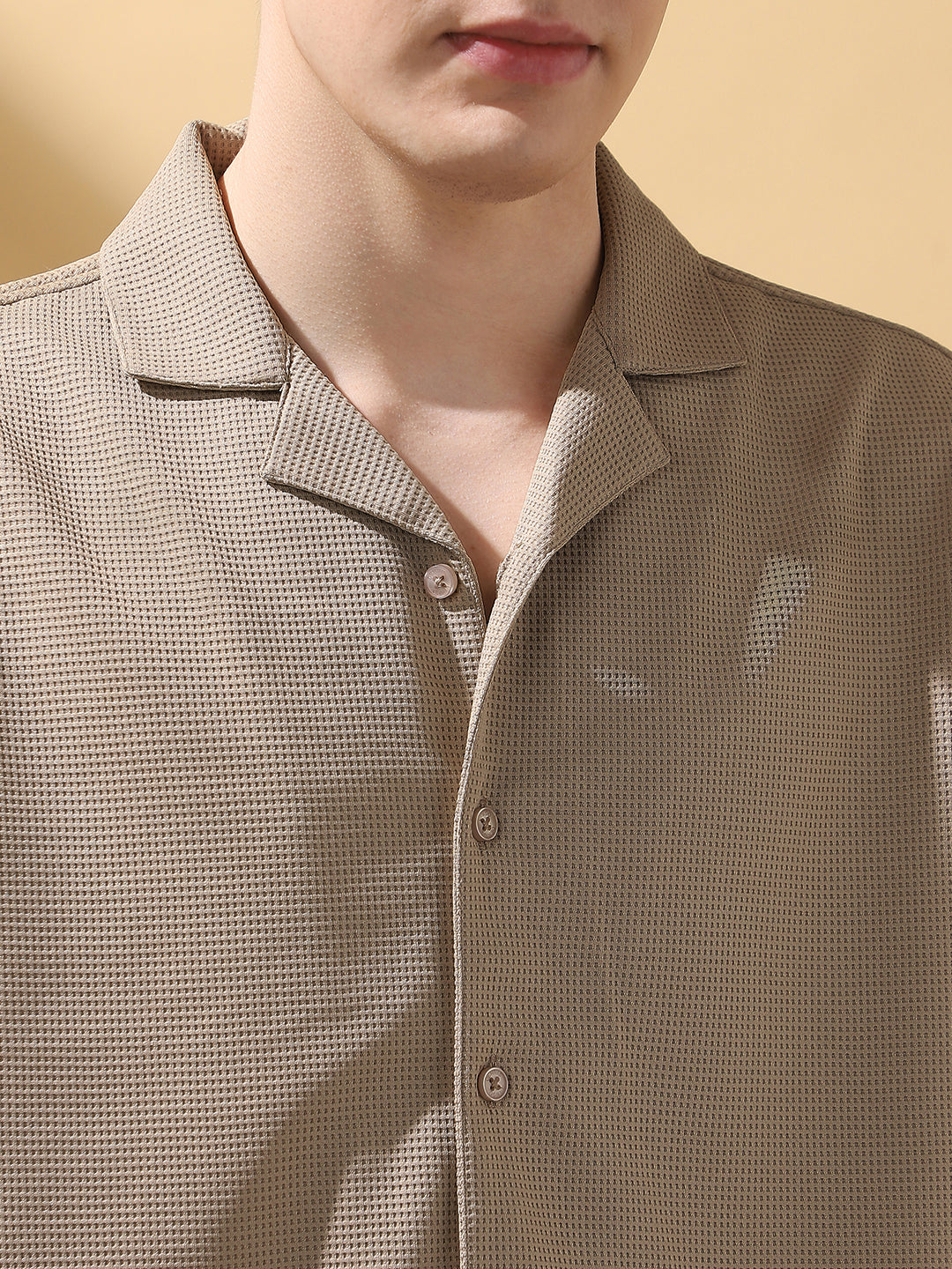 Men's Beige Solid Textured Cuban Collar Half Sleeves Casual Shirt