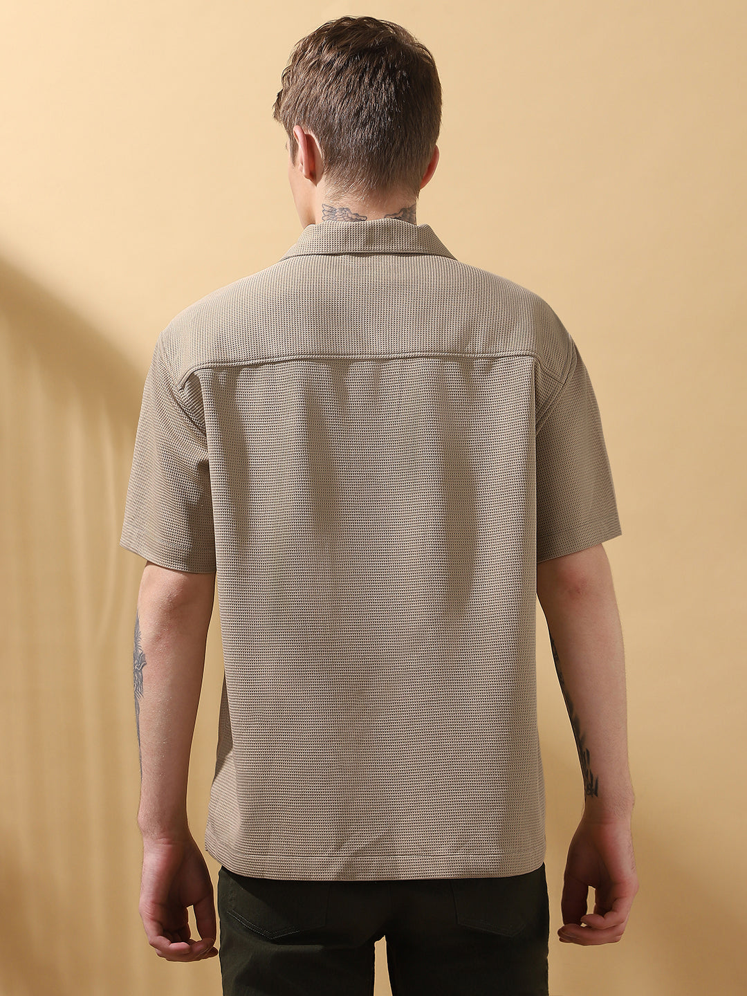 Men's Beige Solid Textured Spread Collar Half Sleeves Casual Shirt