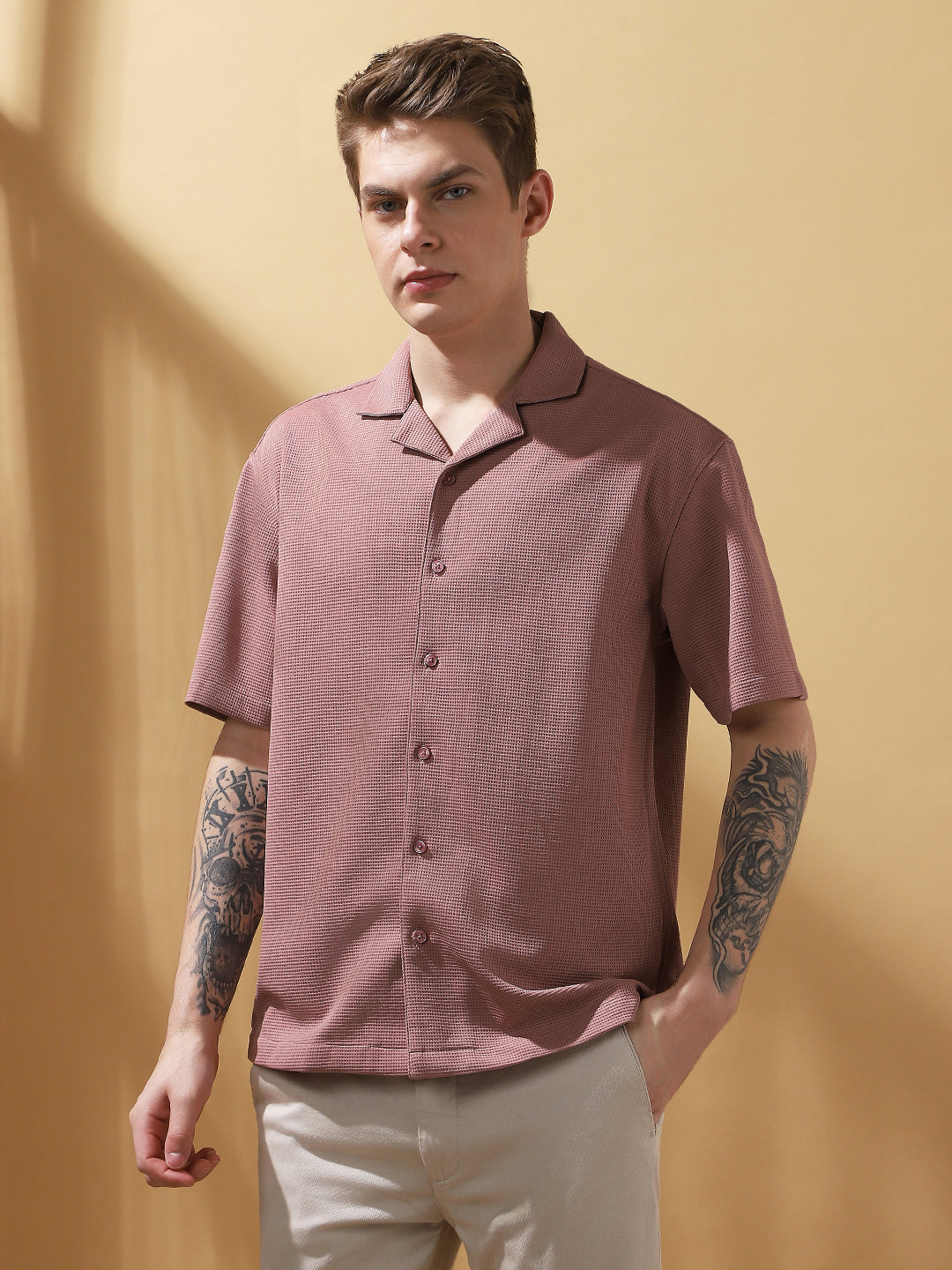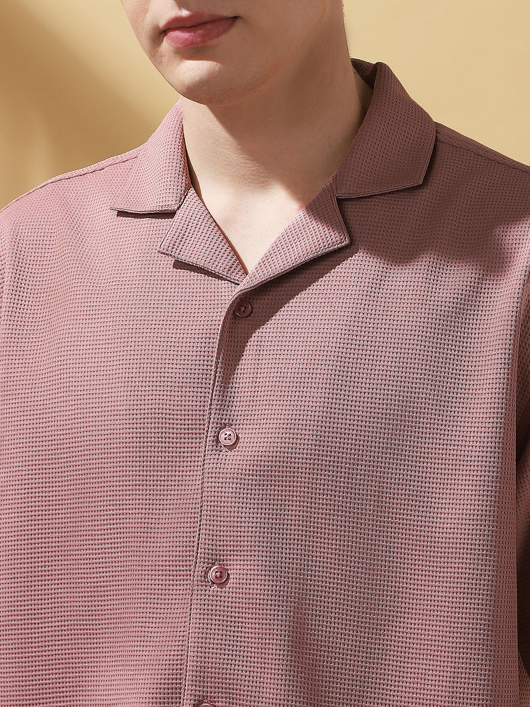 Men's Pink Solid Textured Cuban Collar Half Sleeves Casual Shirt