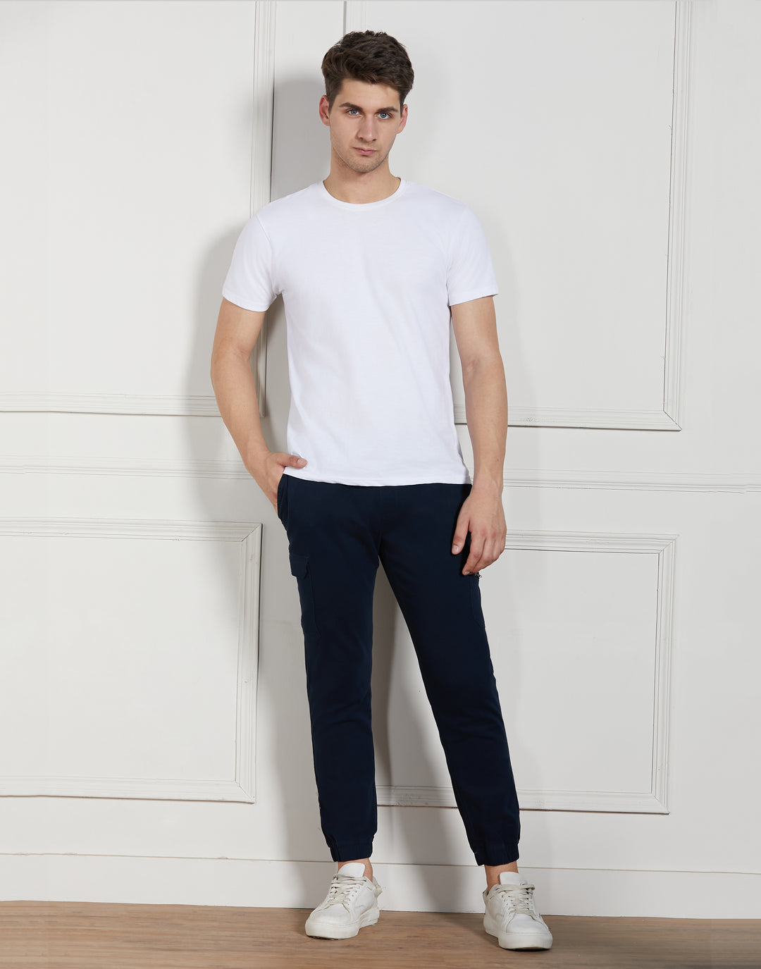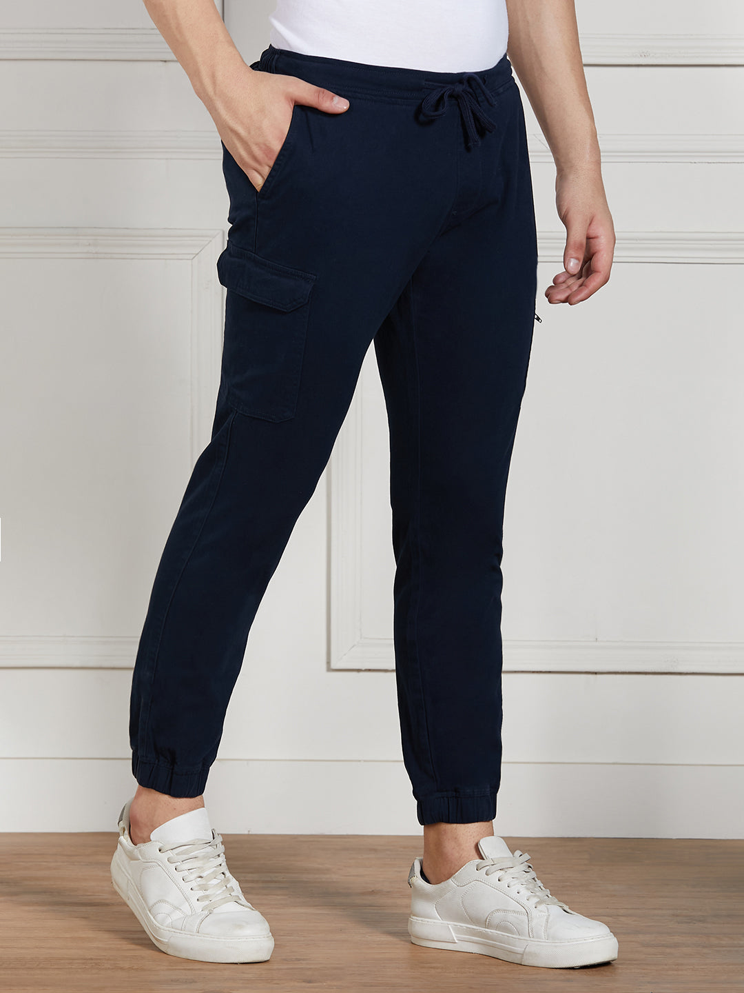 Men's Navy Cotton Lycra Solid Stretchable Regular Fit Cargo Joggers