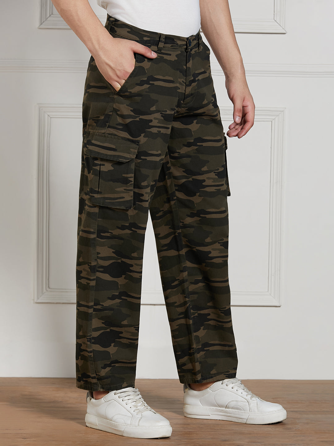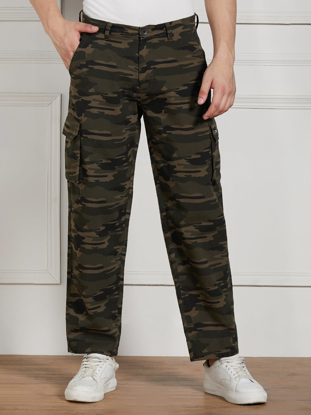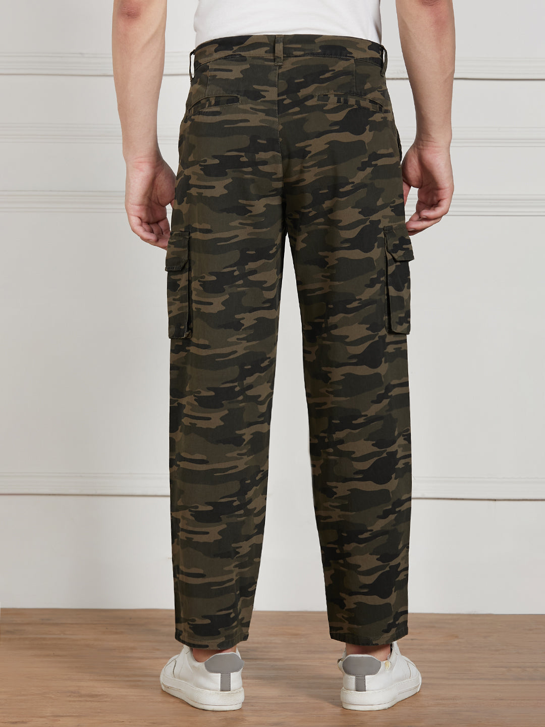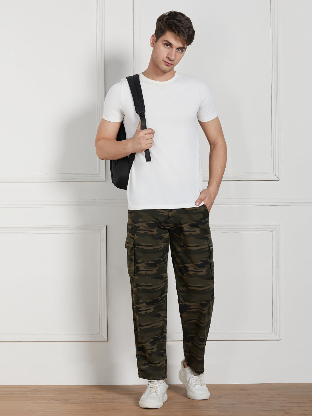 Men's Olive Cotton Lycra Camouflage Stretchable Relaxed fit Cargo Trousers