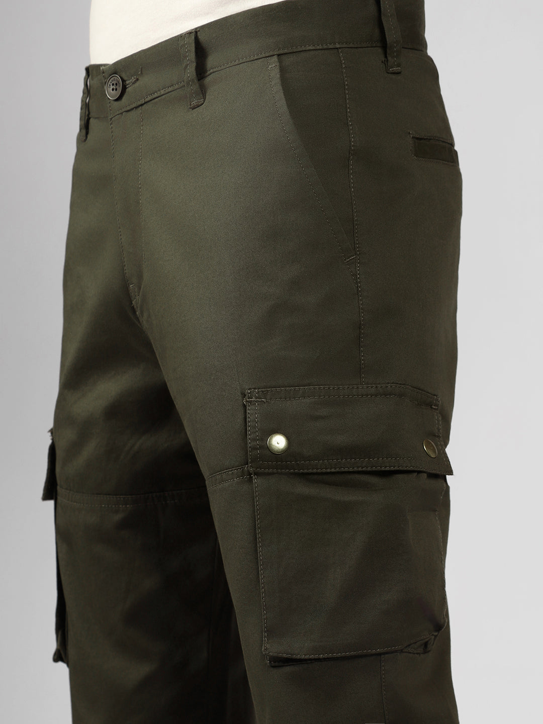 Men's Sage Solid Cotton Relaxed Fit Mid-Rise Cargo Trousers