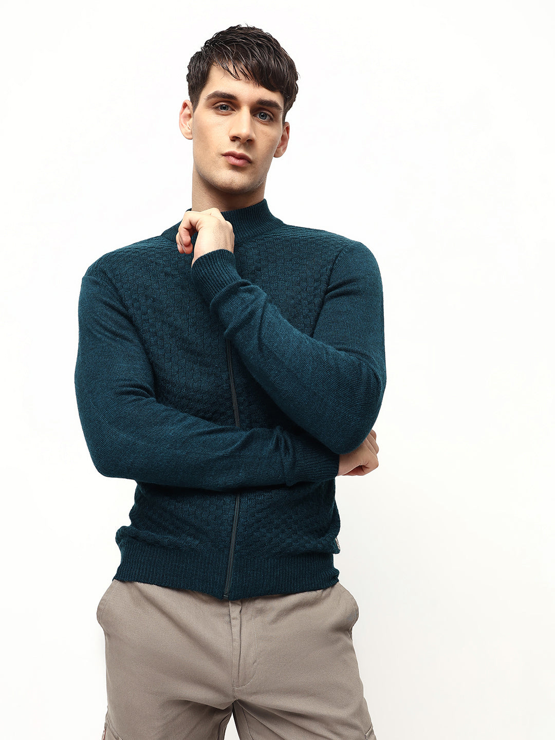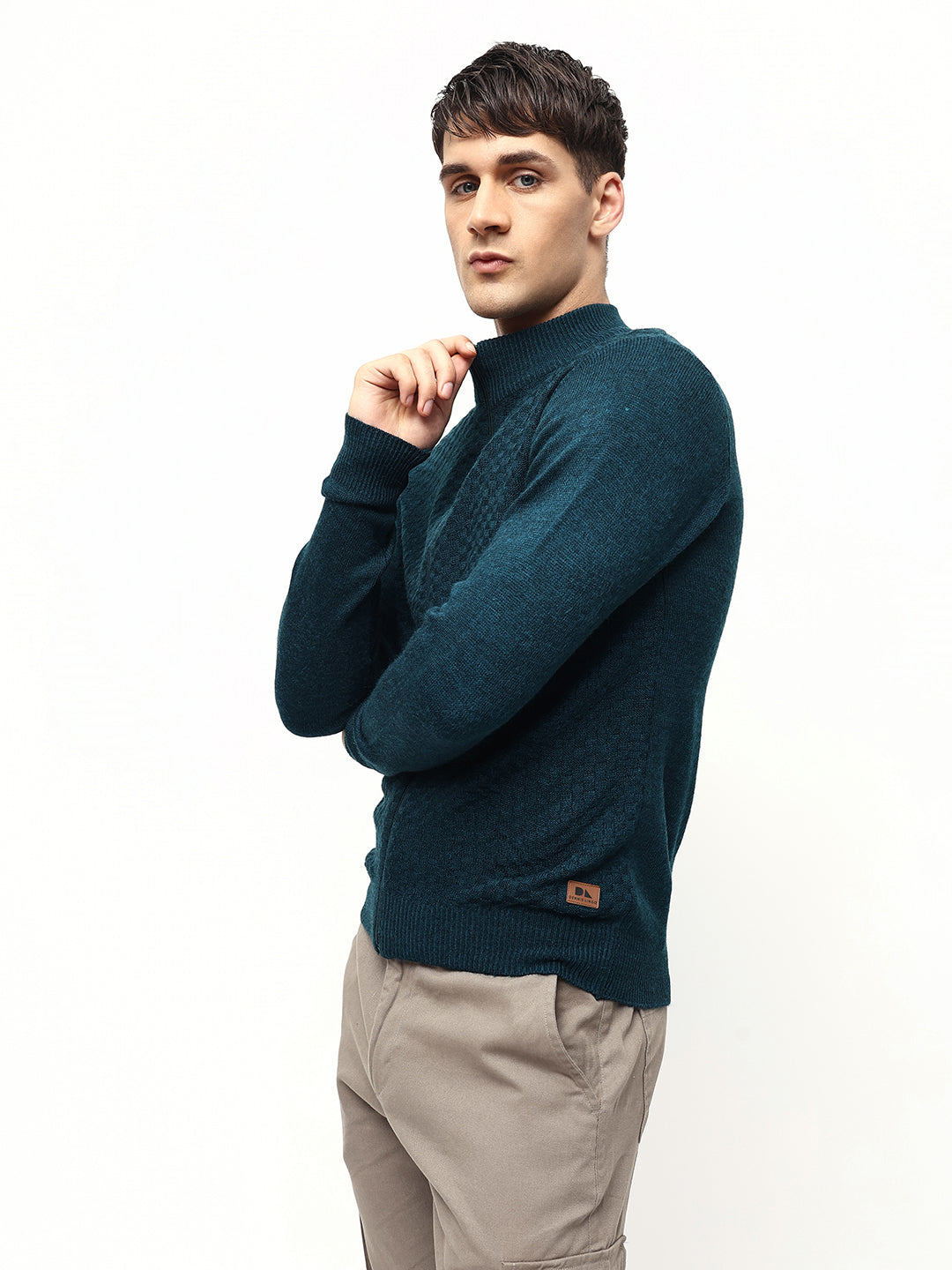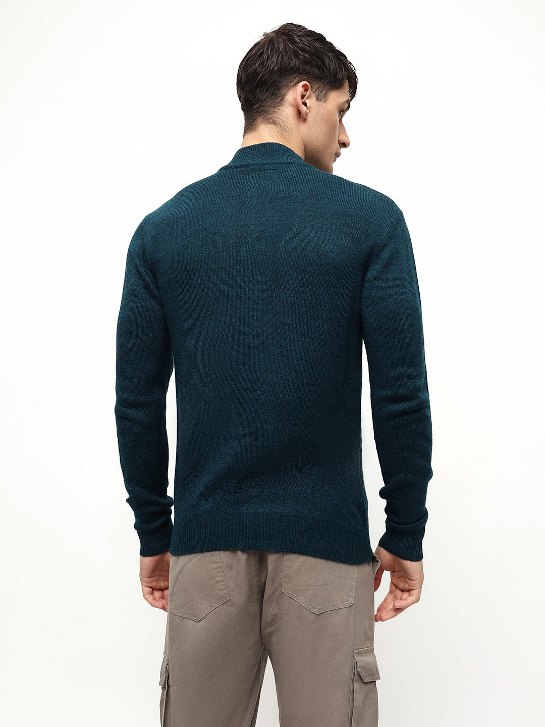 Men's Teal Mock Neck Full Sleeves Slim Fit Pullover Sweater