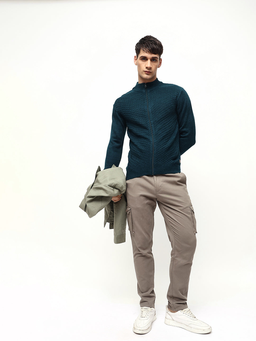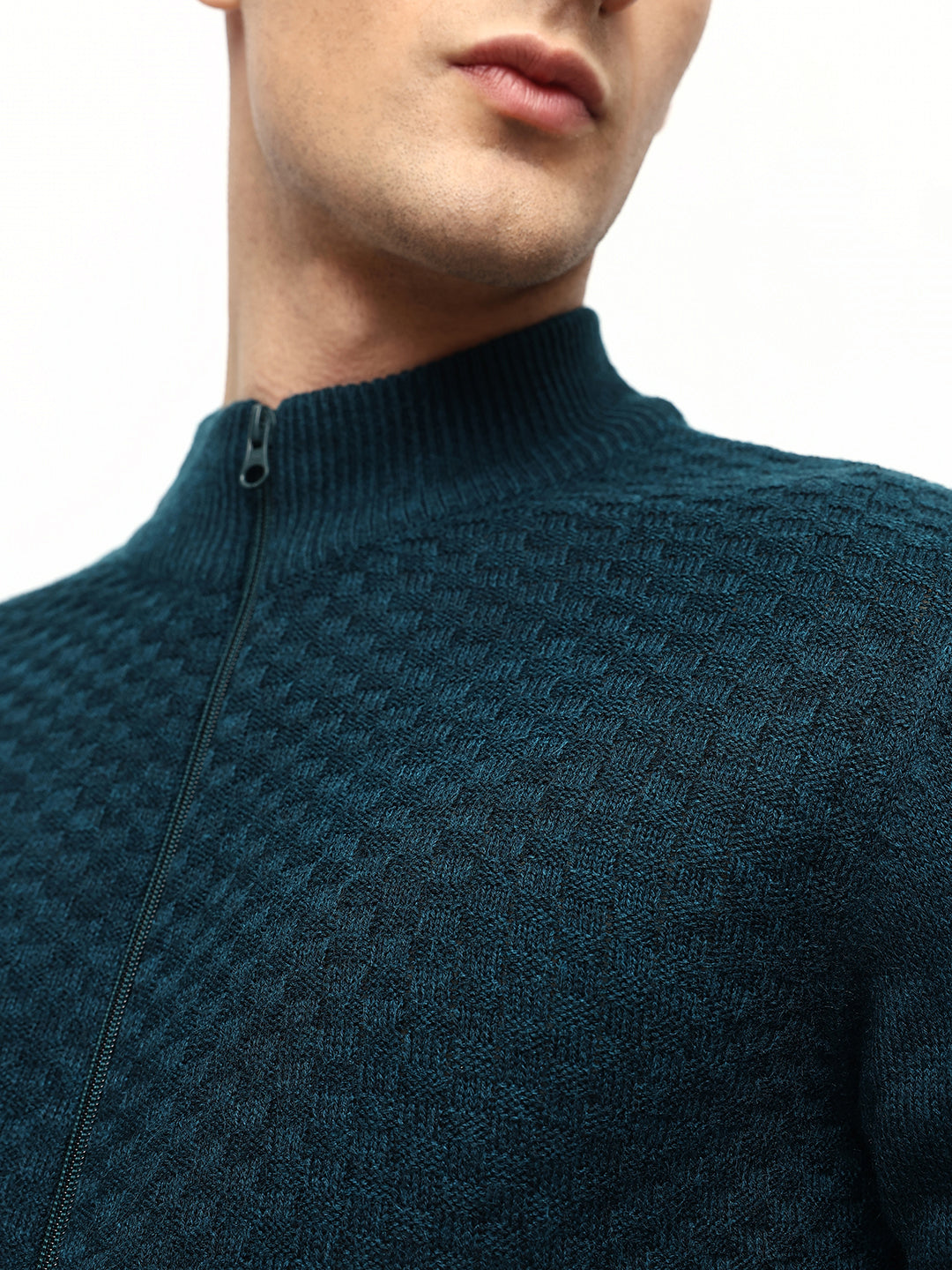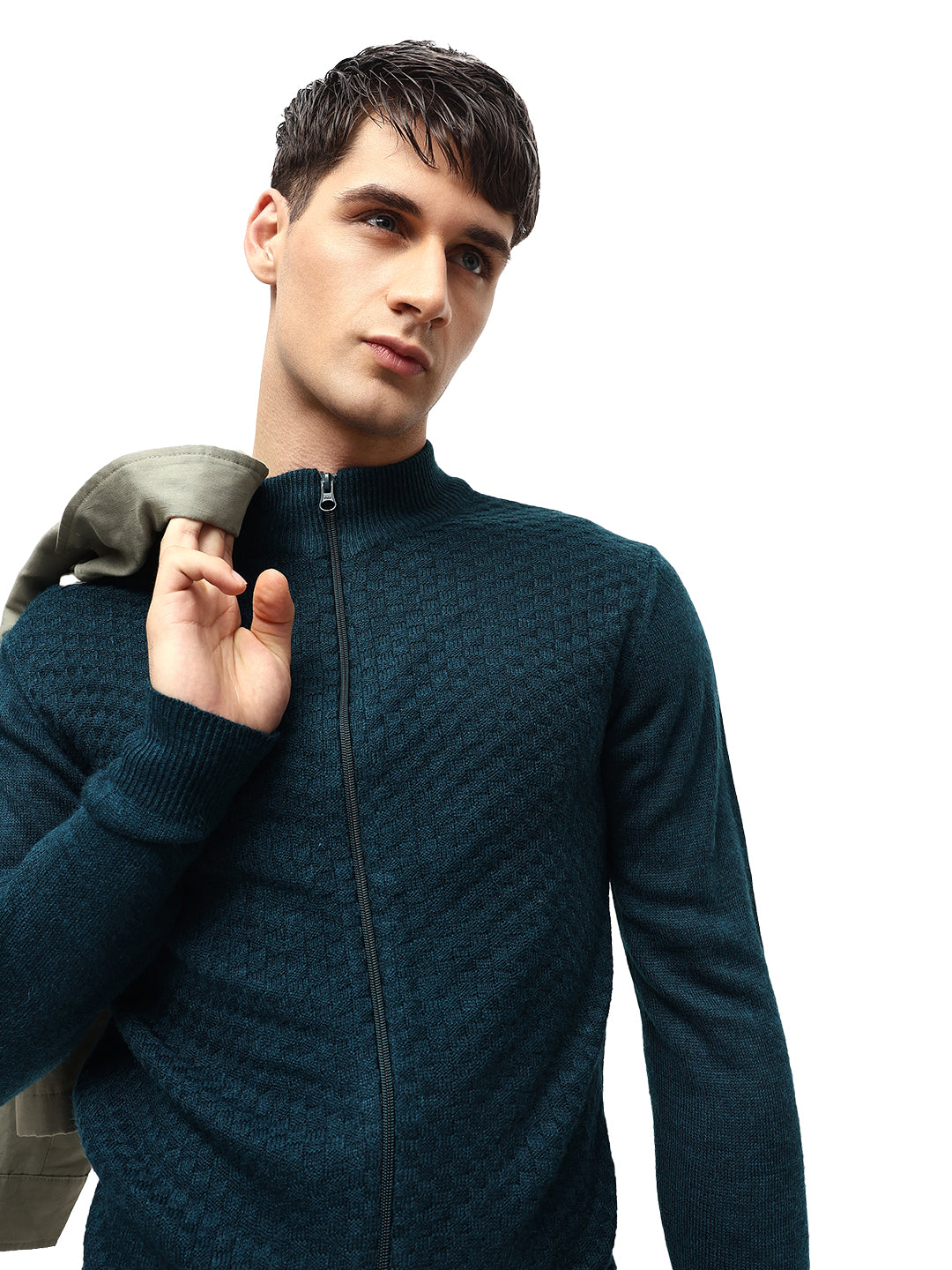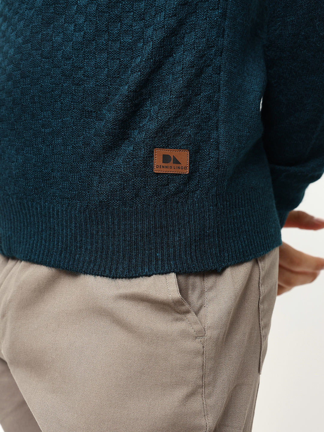 Men's Teal Mock Neck Full Sleeves Slim Fit Pullover Sweater