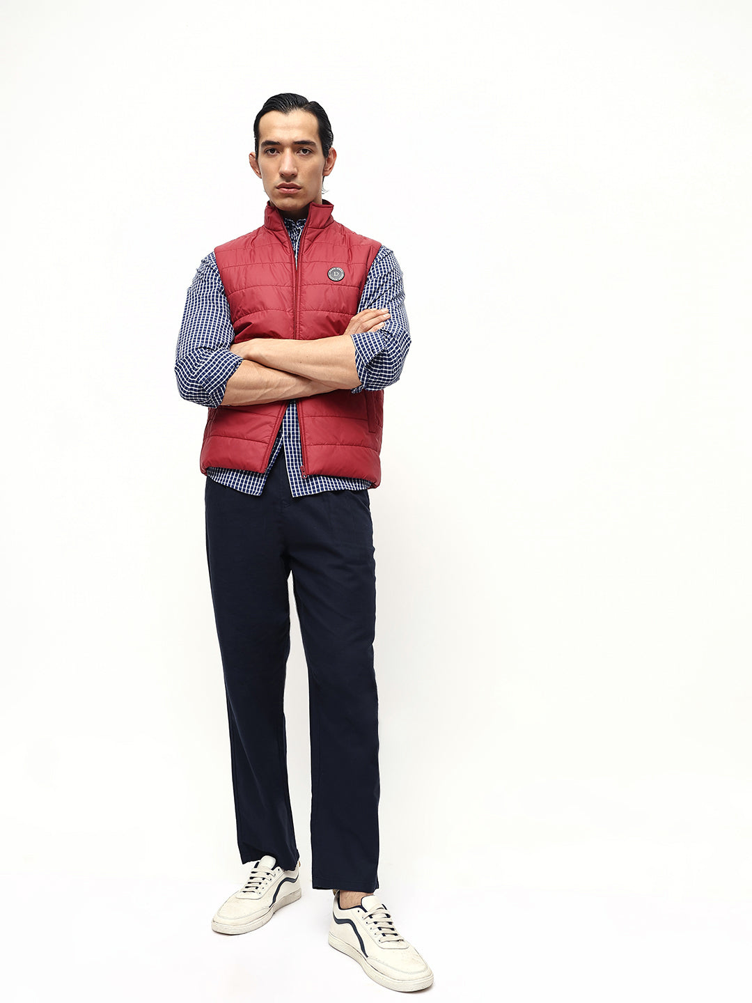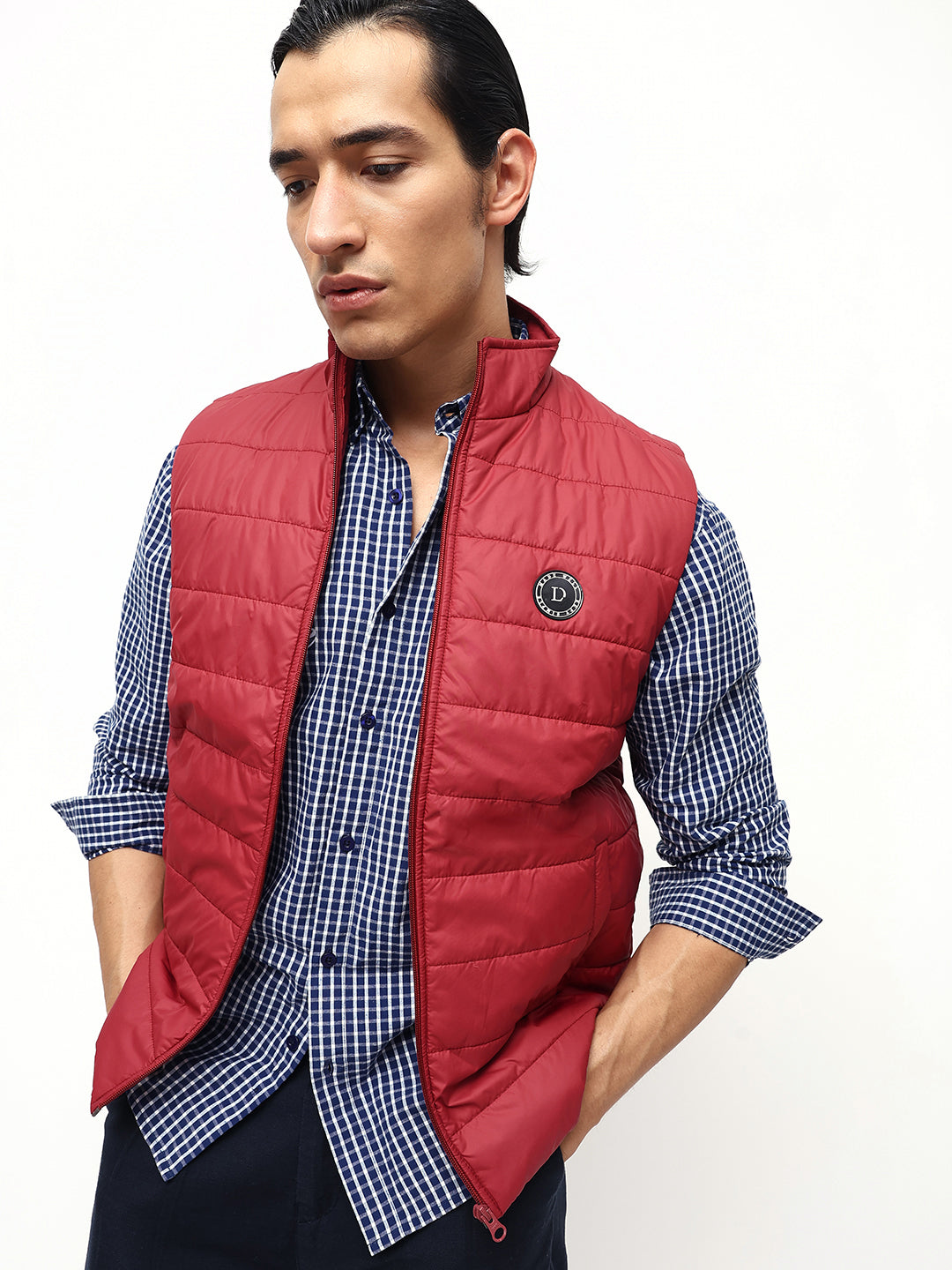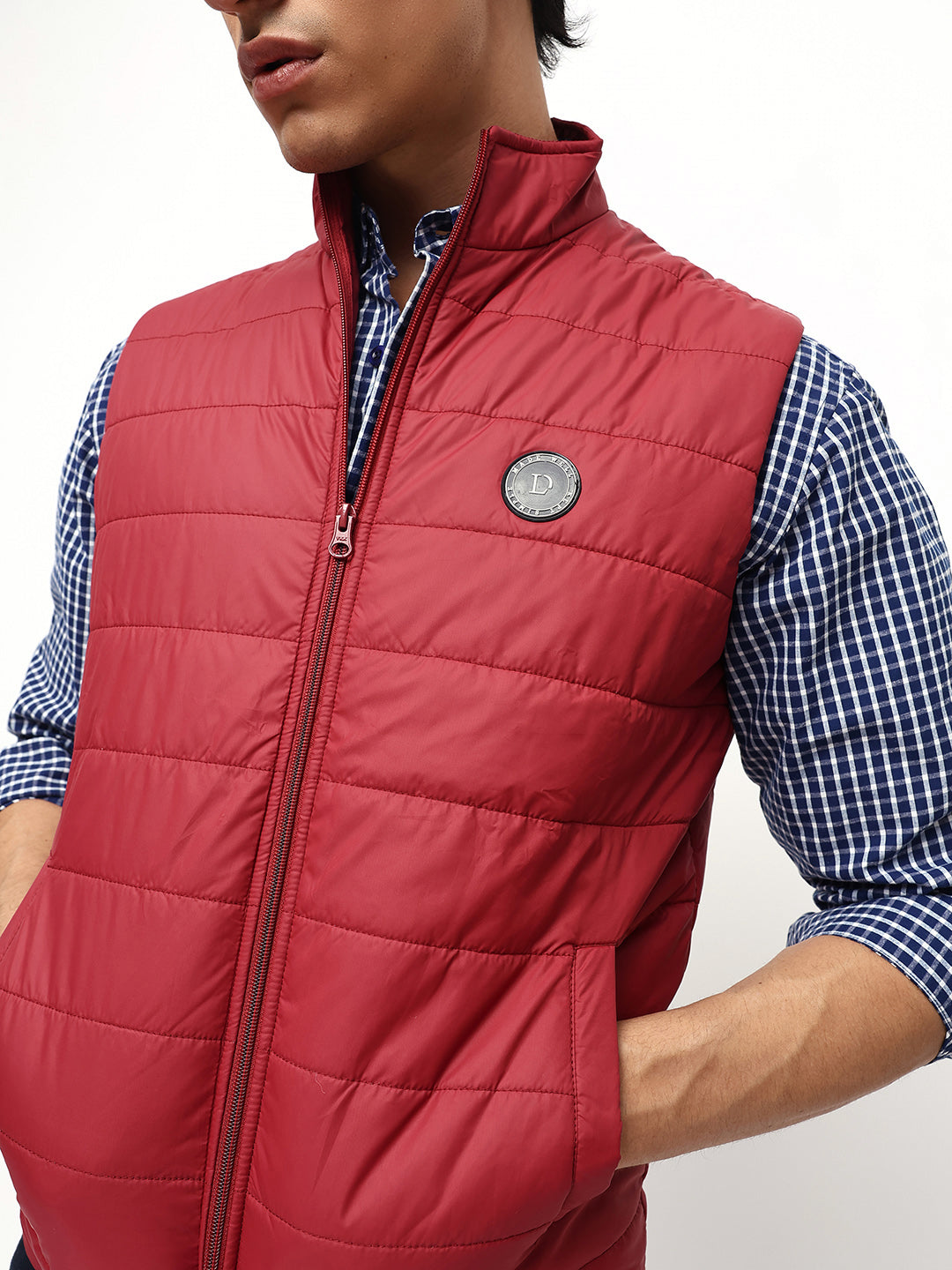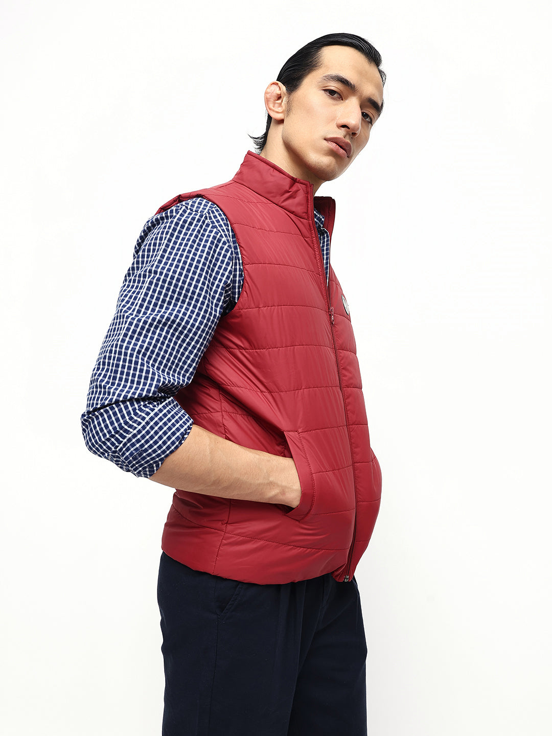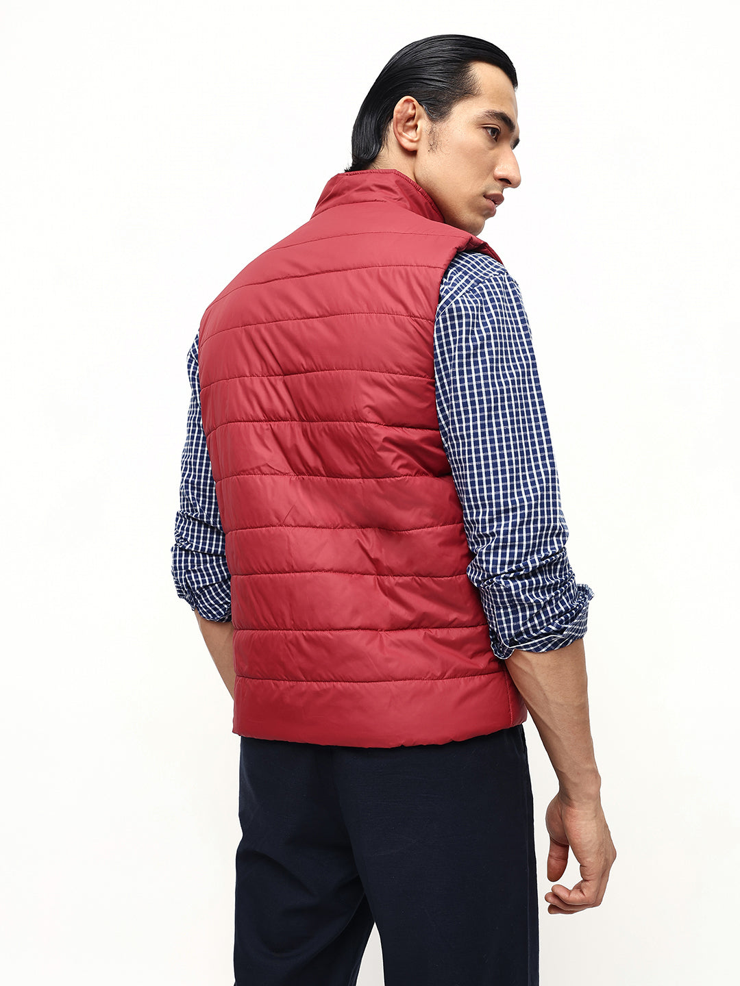 Men's High Neck Regular Fit Solid Quilted Barley Red Gilet Jacket