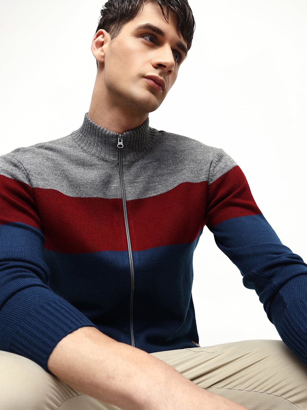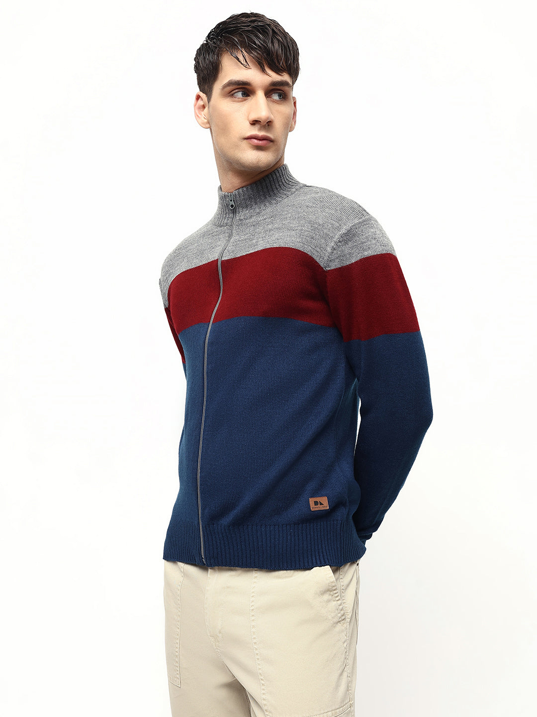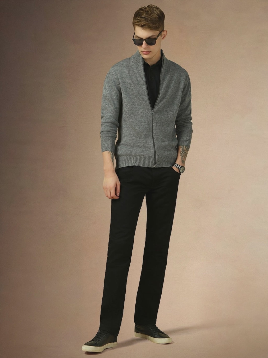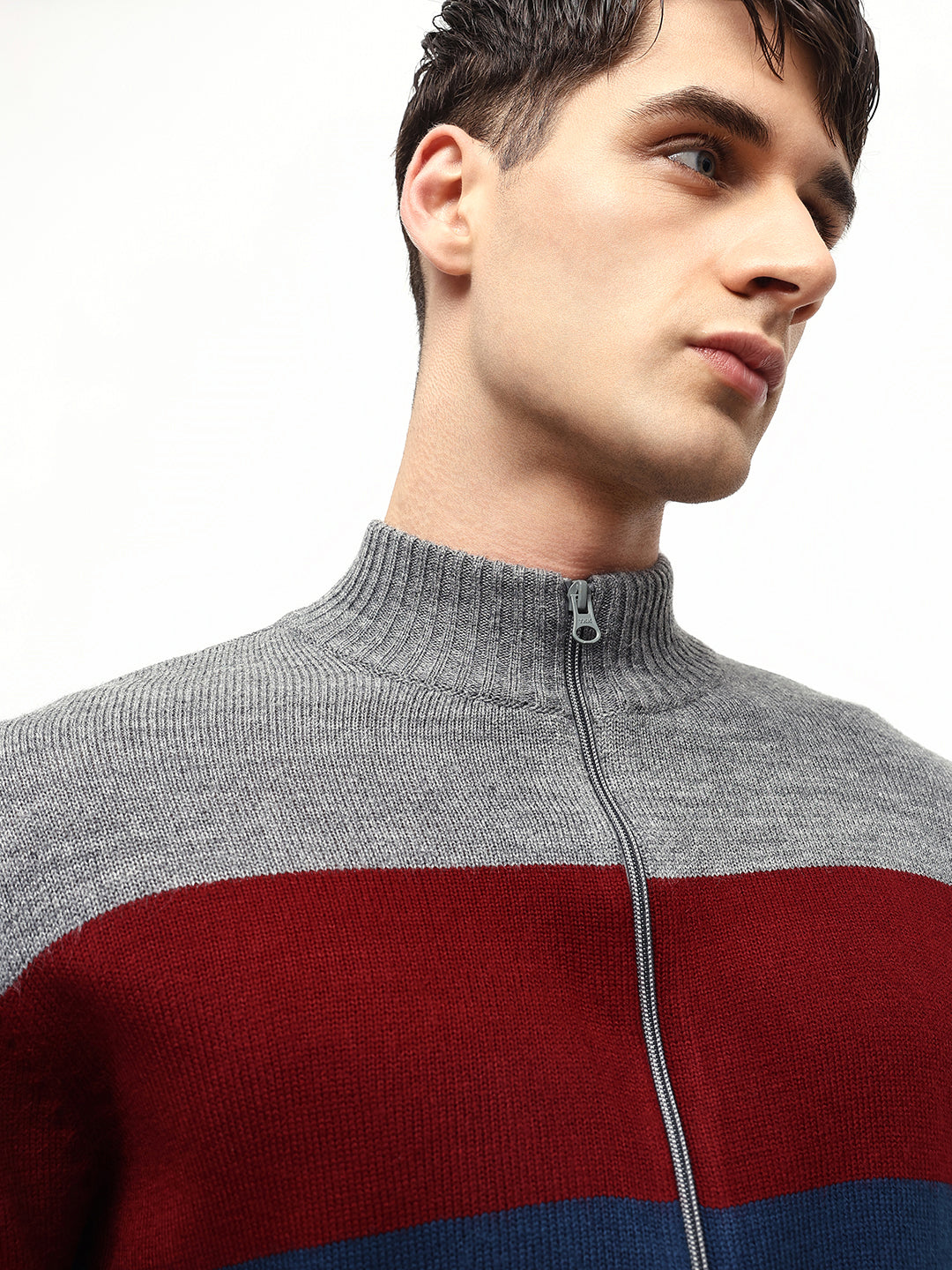 Men's Grey Mock Neck Full Sleeves Slim Fit Front-Open Sweater