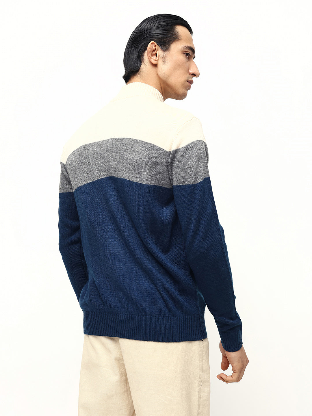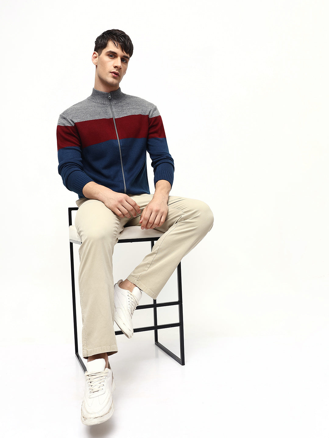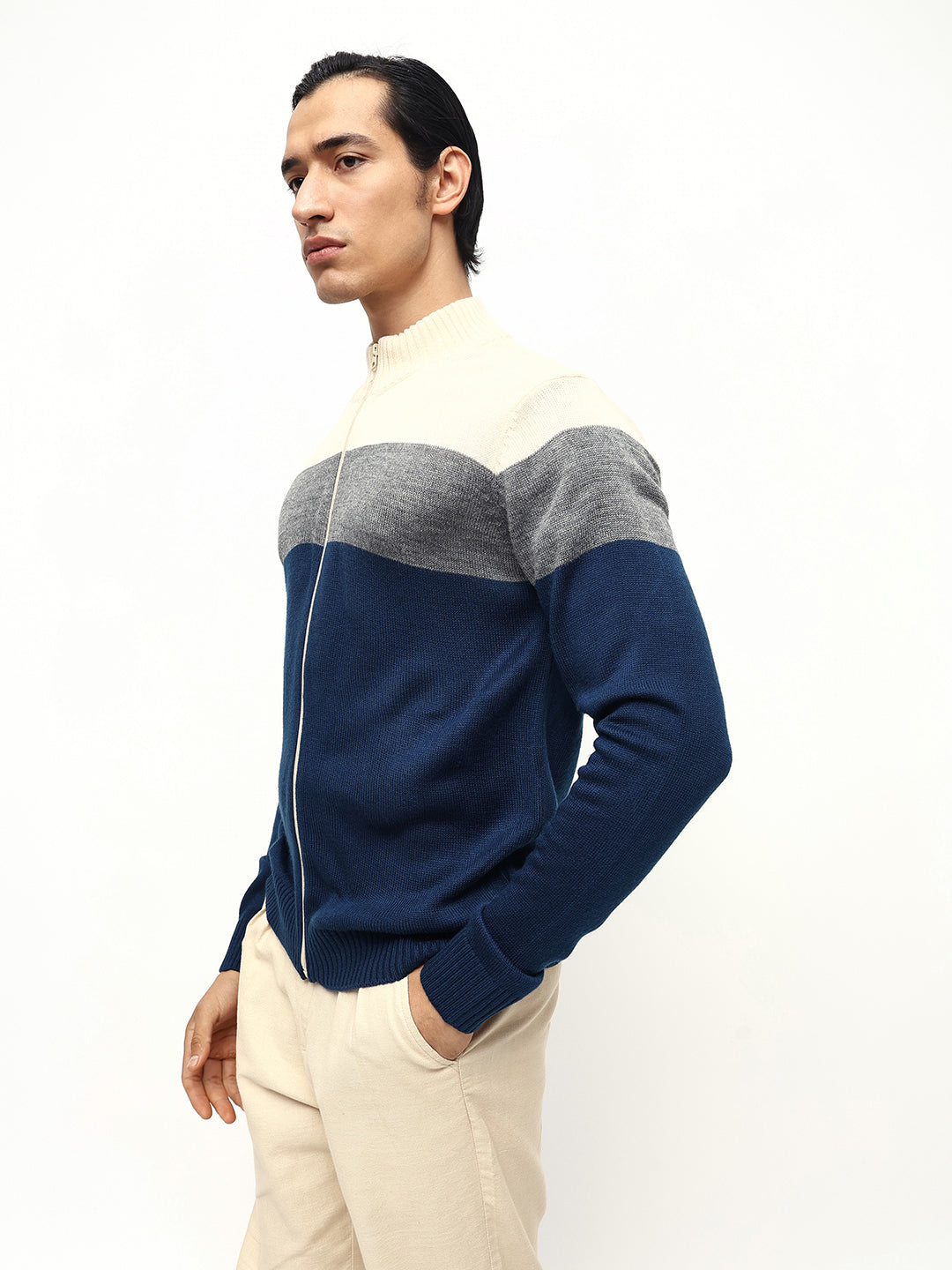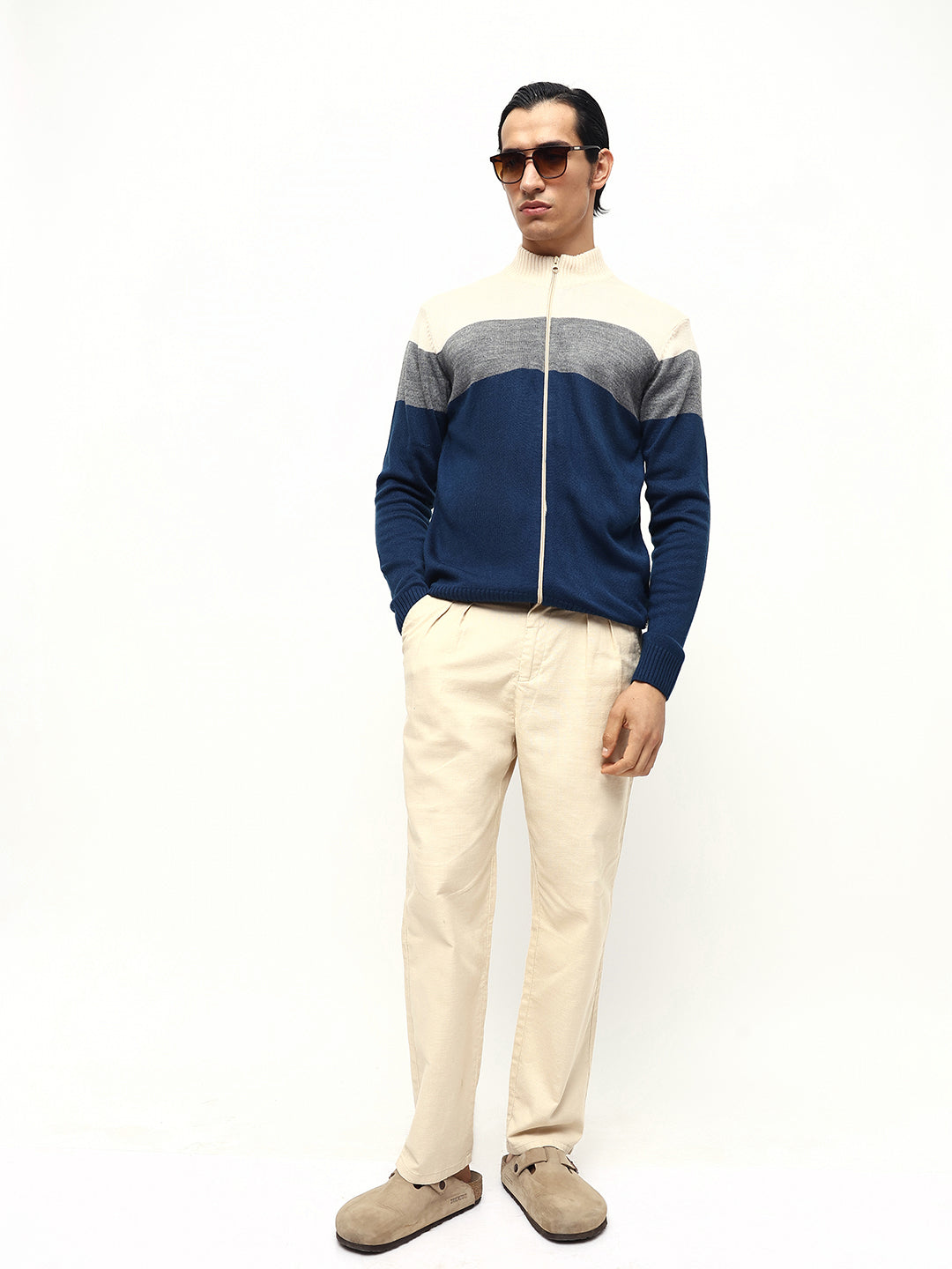Men's Off White Mock Neck Full Sleeves Slim Fit Front-Open Sweater