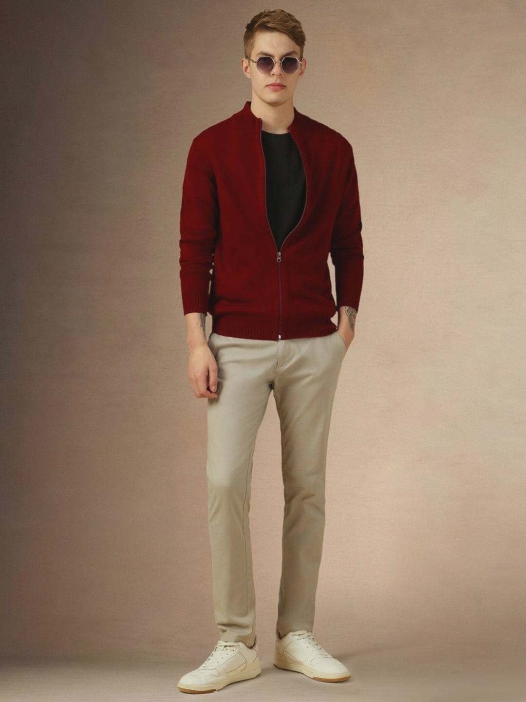 Men's Red Mock Neck Full Sleeves Slim Fit Pullover Sweater