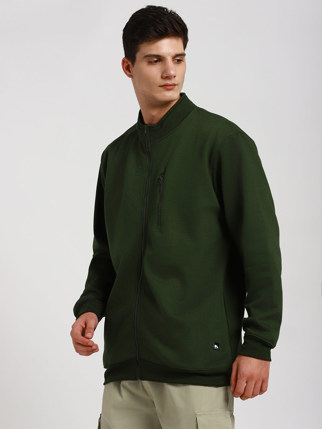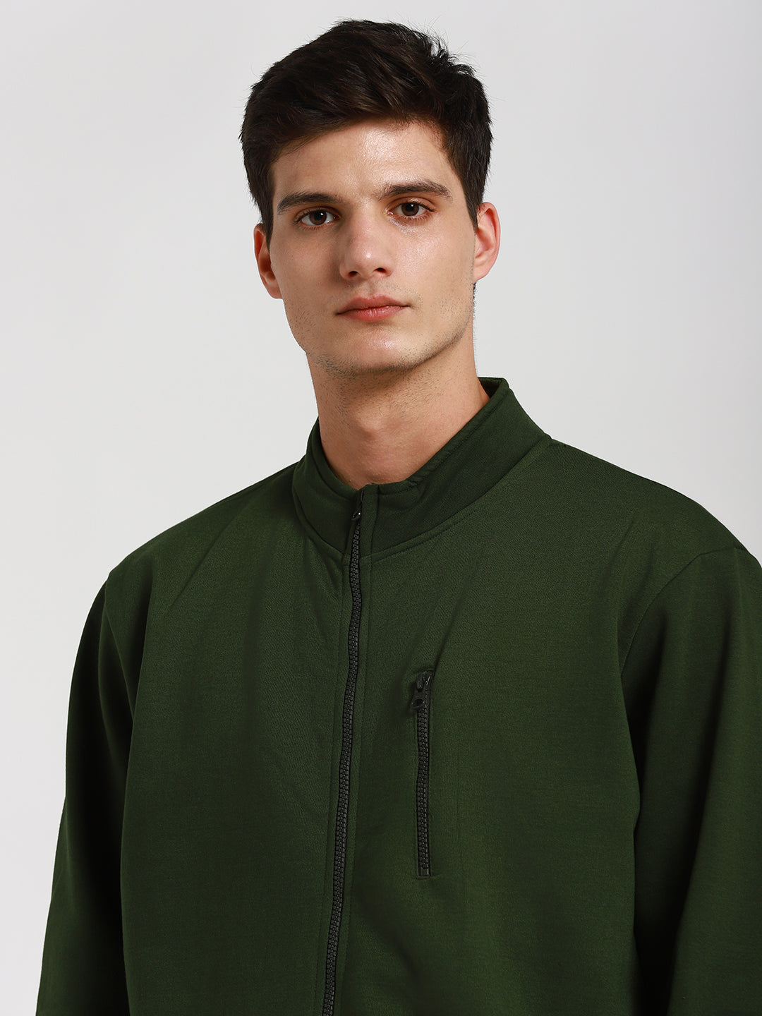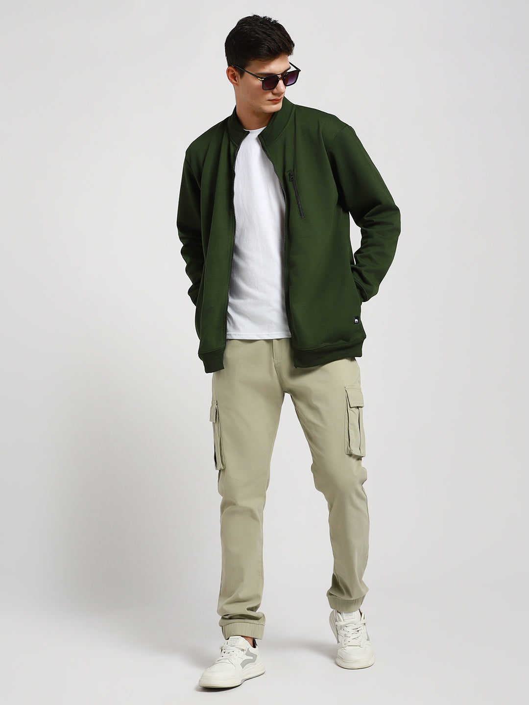Men's Rib Collar Regular Fit Solid Green Bomber Jacket