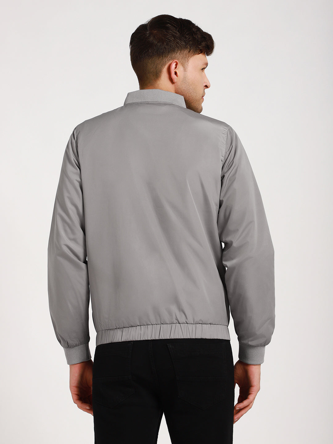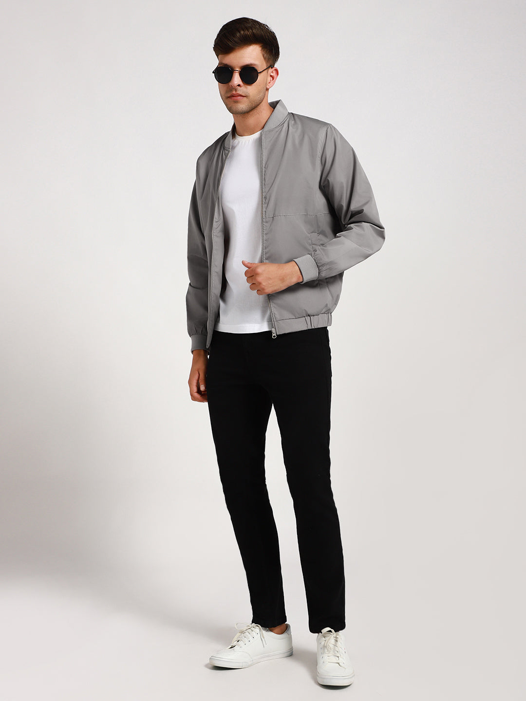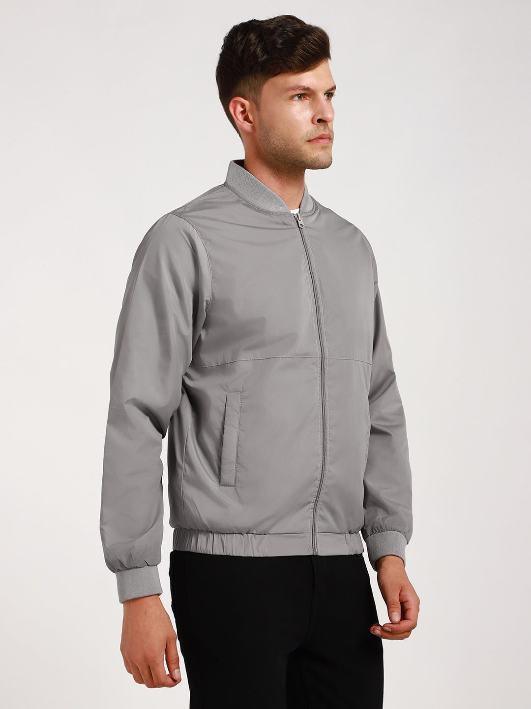 Men's Rib Collar Regular Fit Solid Grey Bomber Jacket
