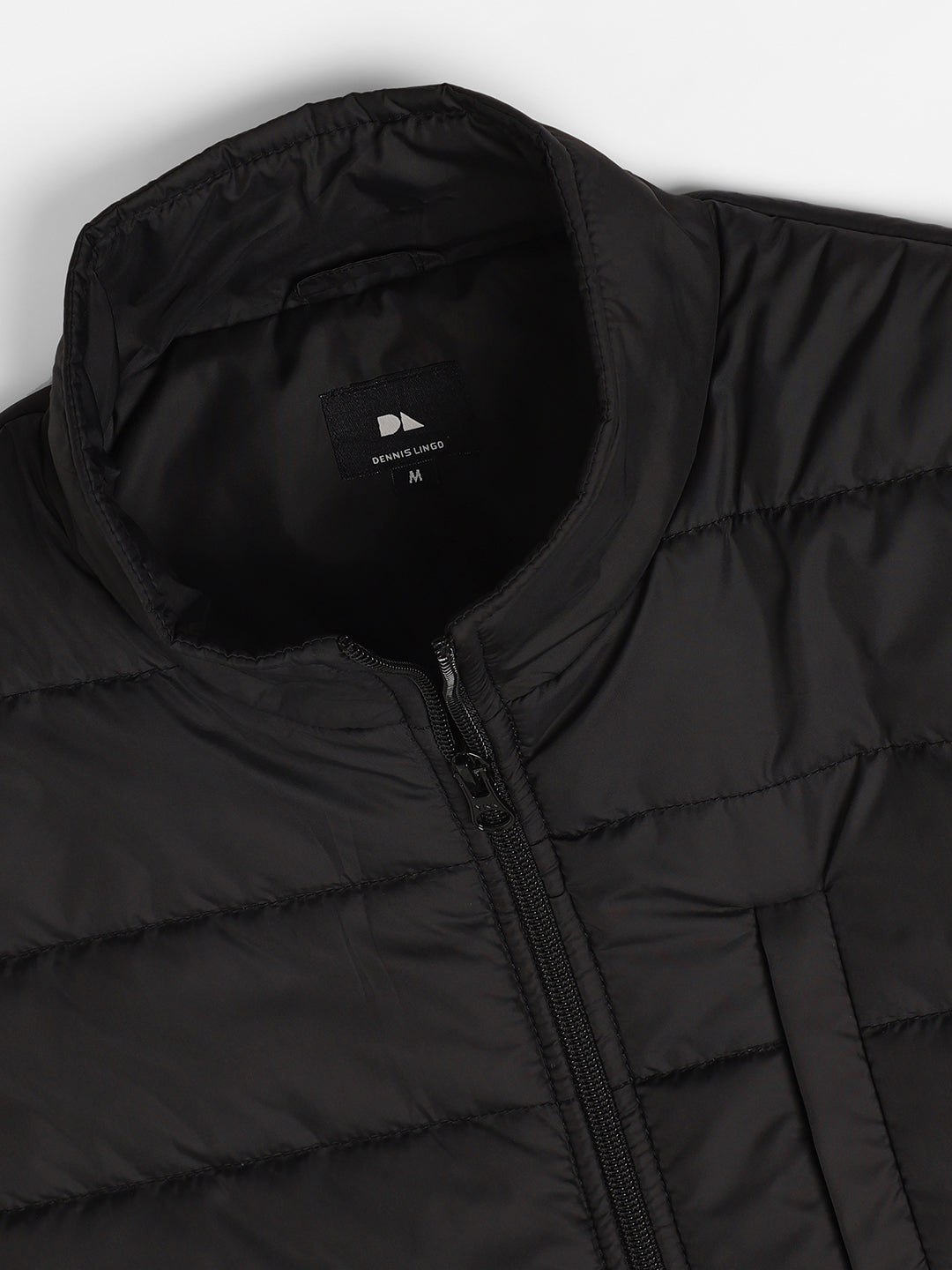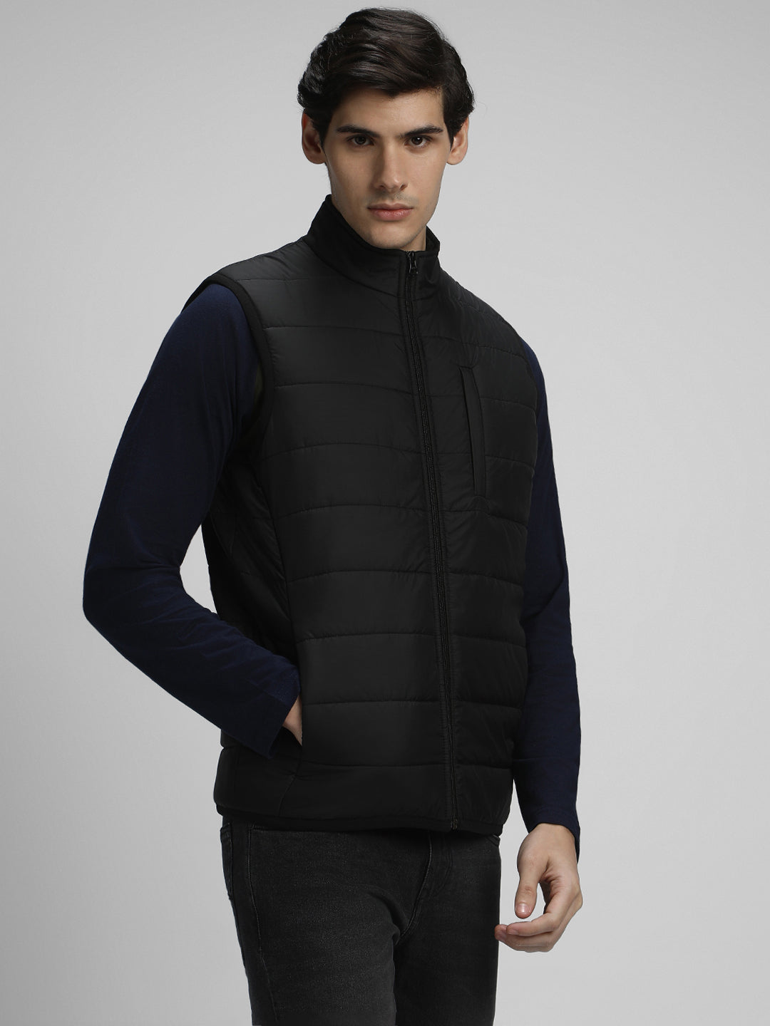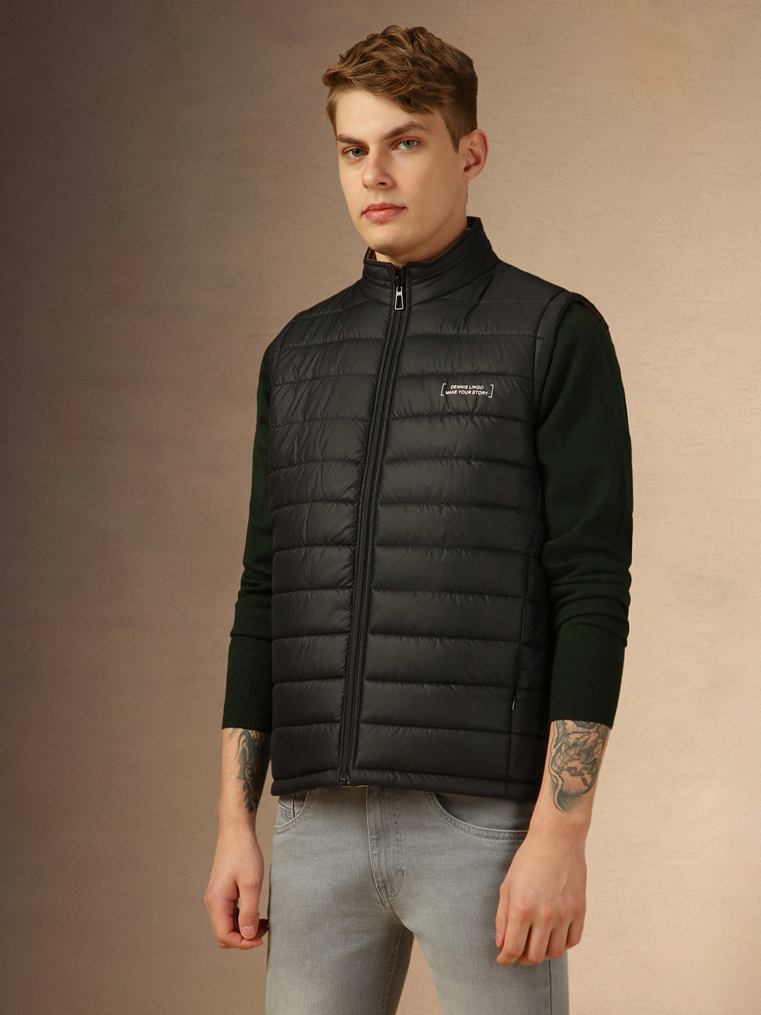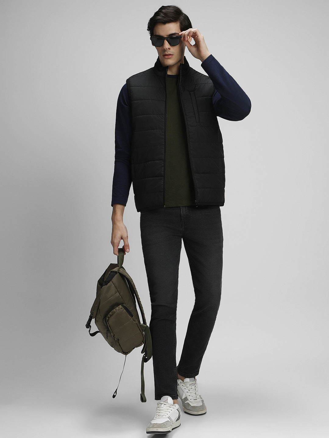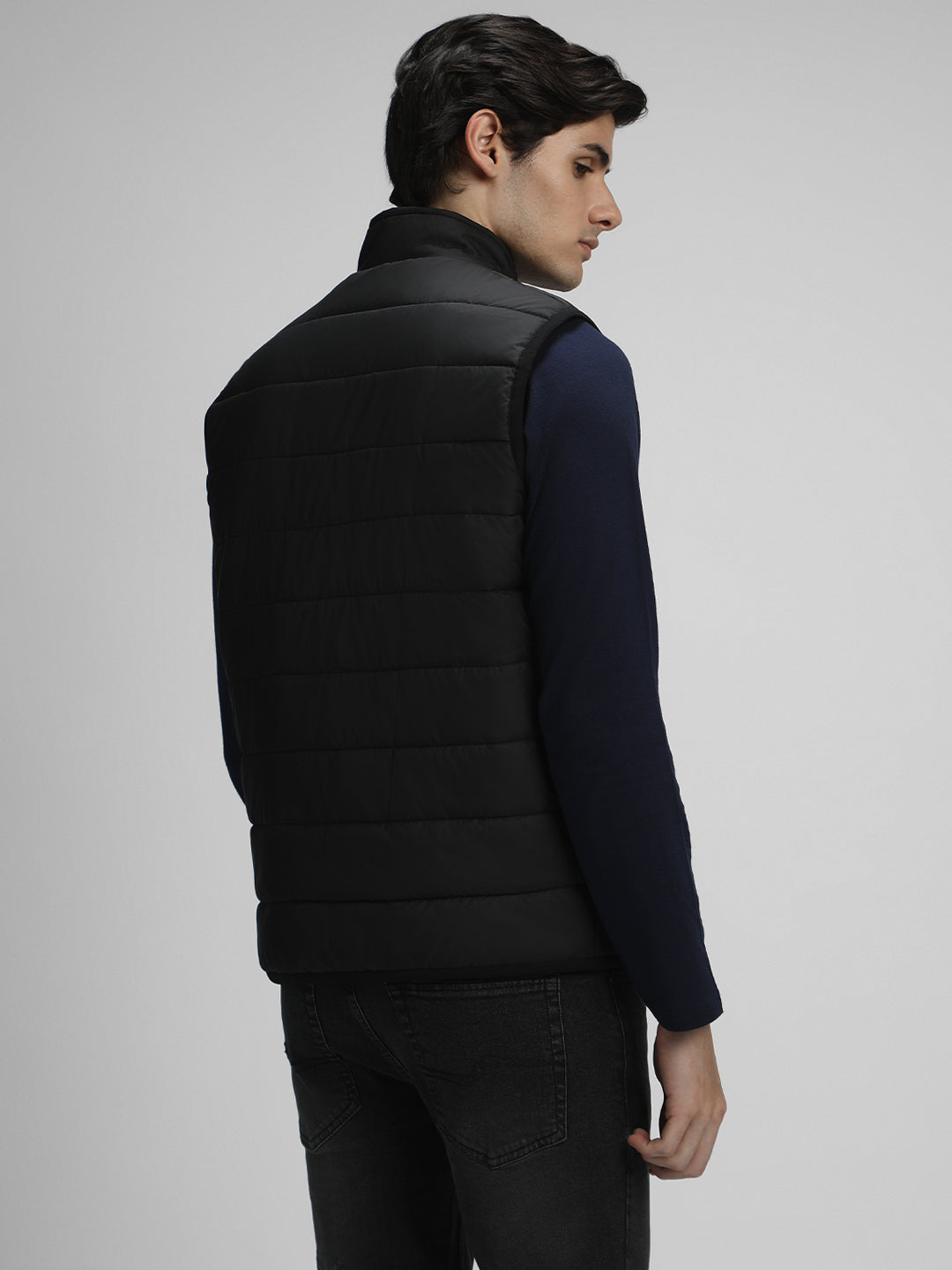 Men's Mock Collar Regular Fit Solid Sleeveless Quilted Black Jacket