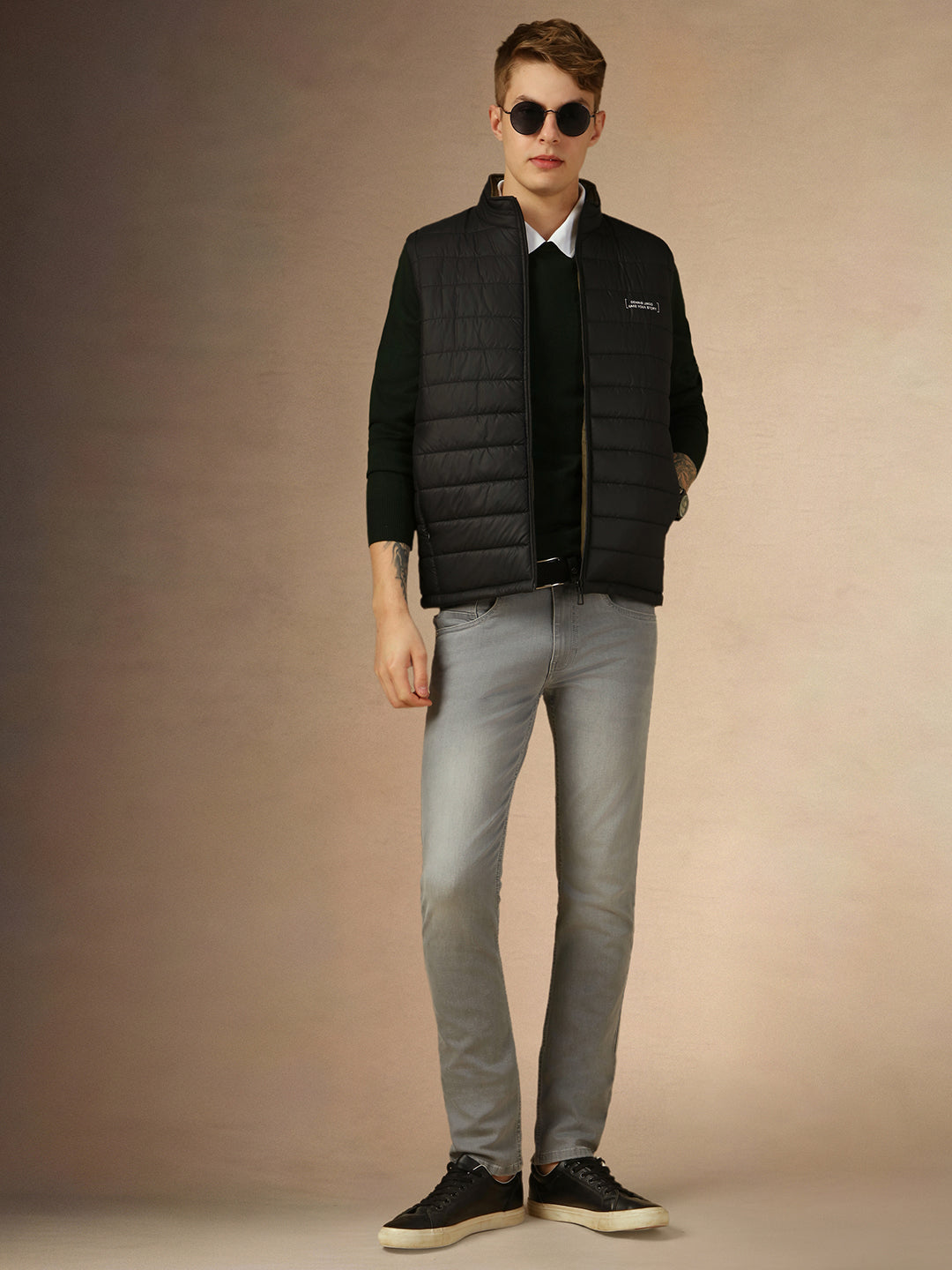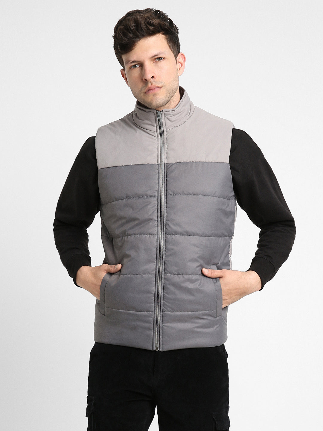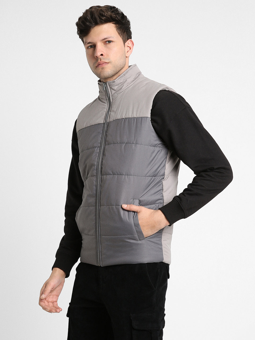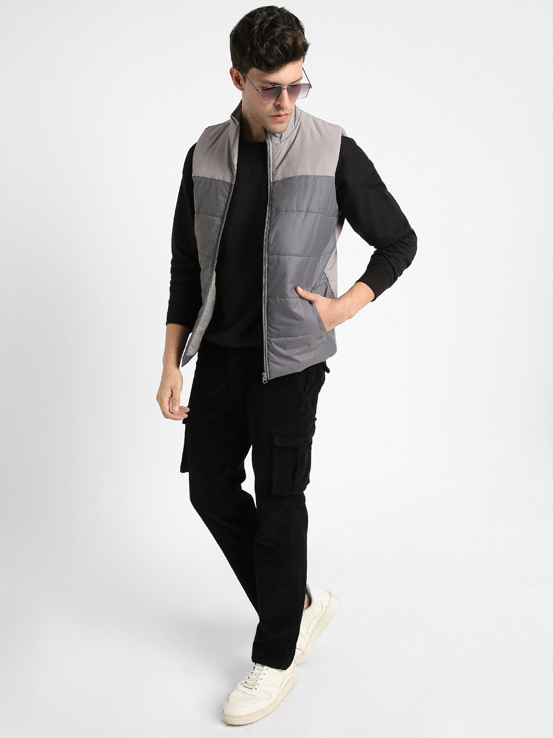 Men's Light Grey Colourblocked Mock Neck Sleeveless Gilet Jacket