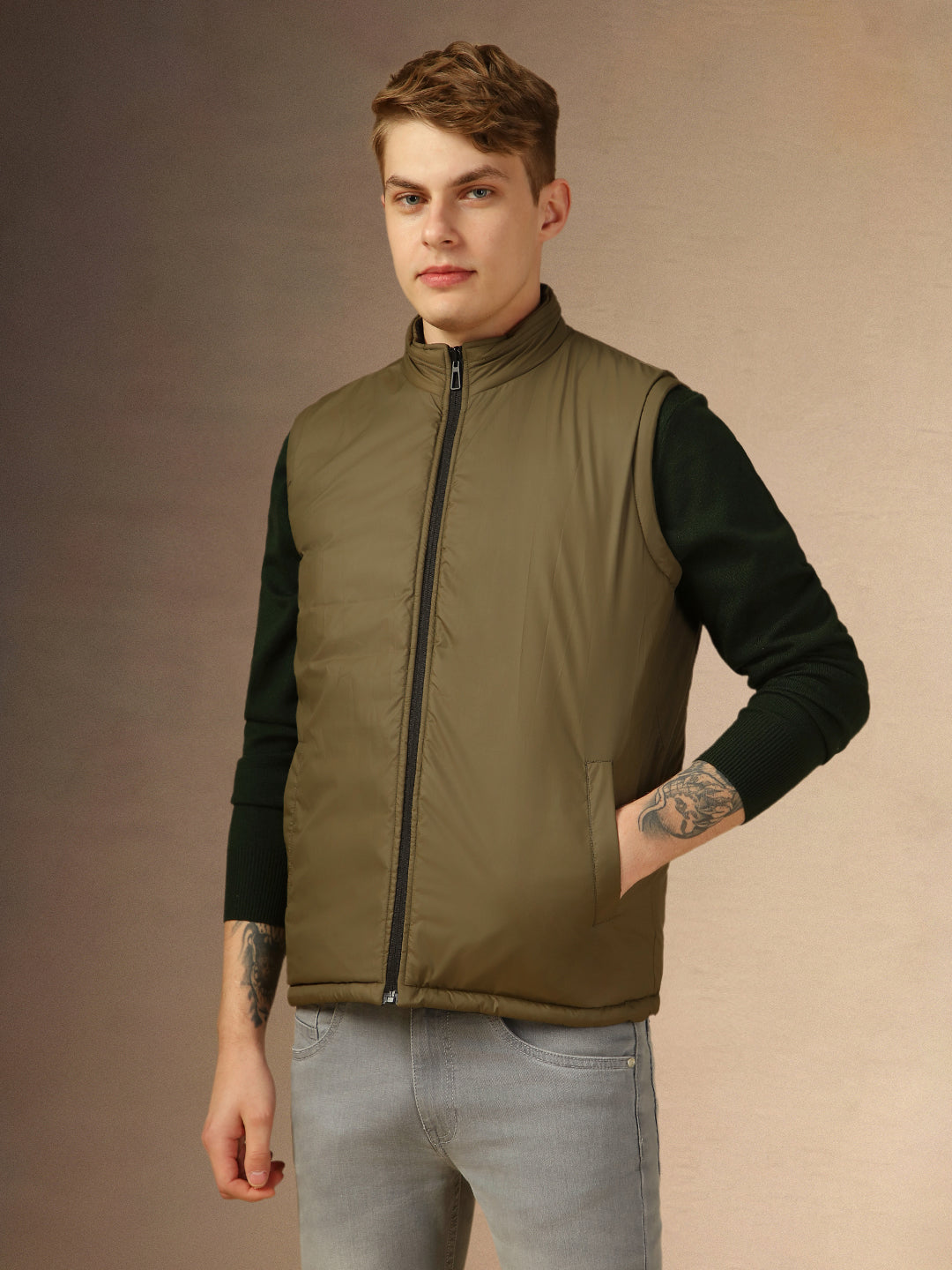 Men's Khaki Mock Neck Regular Fit Colorblocked Gilet Jacket