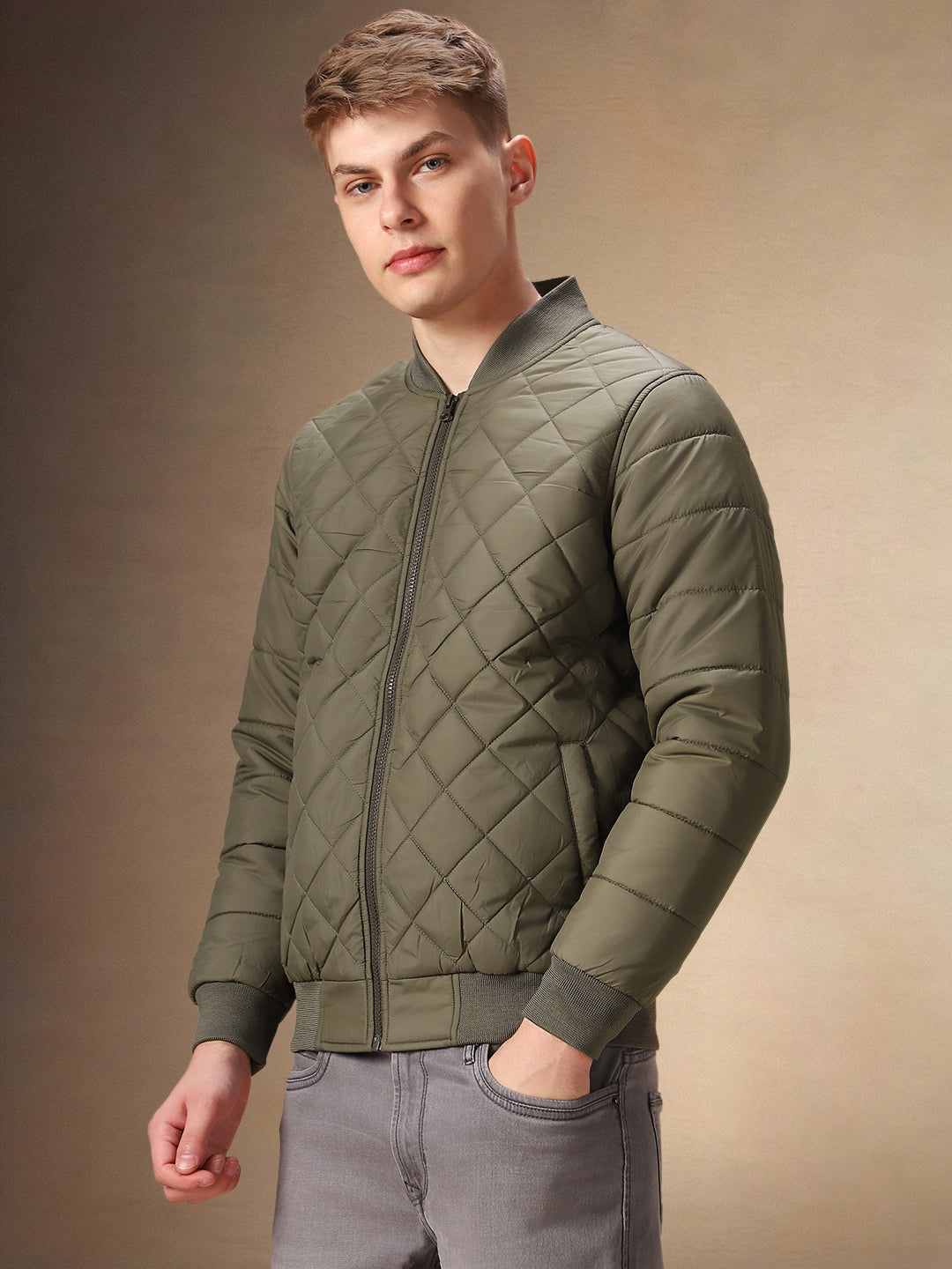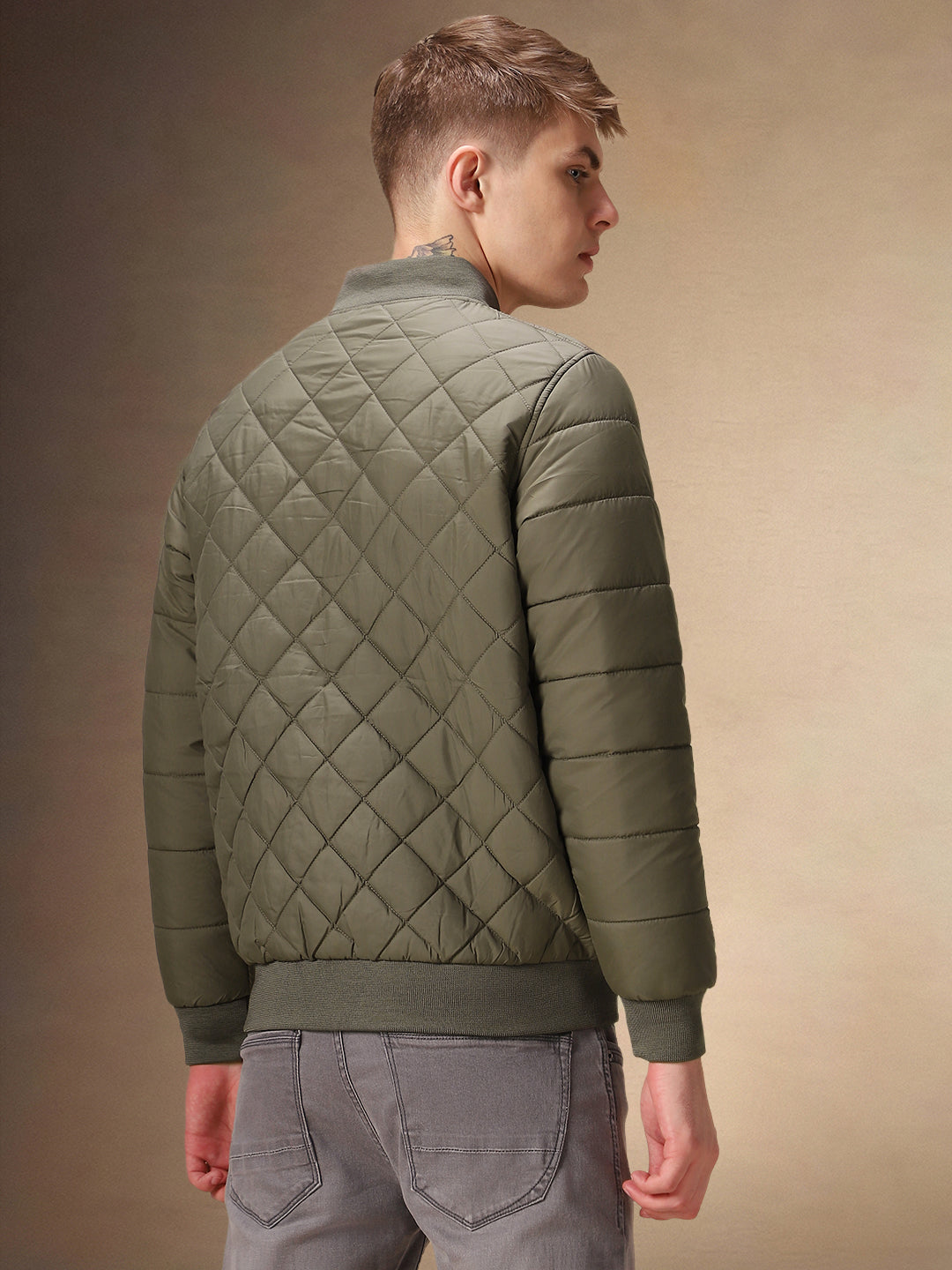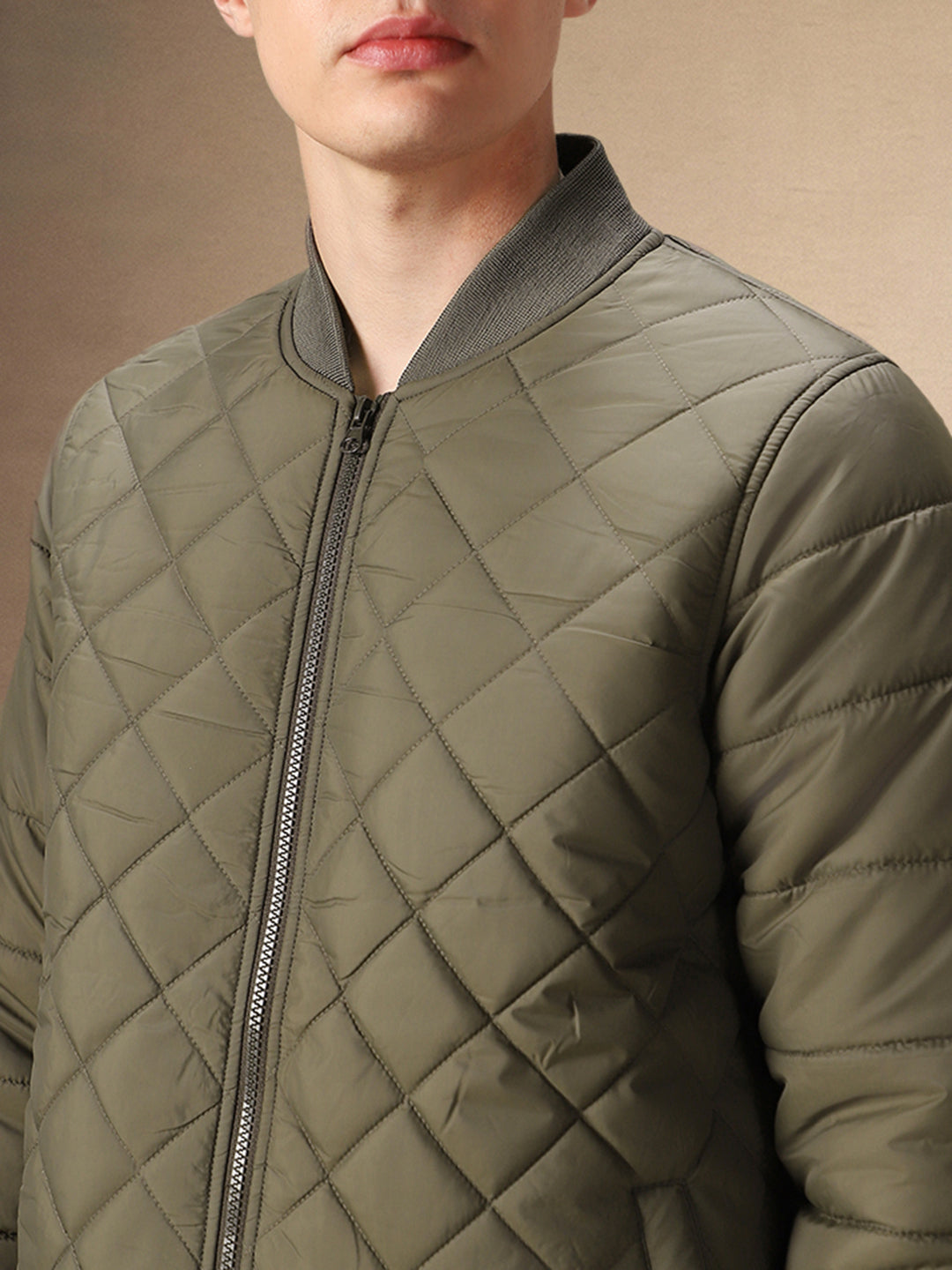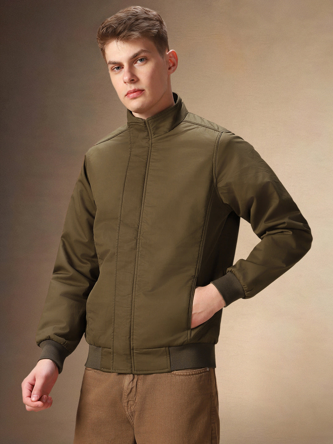 Men's Solid Olive Quilted Rib Collar Full Sleeves Bomber Jacket