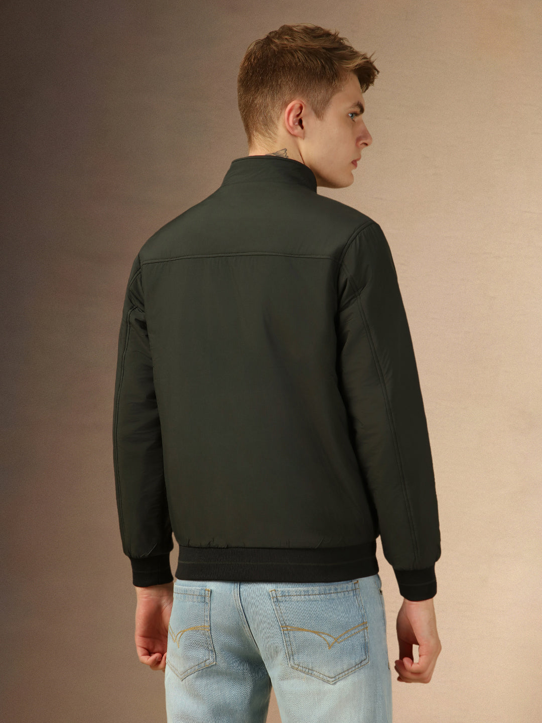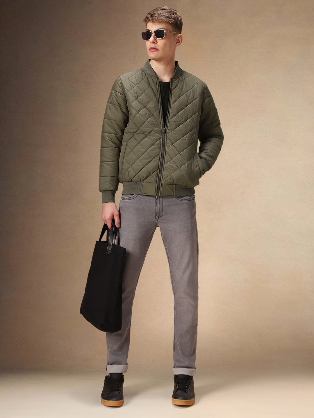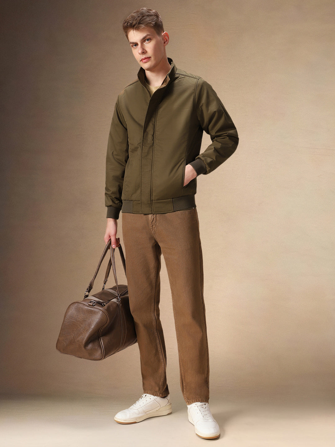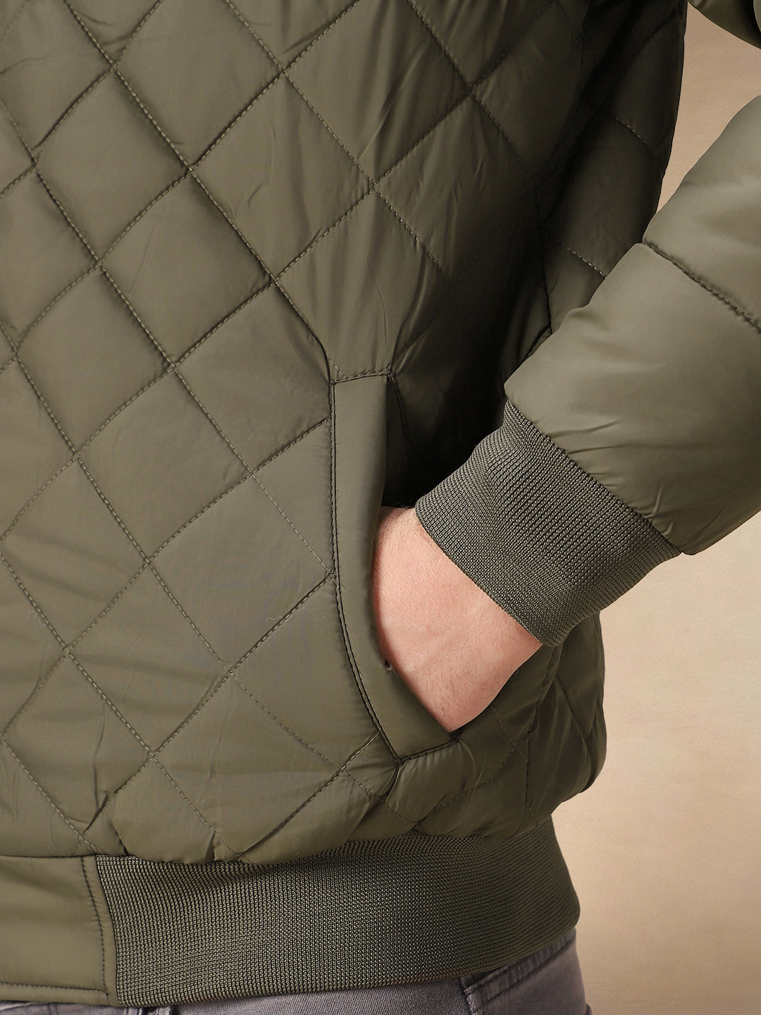 Men's Solid Olive Quilted Rib Collar Full Sleeves Bomber Jacket