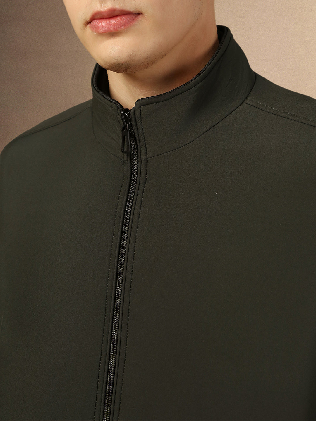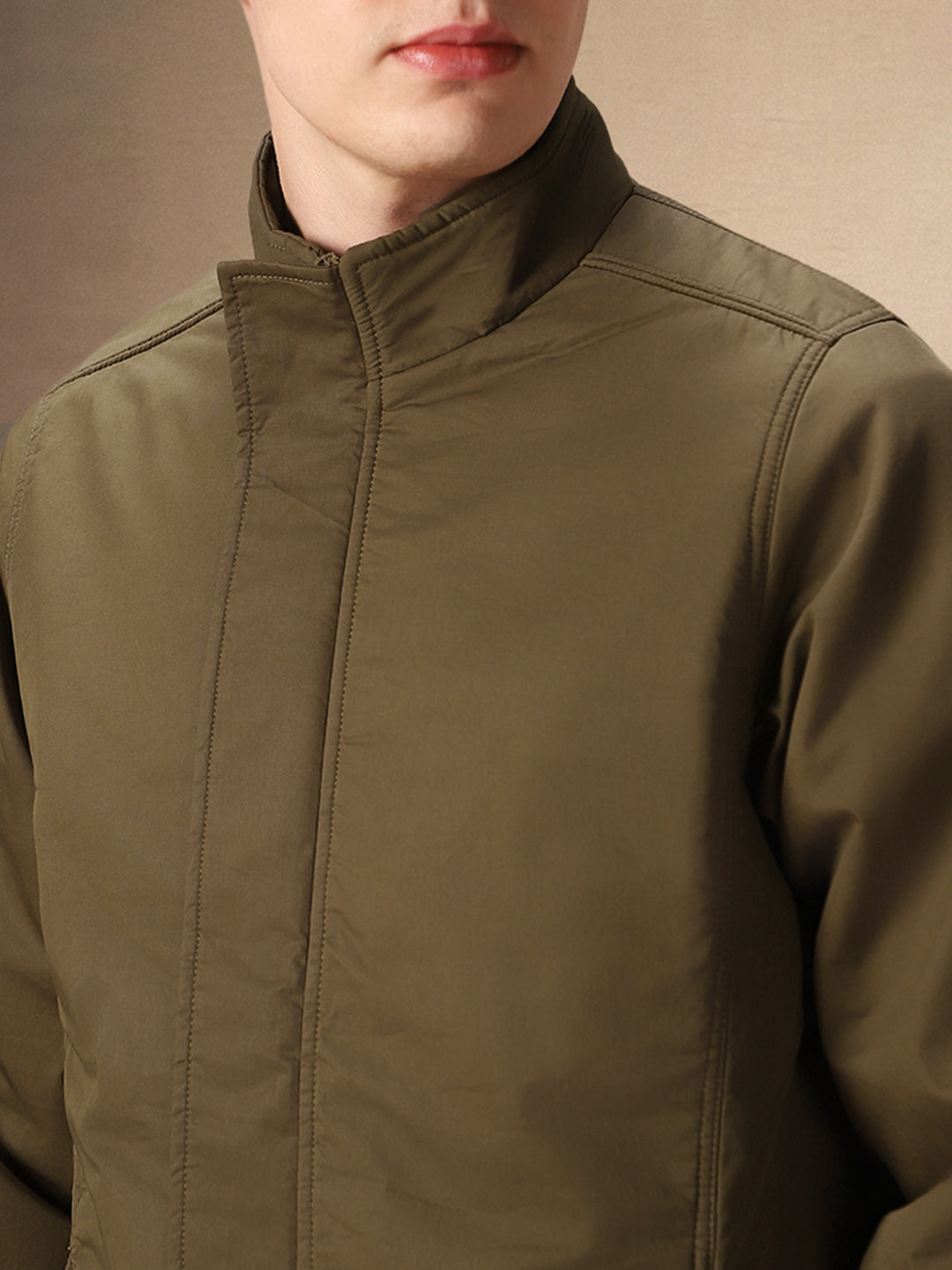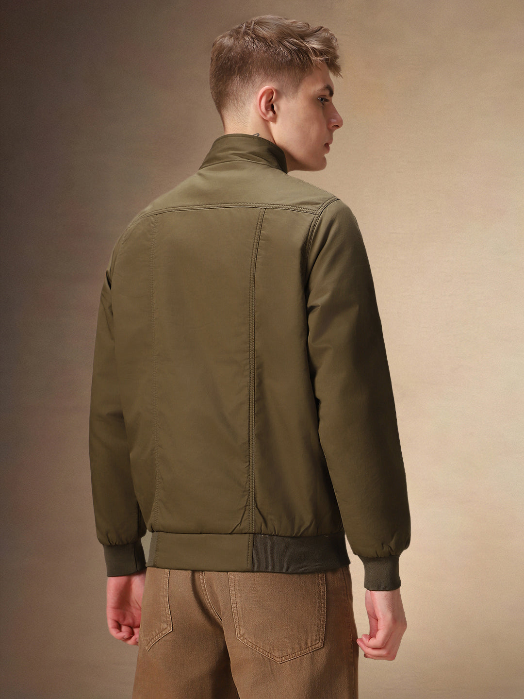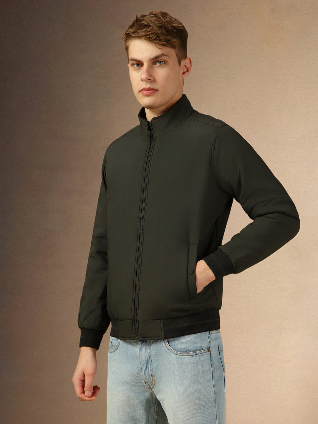 Men's Solid Olive Quilted Rib Collar Full Sleeves Bomber Jacket