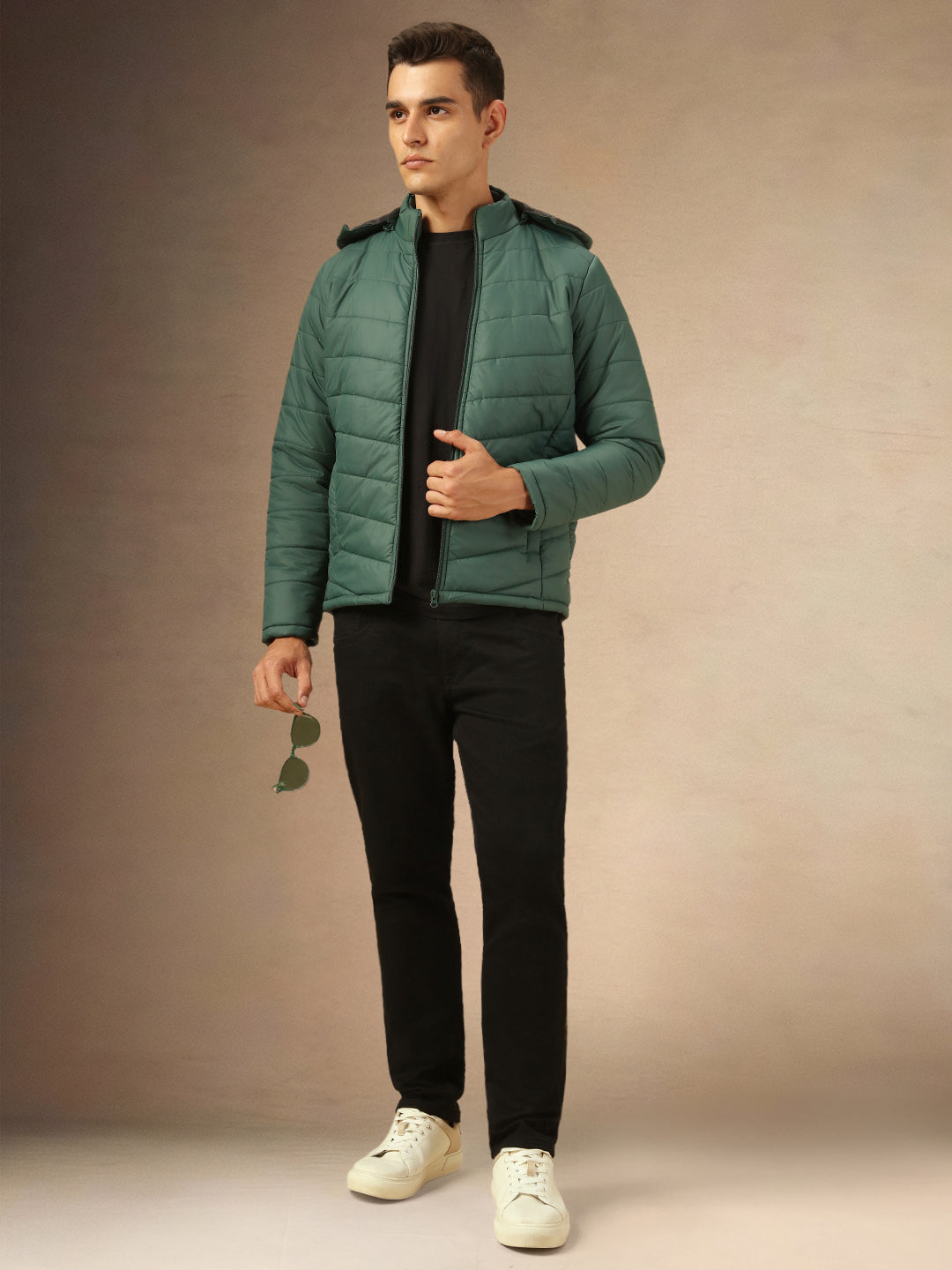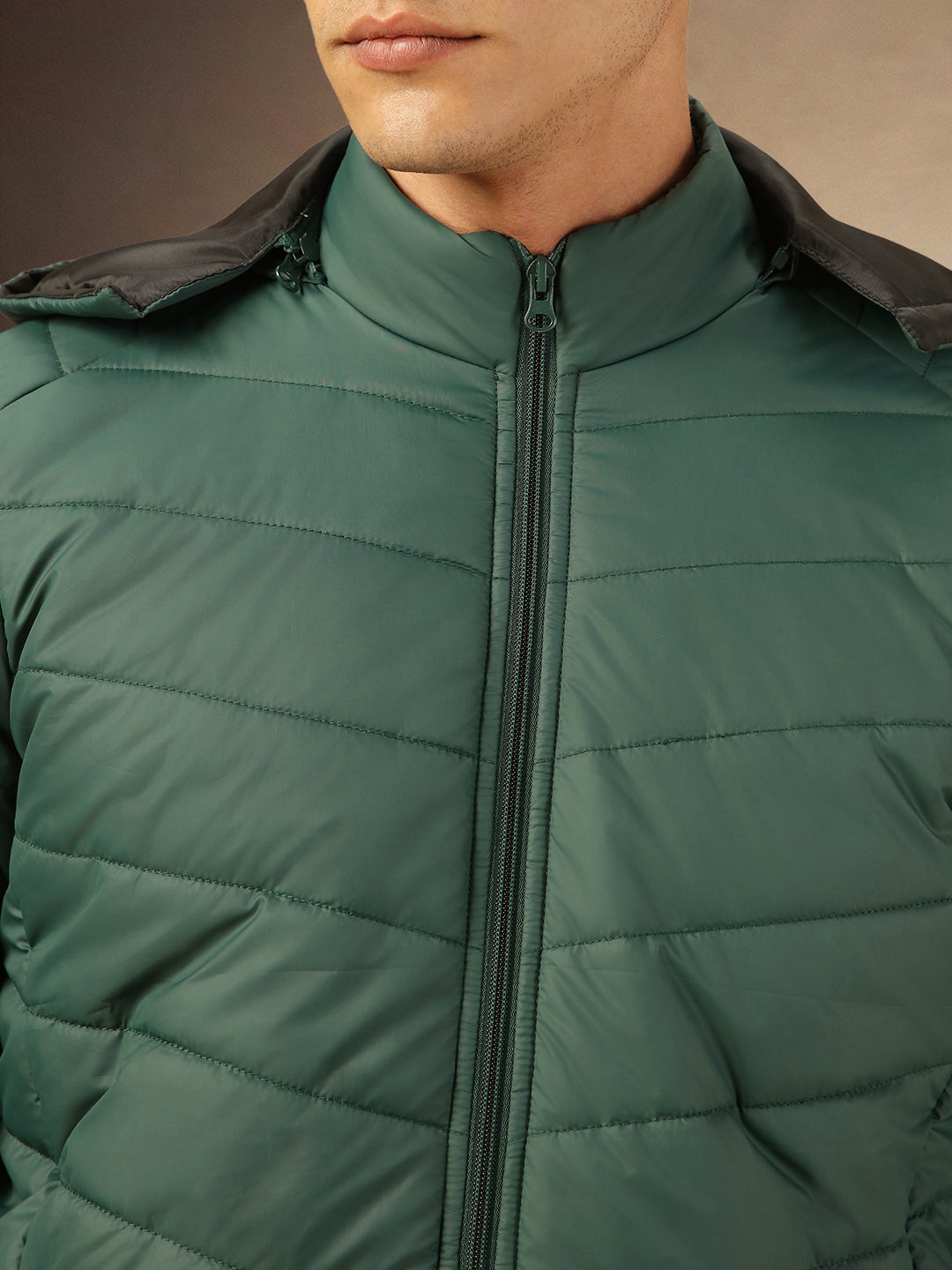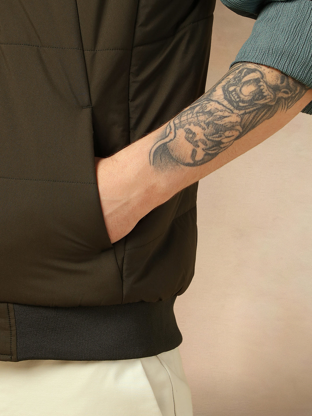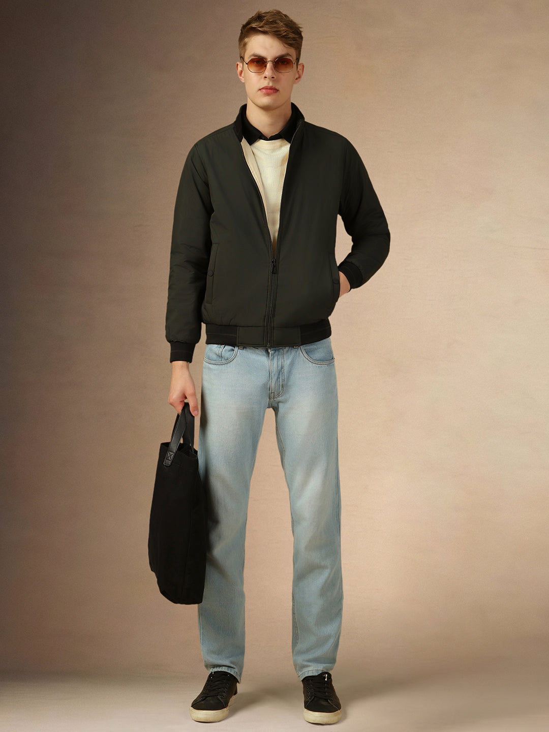 Men's Solid Olive Quilted Rib Collar Full Sleeves Bomber Jacket