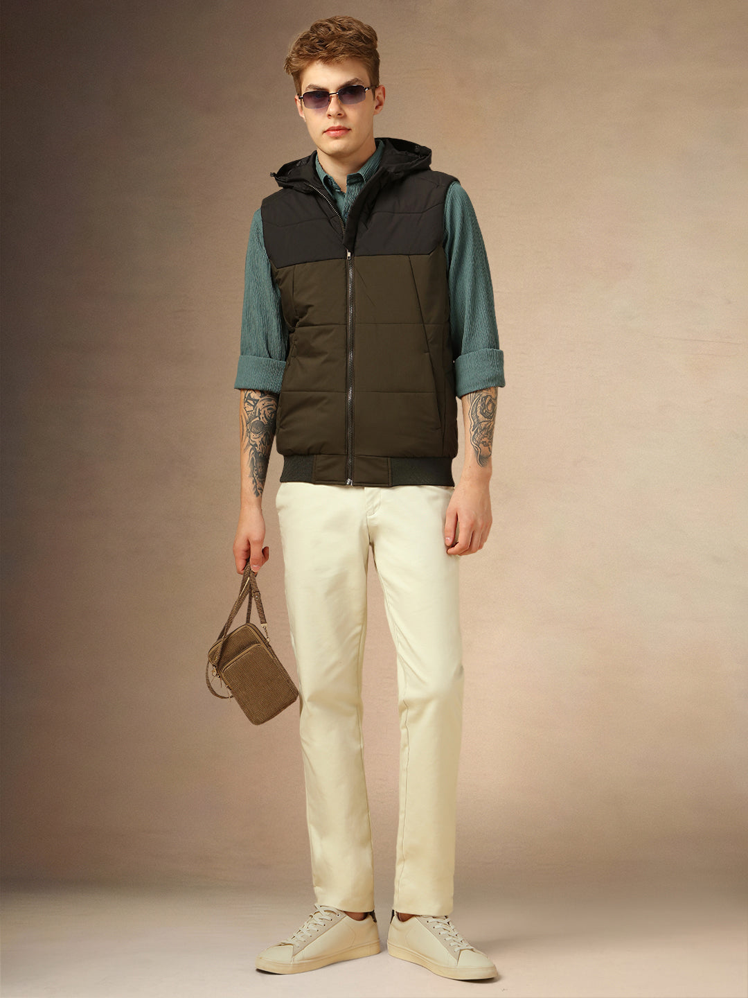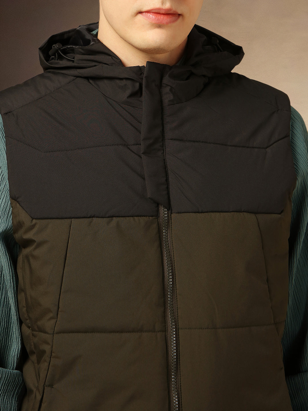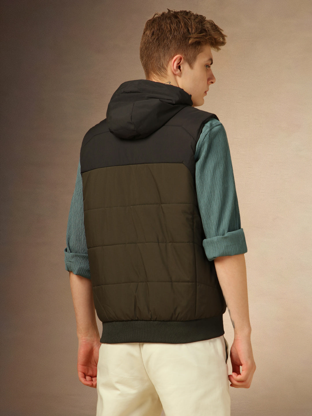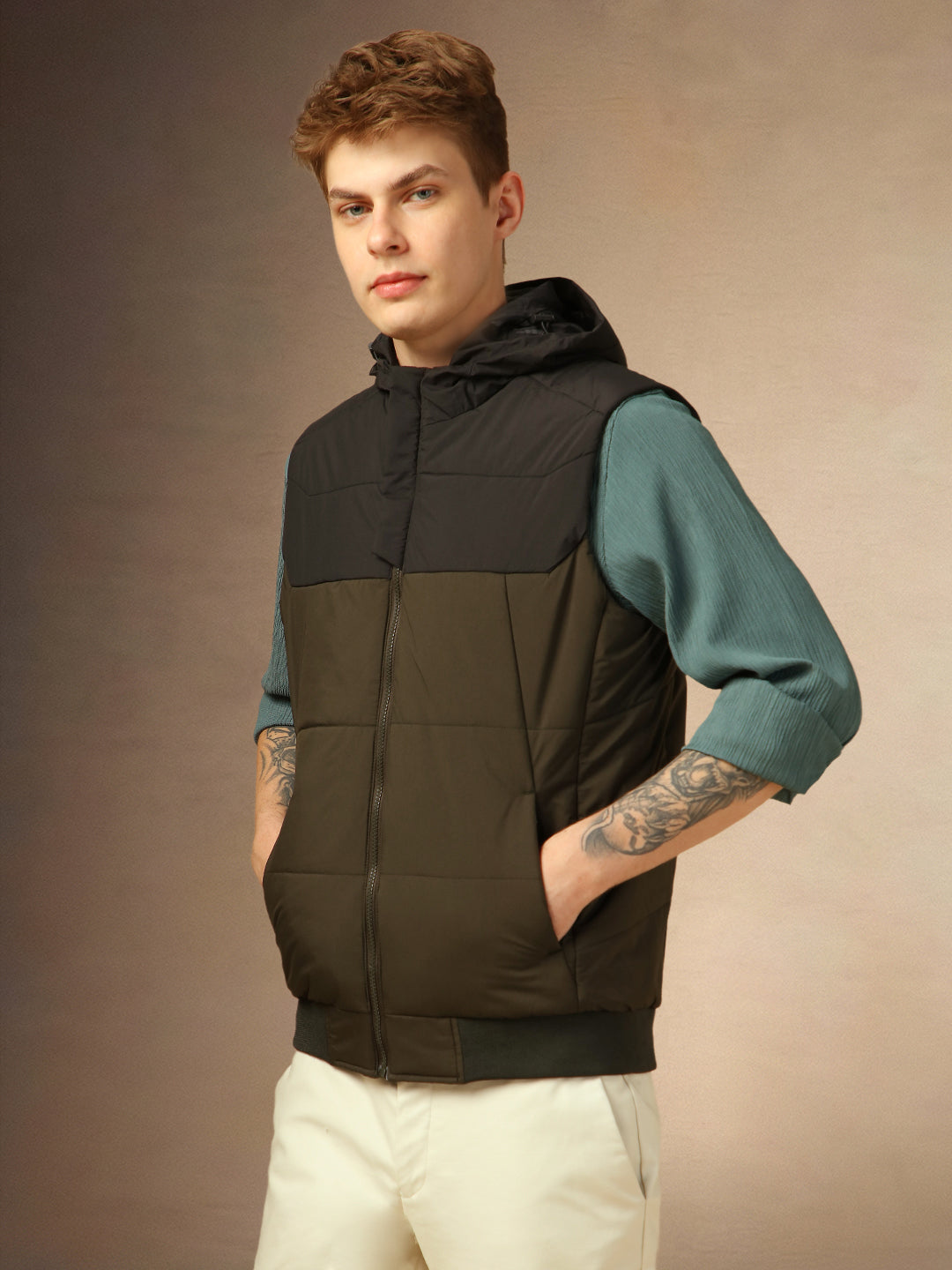 Men's Olive Colorblocked Hooded Sleeveless Jackets
