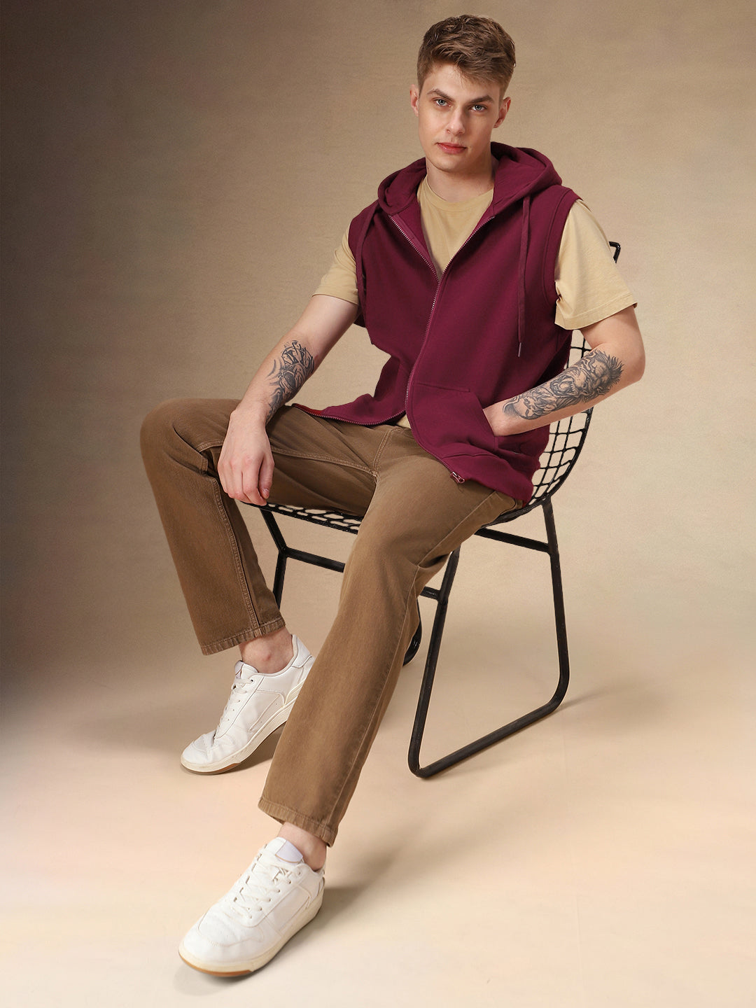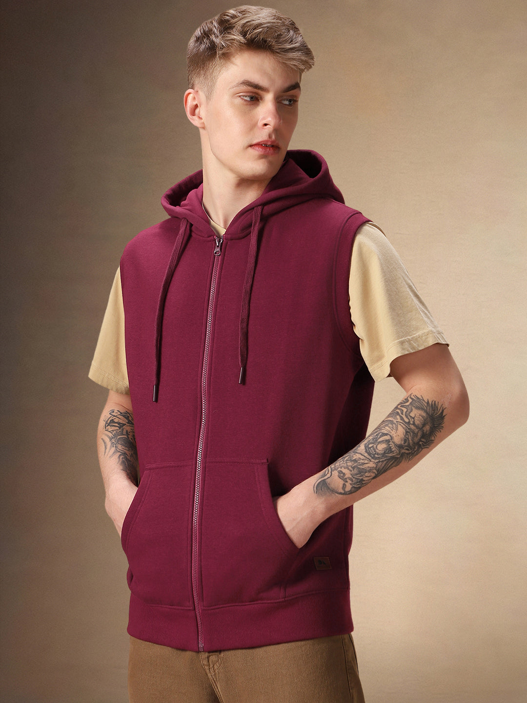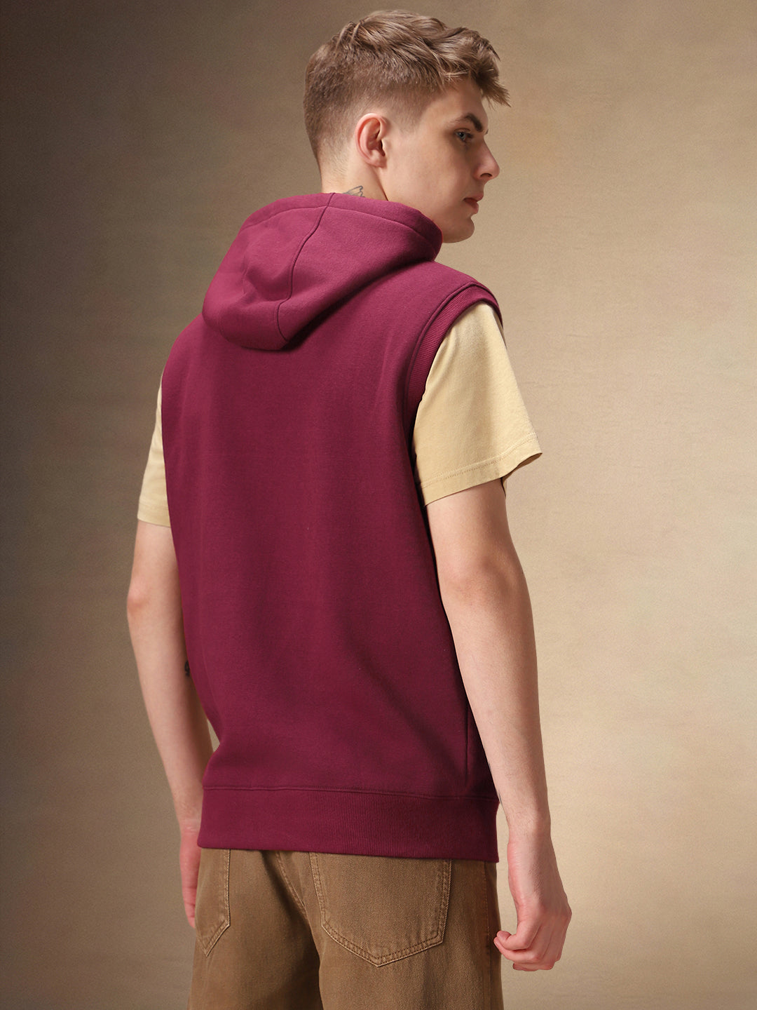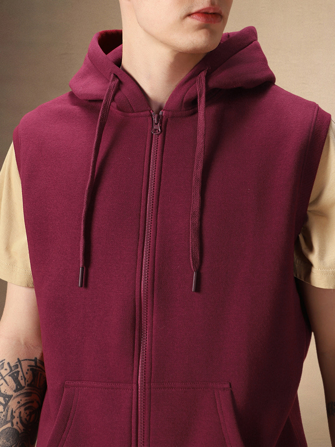 Men's Solid Maroon Hooded Sleeveless Hoodie