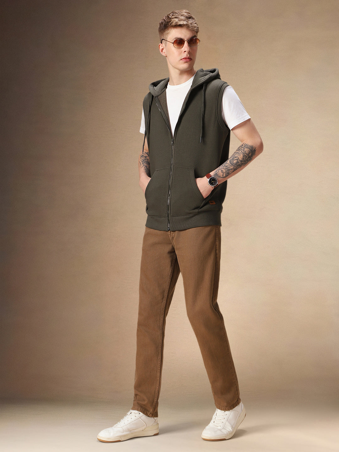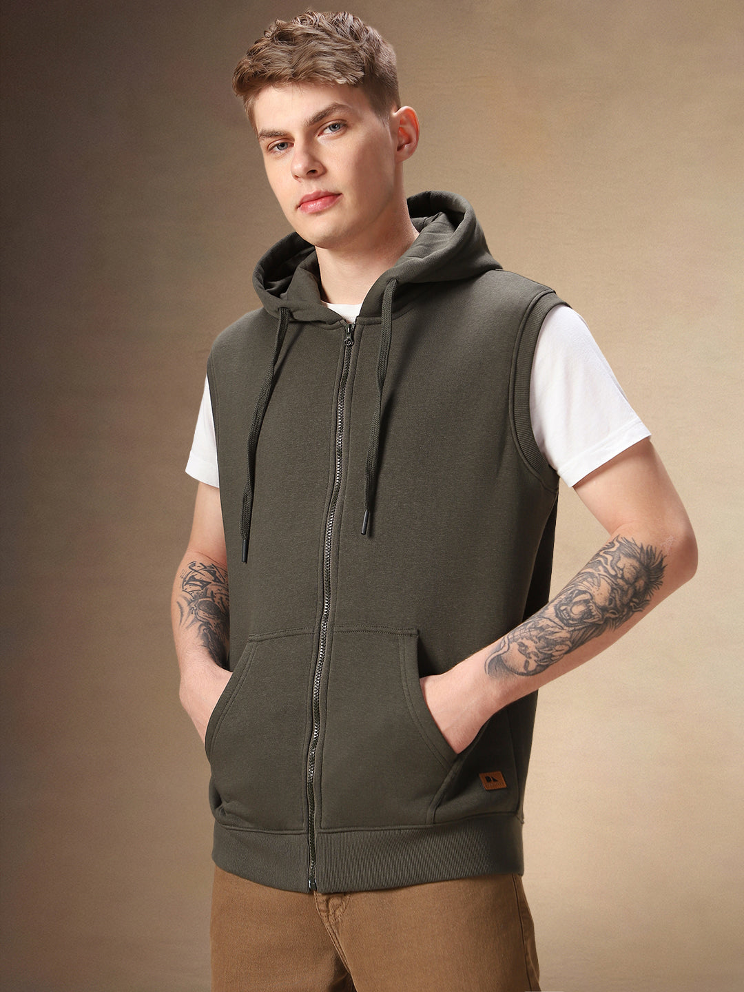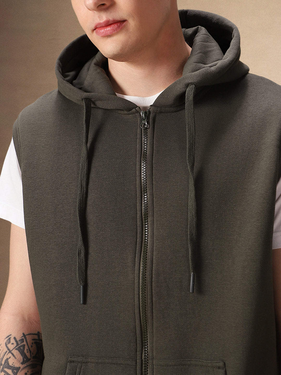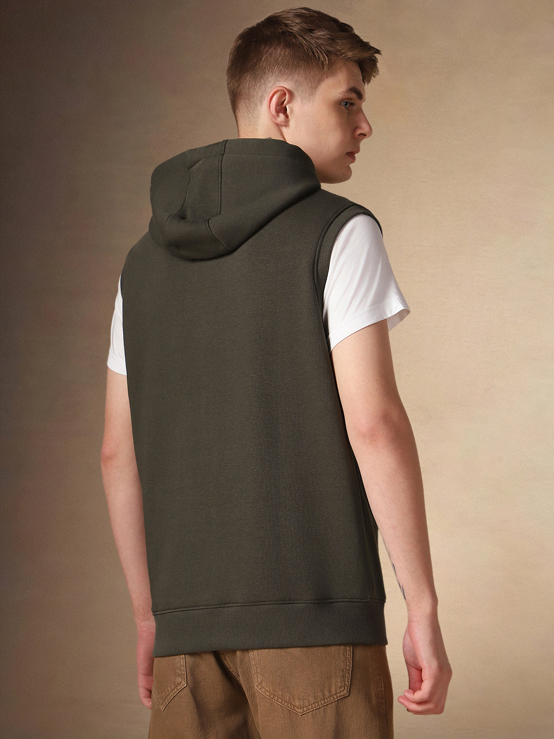 Men's Solid Olive Hooded Sleeveless Hoodie