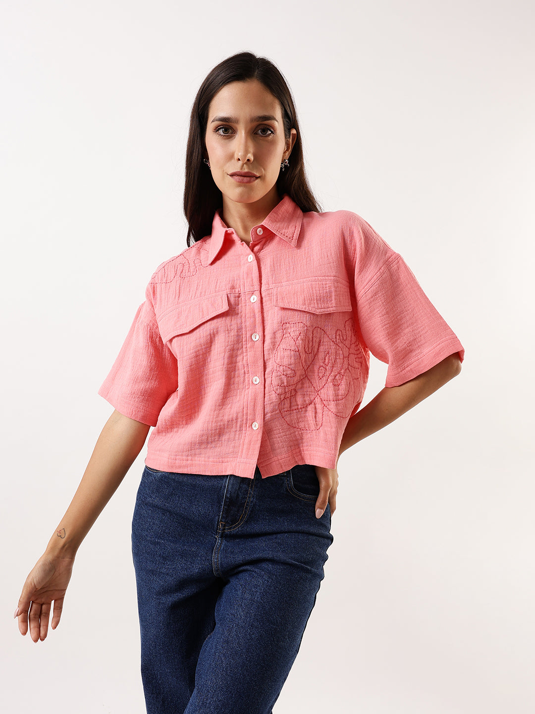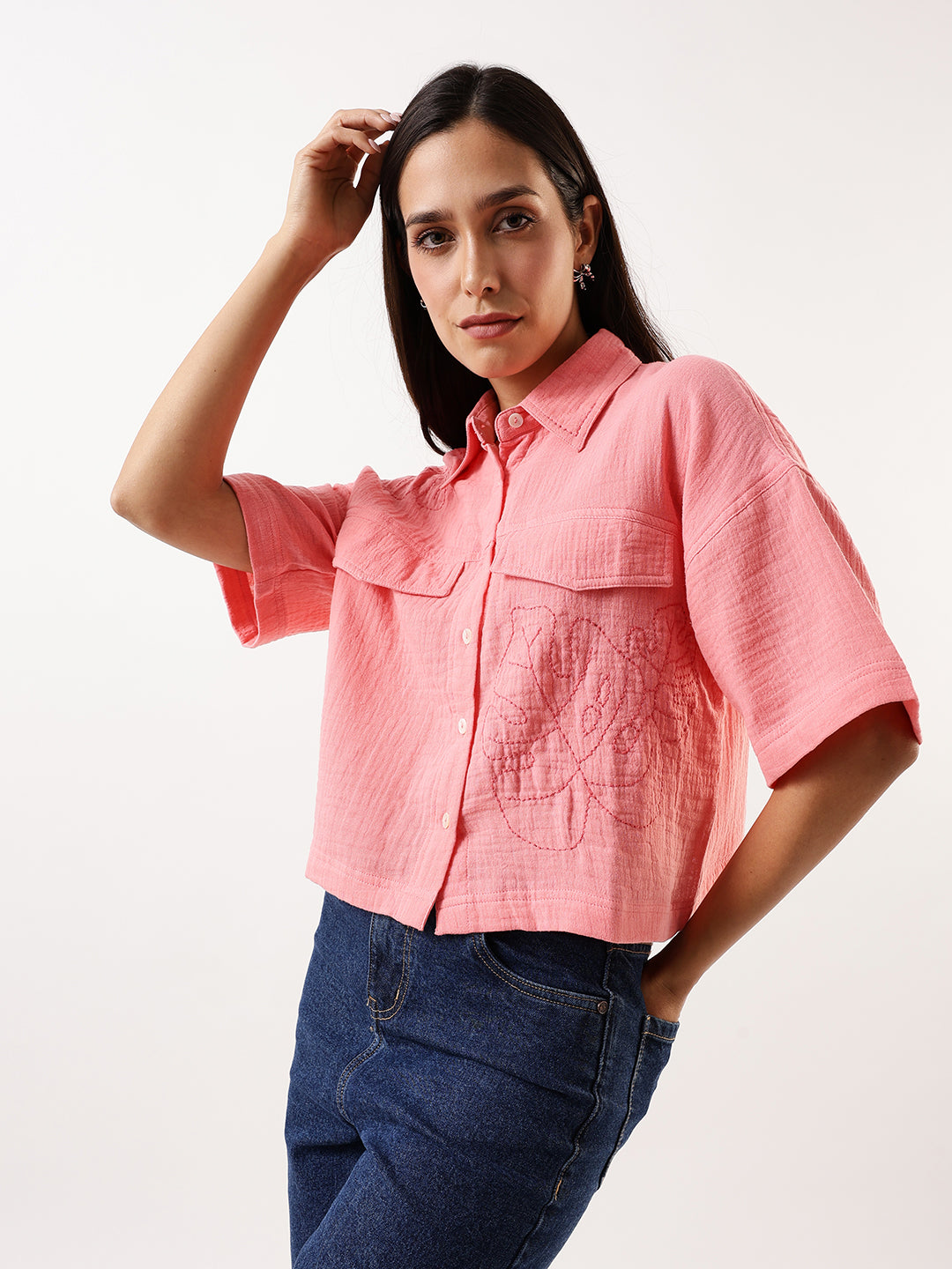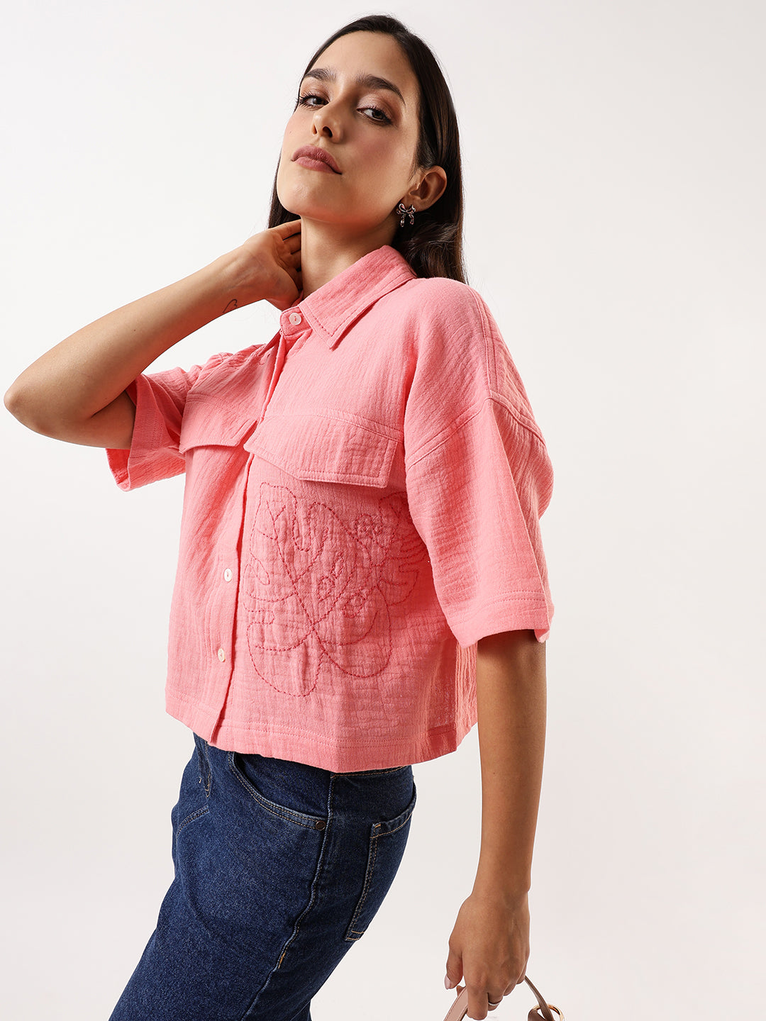 DL Woman Pink Embroidered Half Sleeves Spread Collar Textured Boxy Shirt