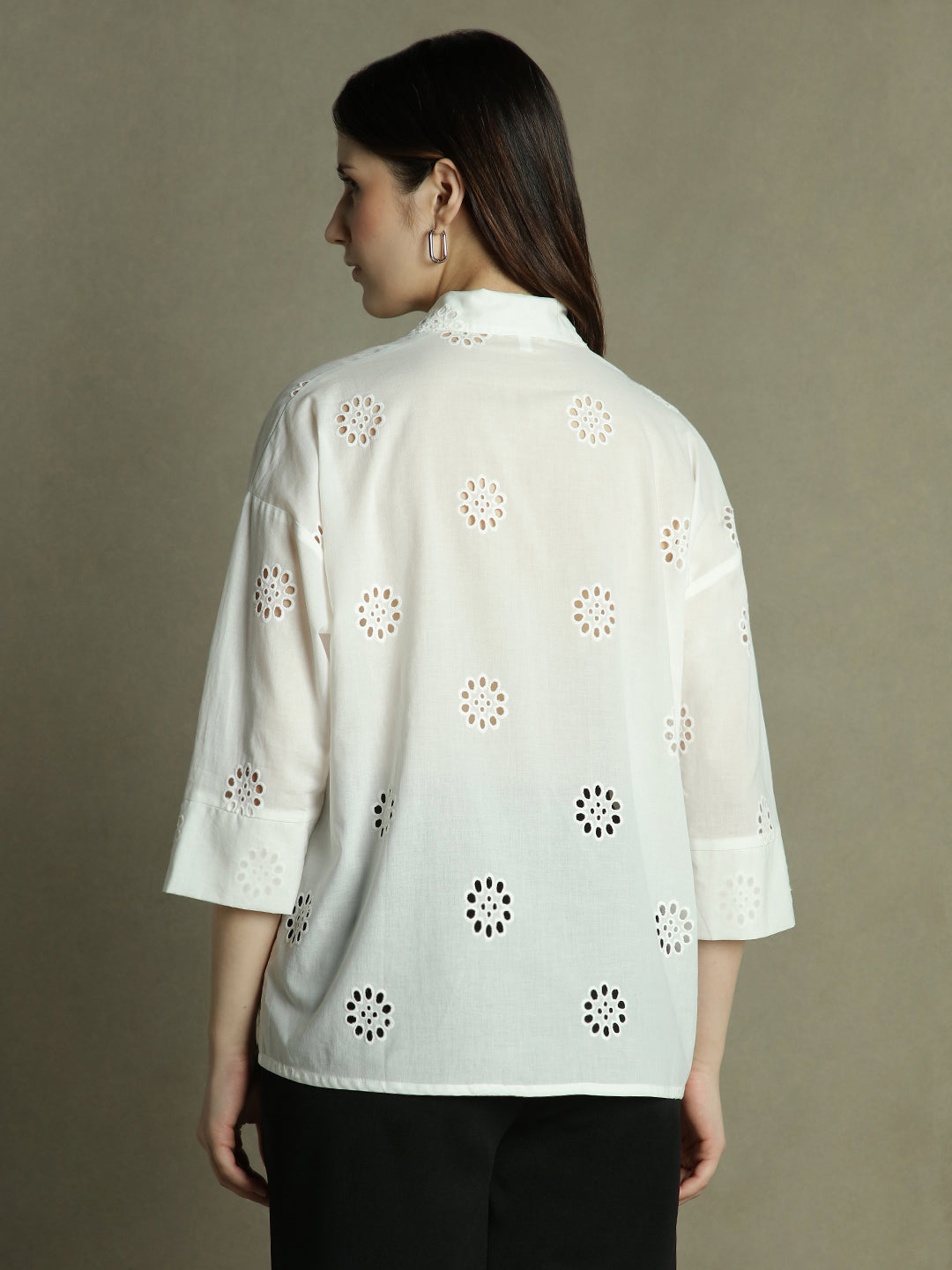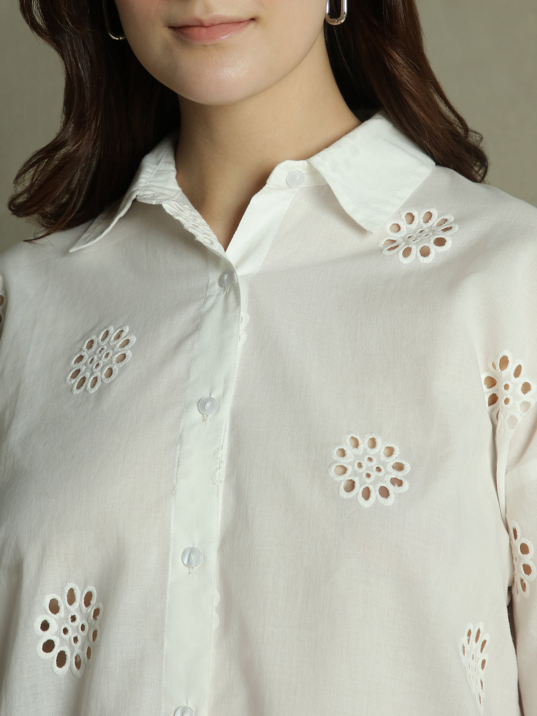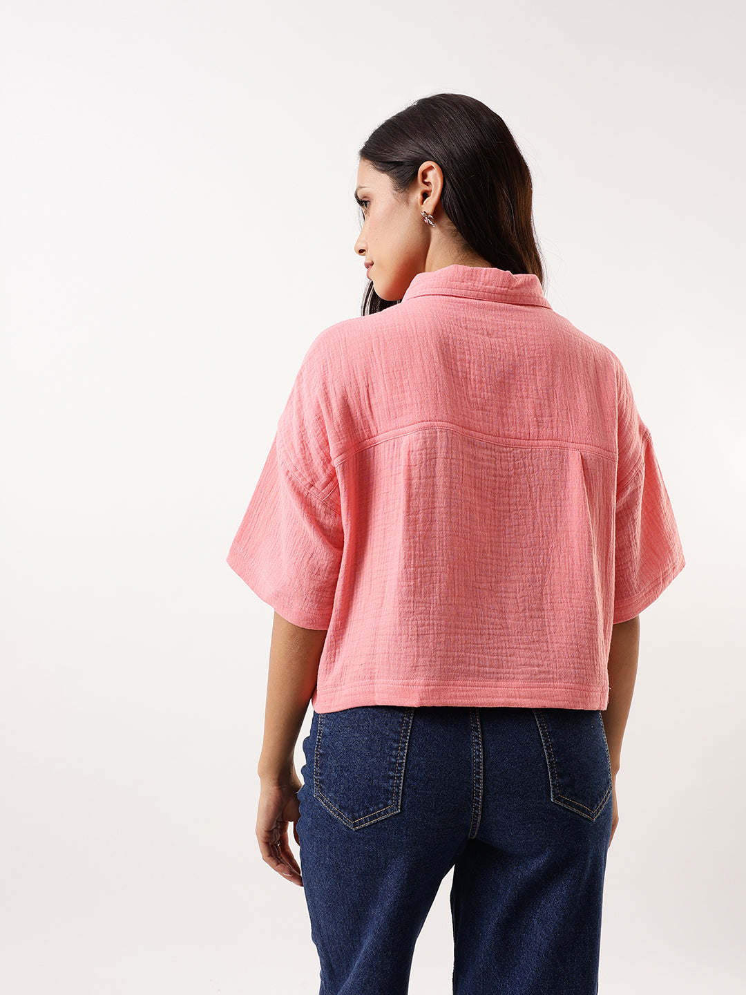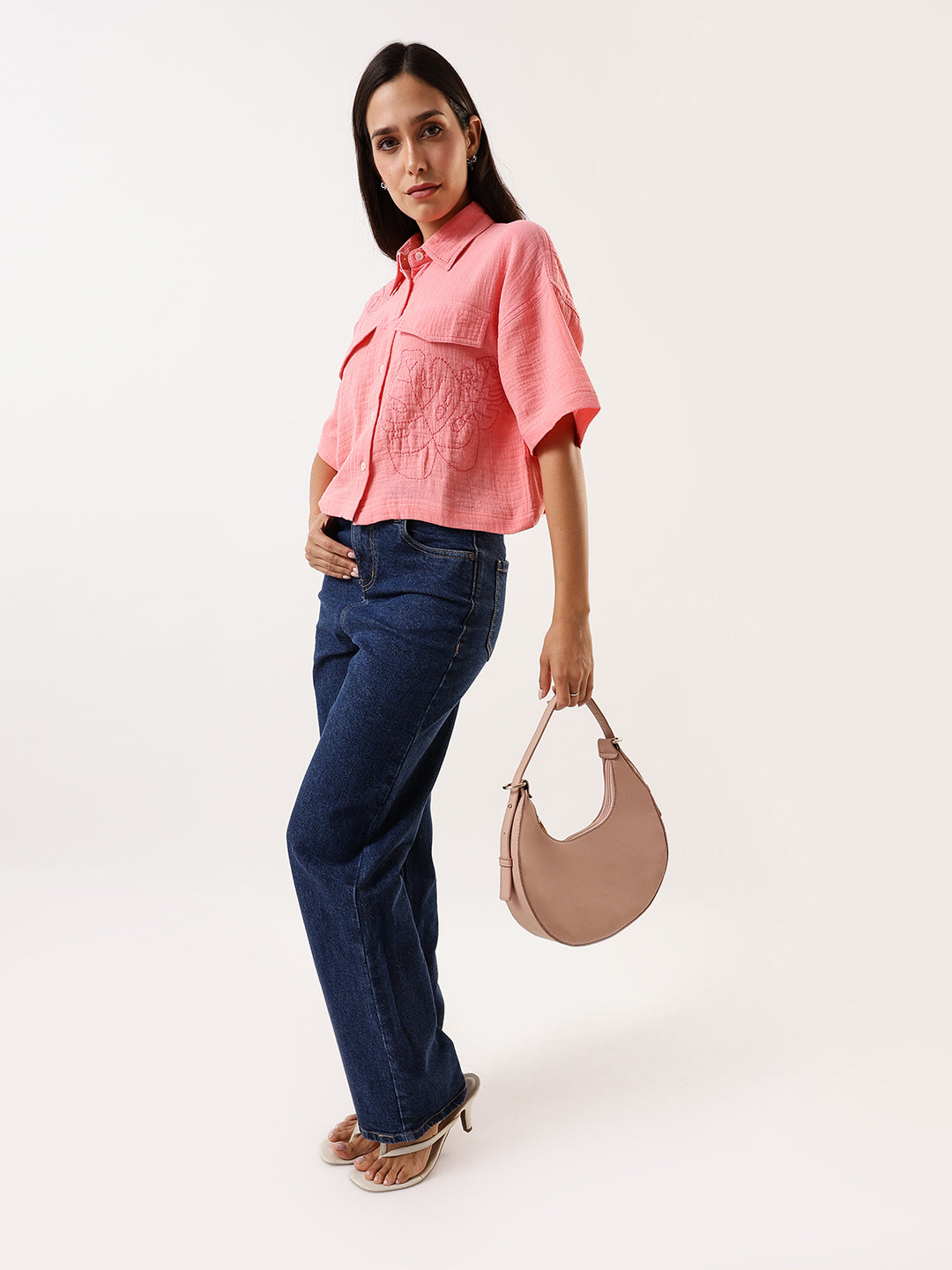 DL Woman Pink Embroidered Half Sleeves Spread Collar Textured Boxy Shirt