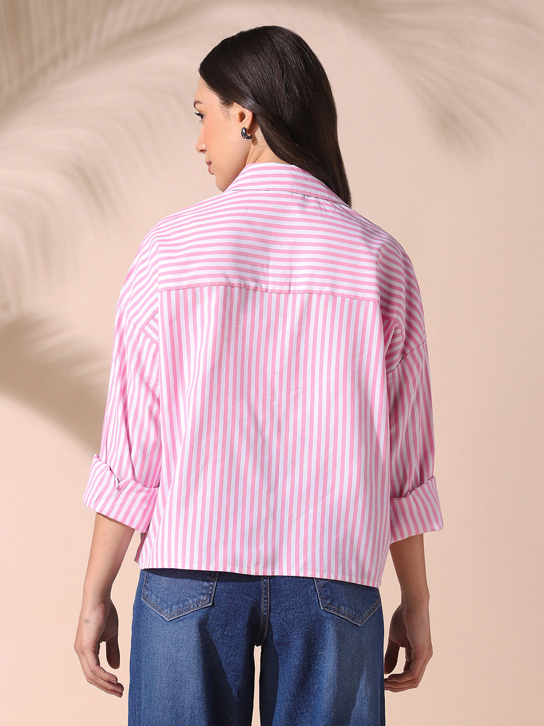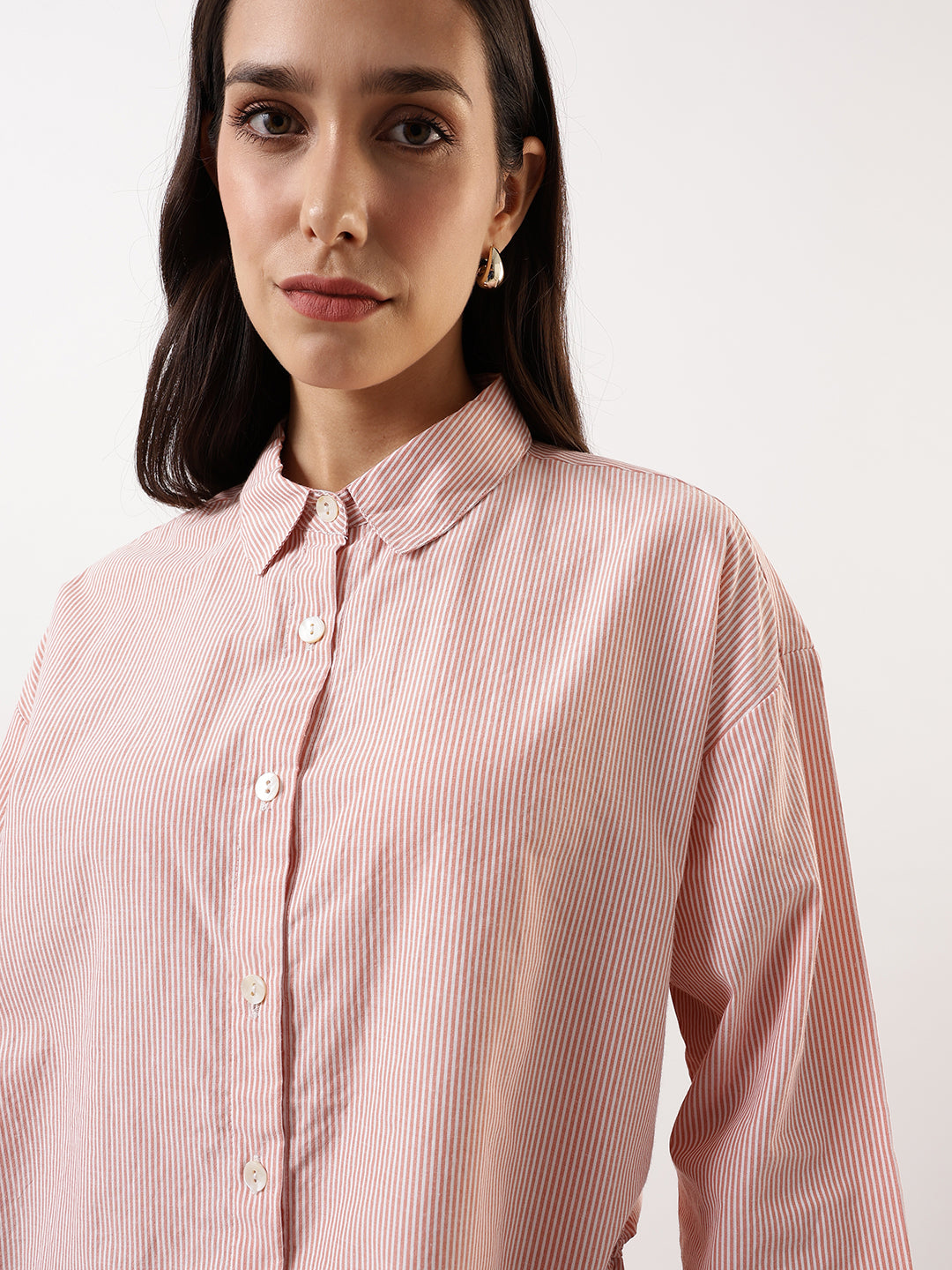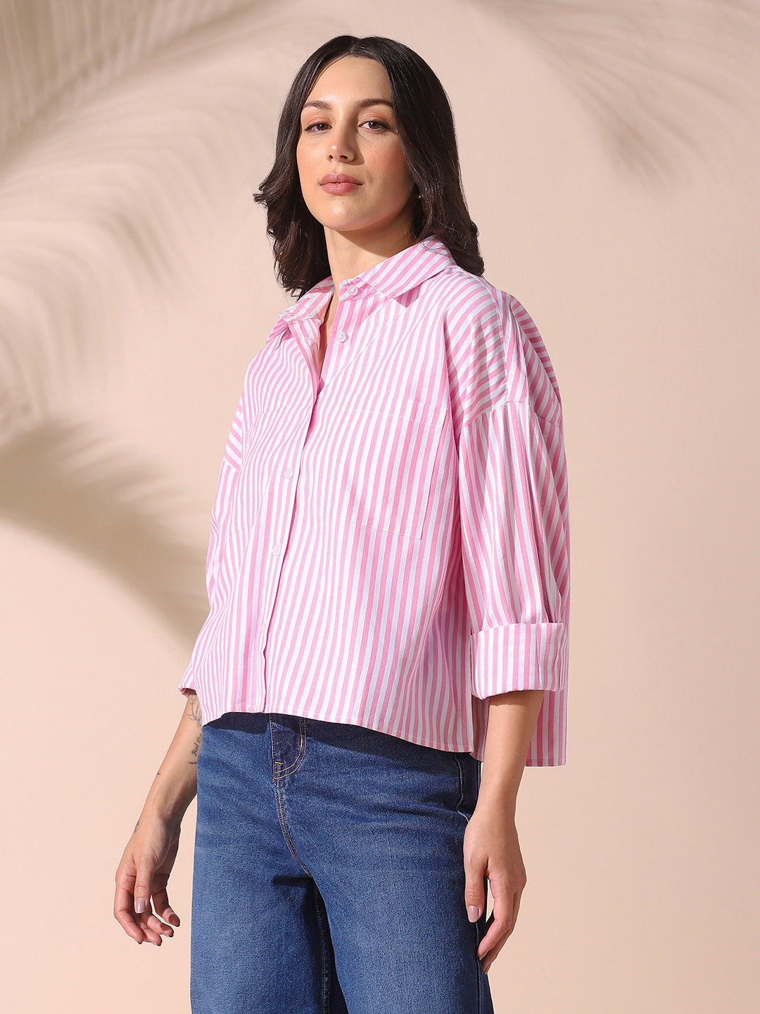 DL Woman Pink Striped Spread Collar Drop Shoulder Relaxed Cotton Shirt