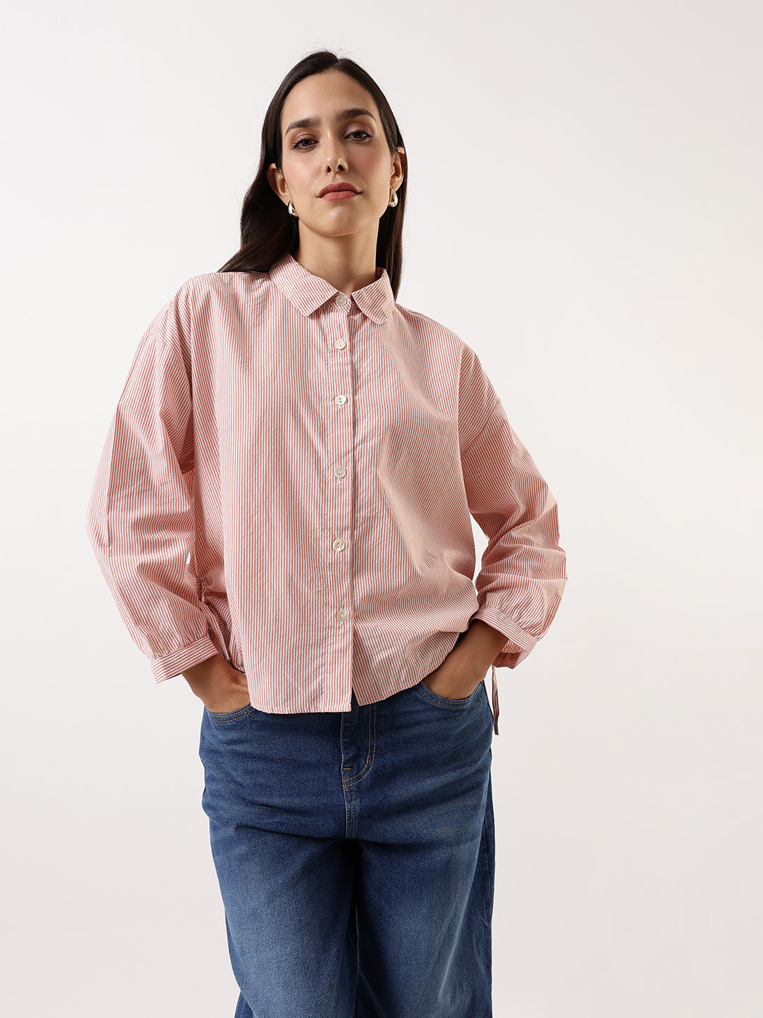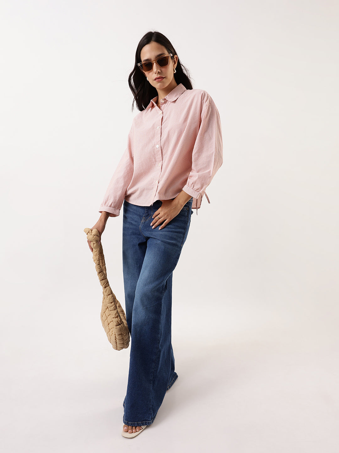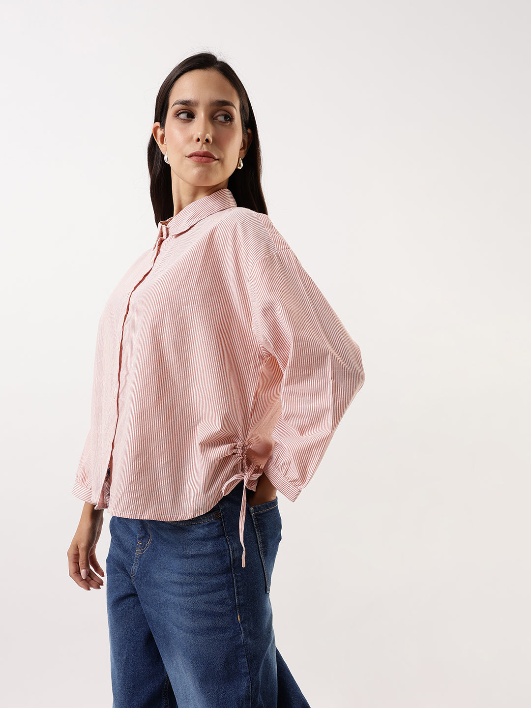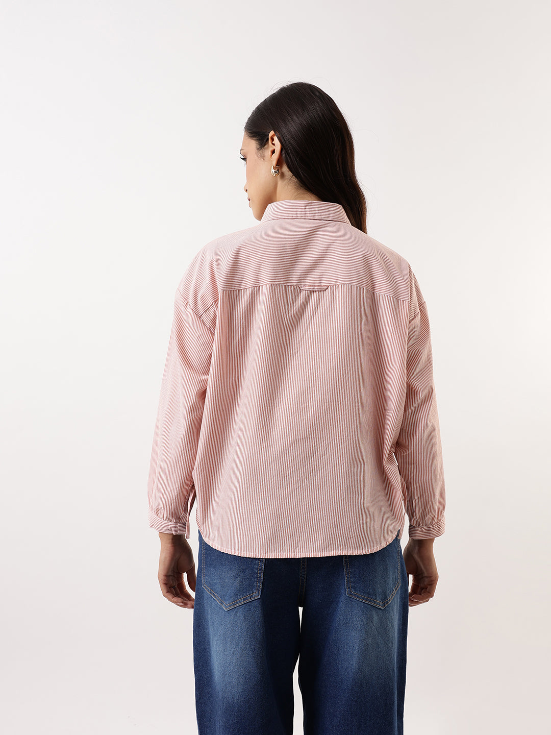 DL Woman Pink Striped Spread Collar Drop Shoulder Relaxed Cotton Shirt