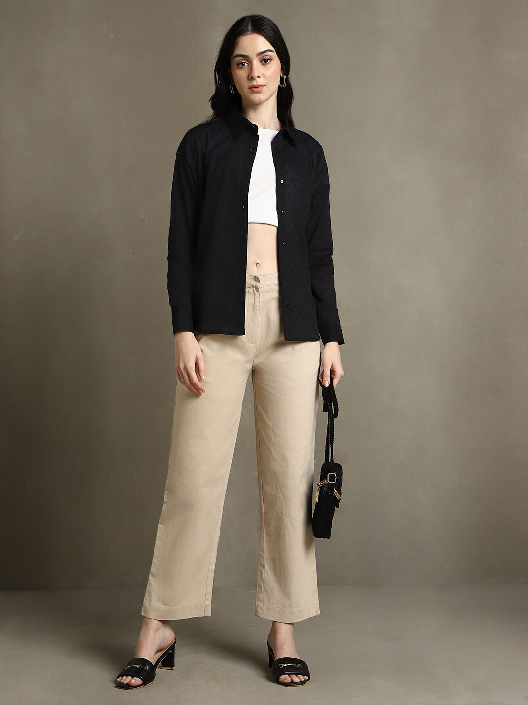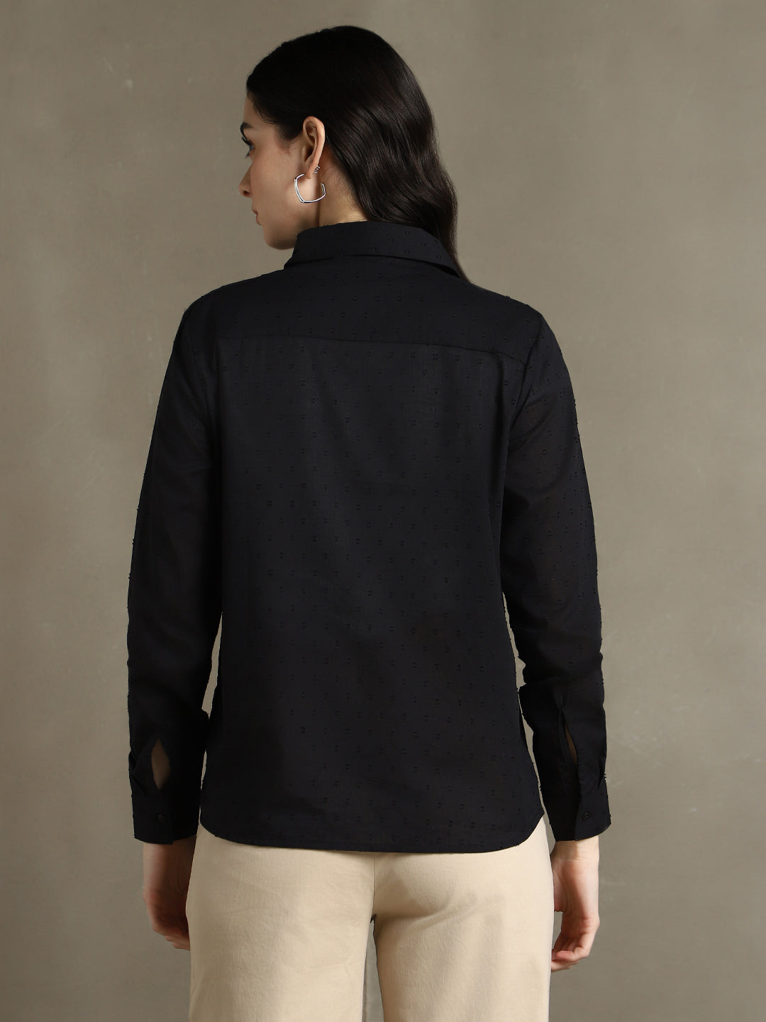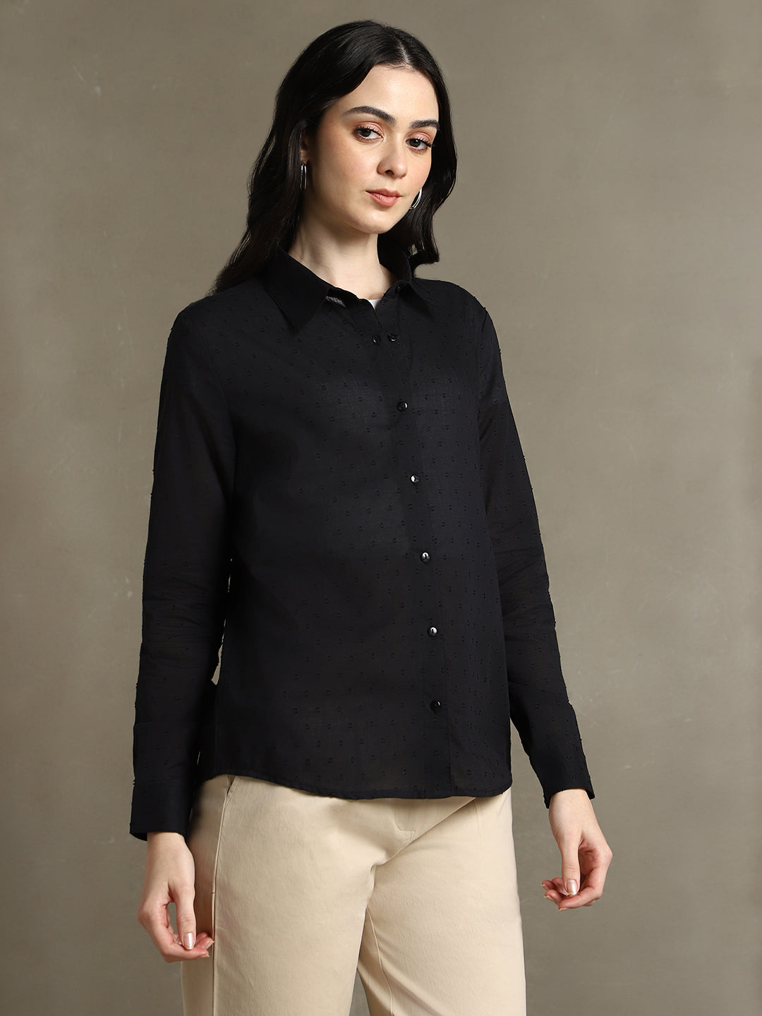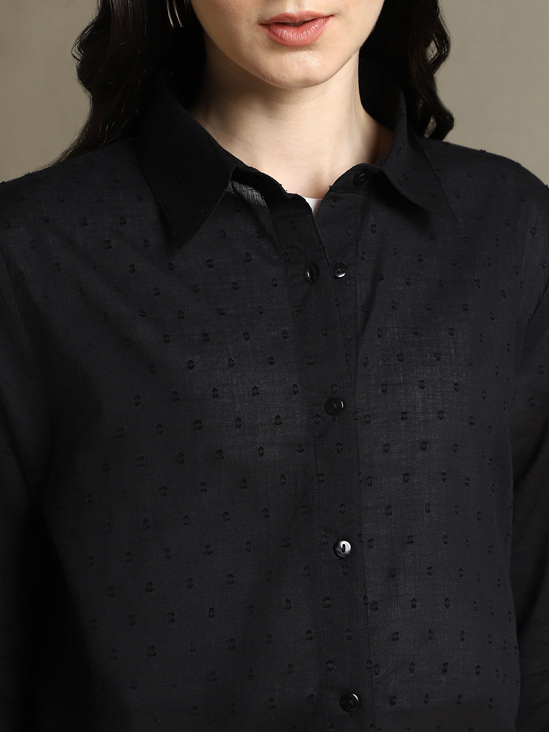DL Woman Black Solid Textured Spread Collar Full Sleeves Shirt