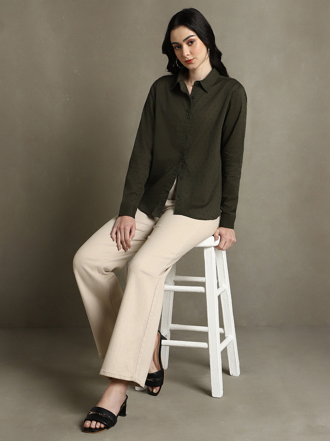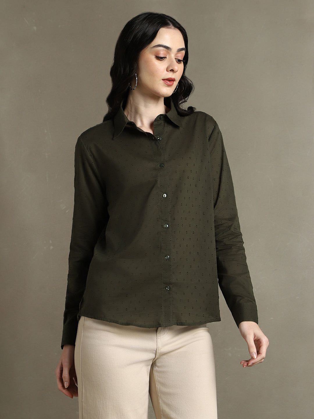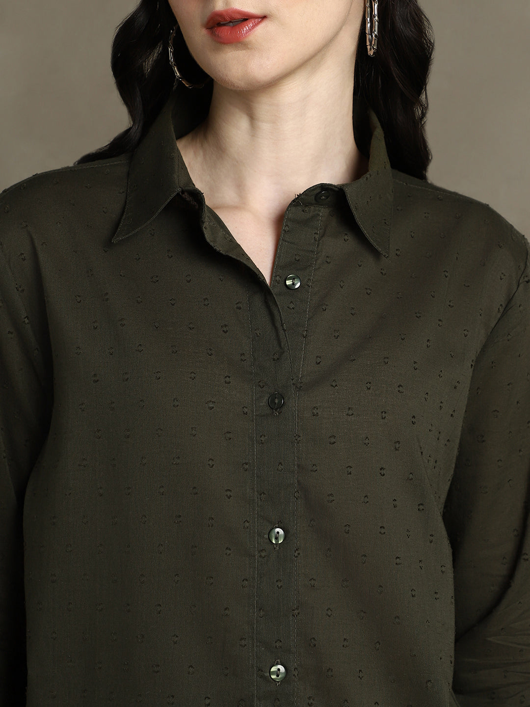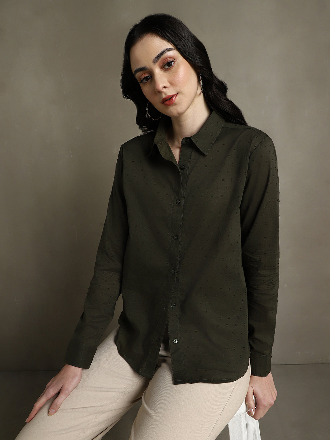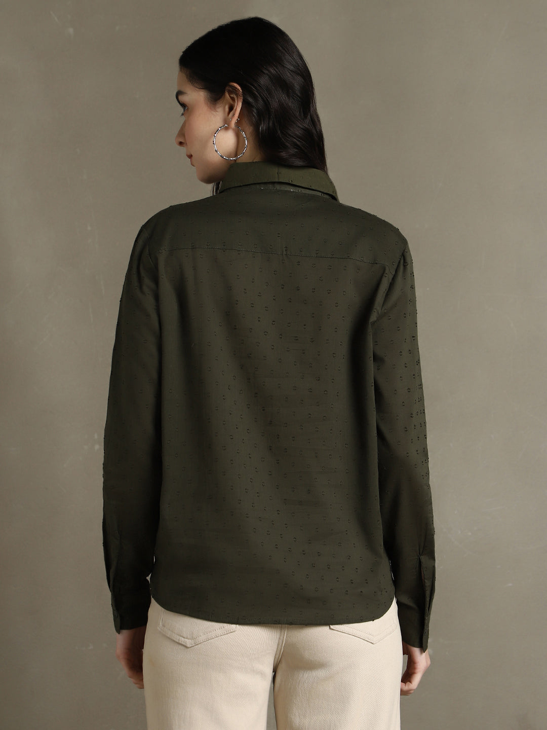 DL Woman Olive Solid Textured Spread Collar Full Sleeves Shirt