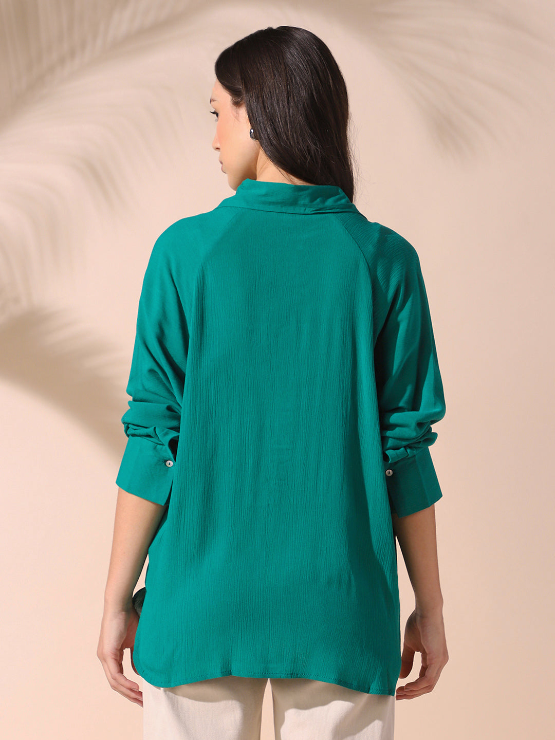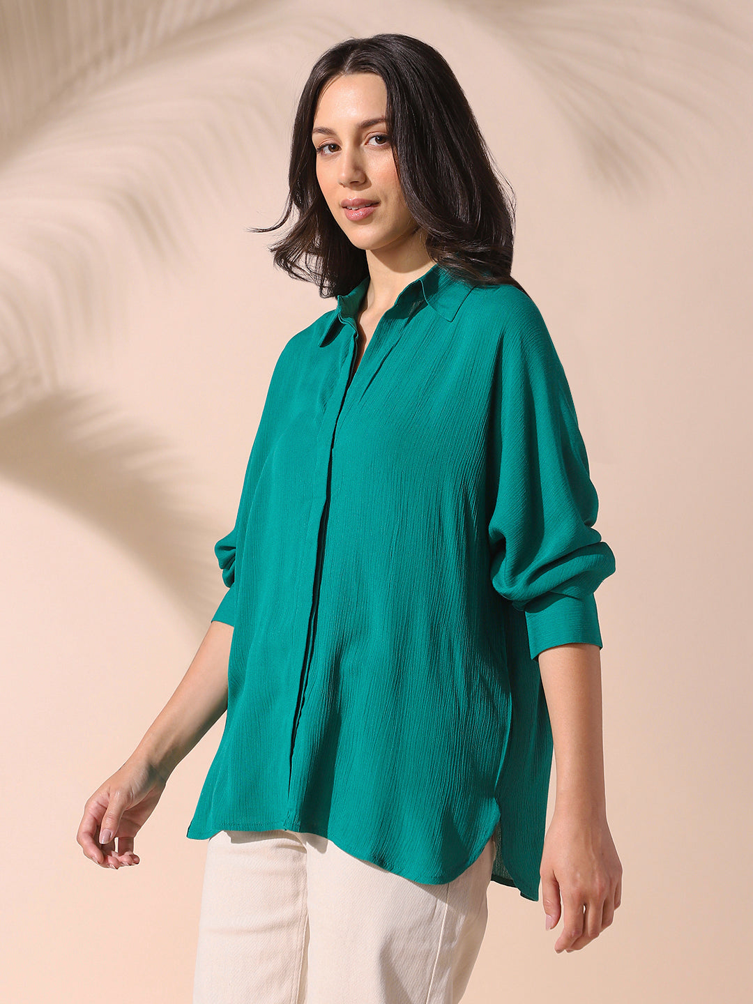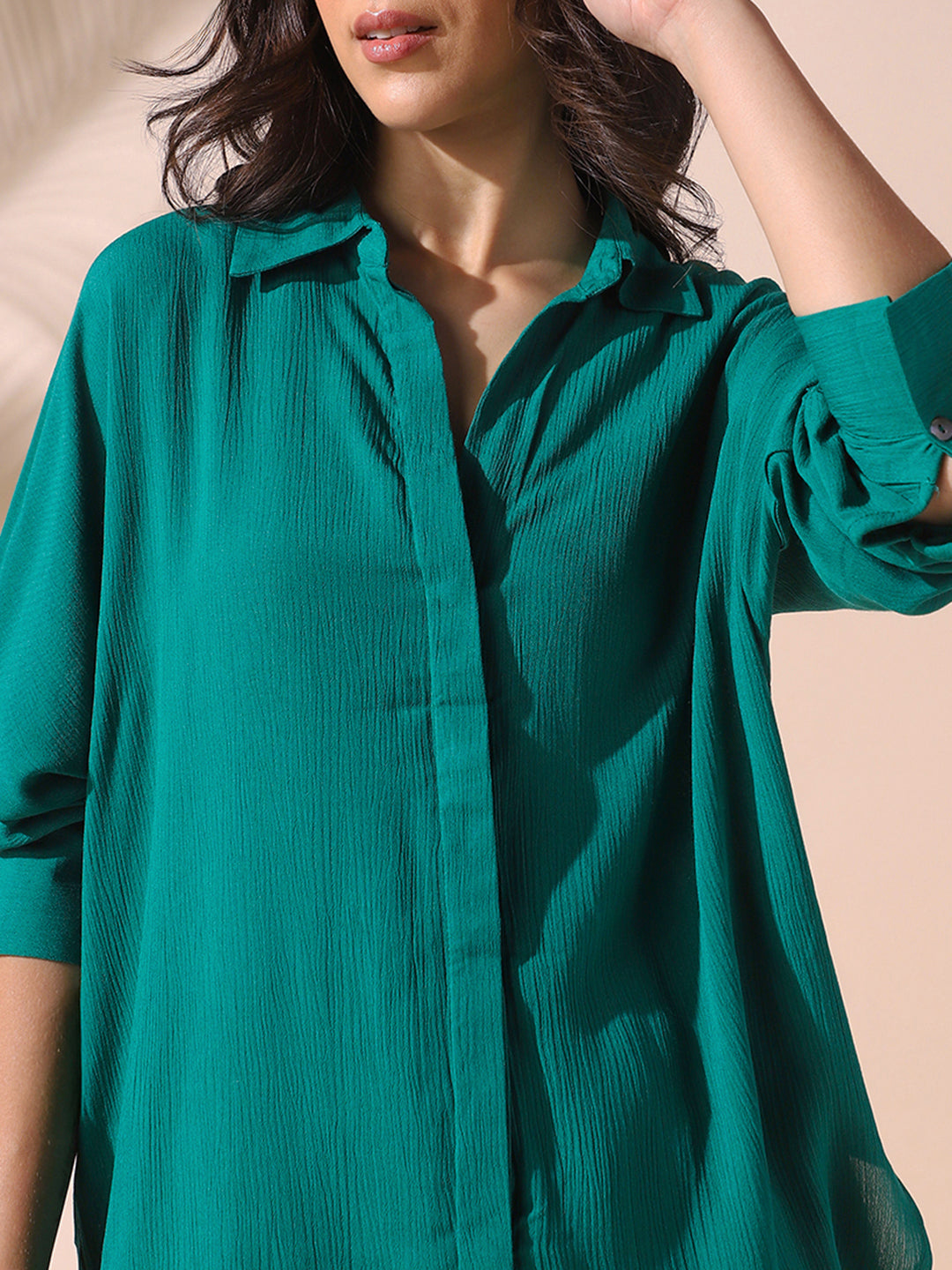 DL Woman Green Solid Spread Collar Full Sleeves Oversized Shirt
