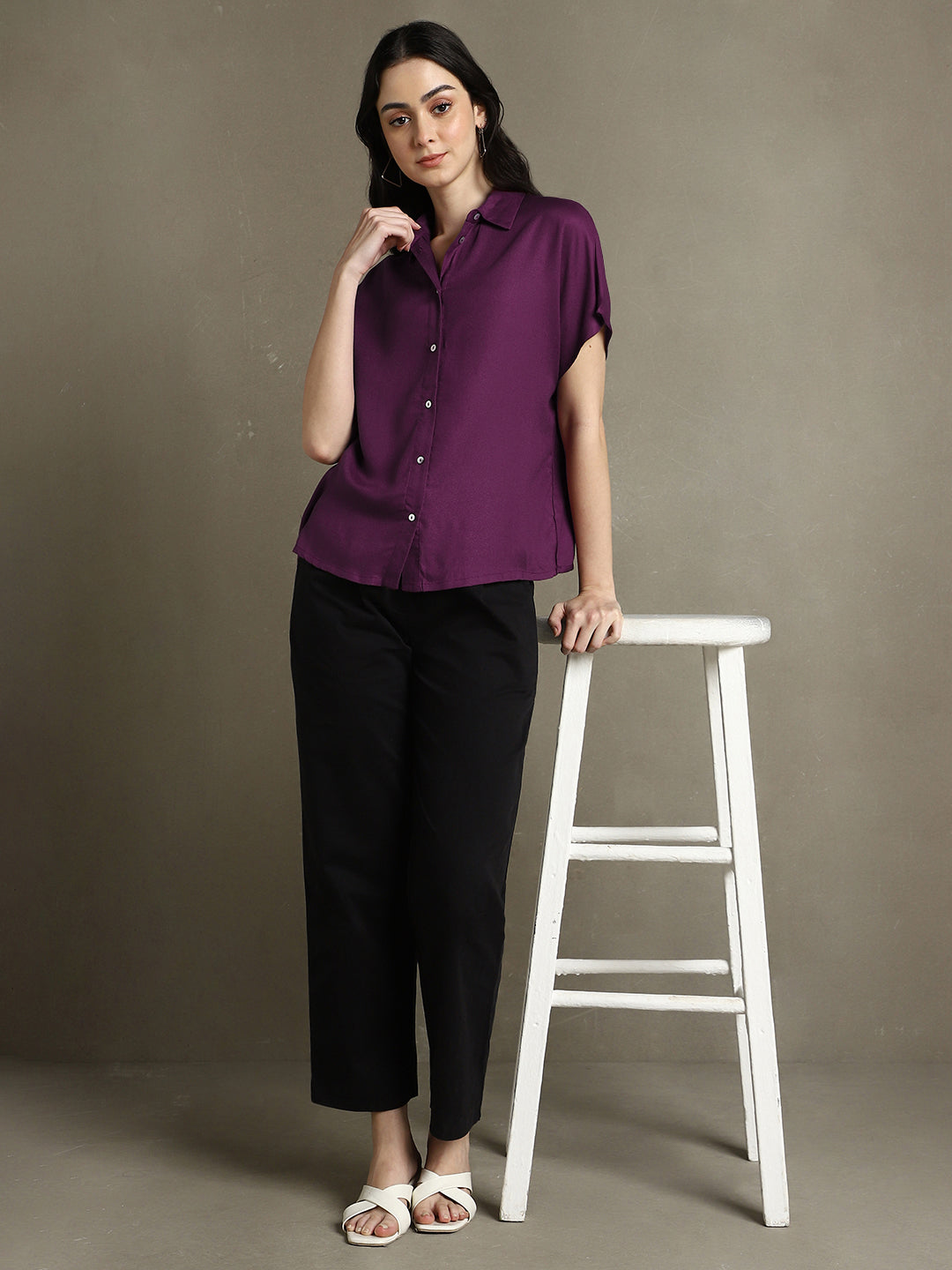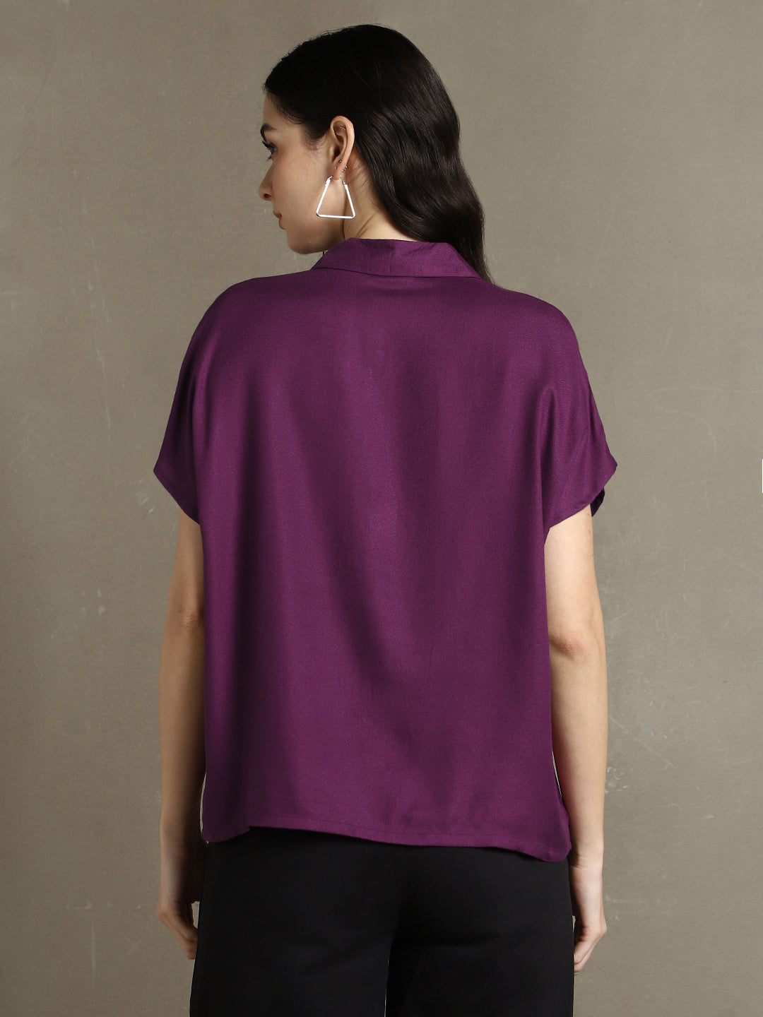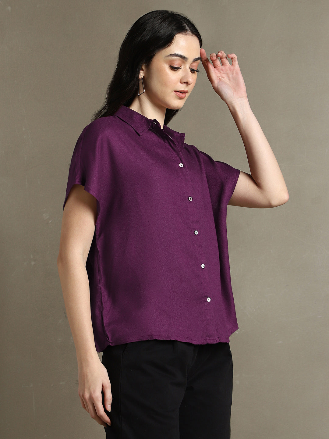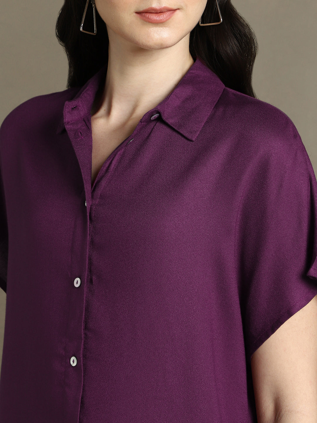 DL Woman Purple Solid Spread Collar Half Sleeves Oversized Shirt