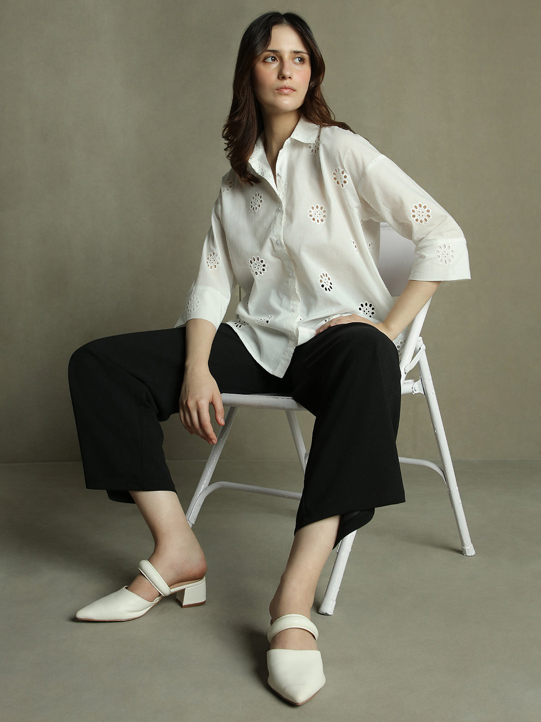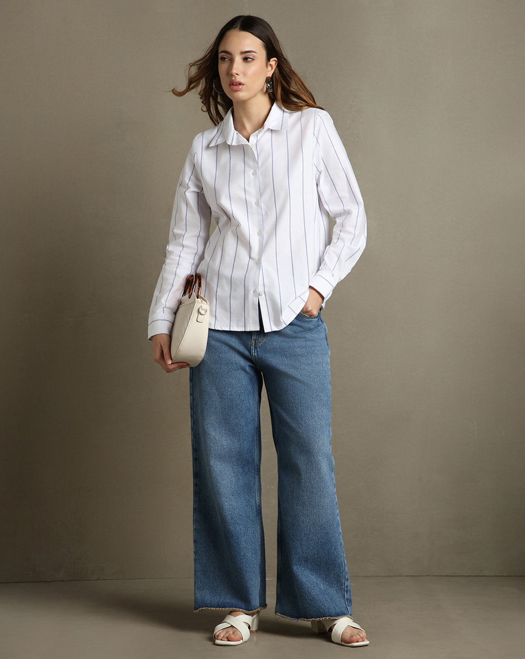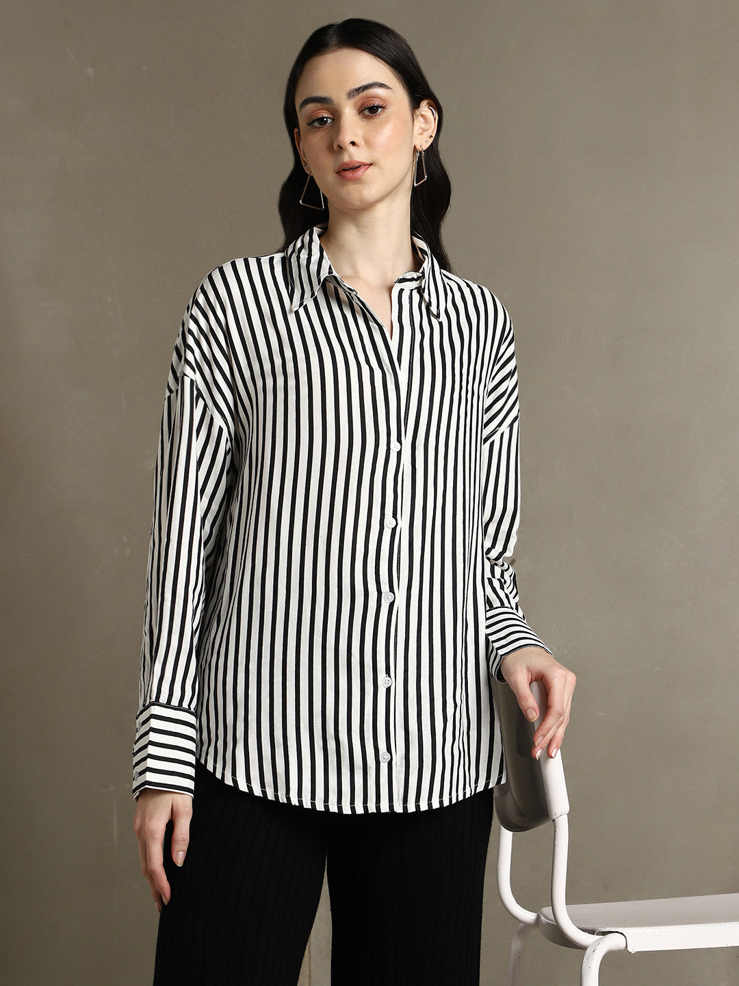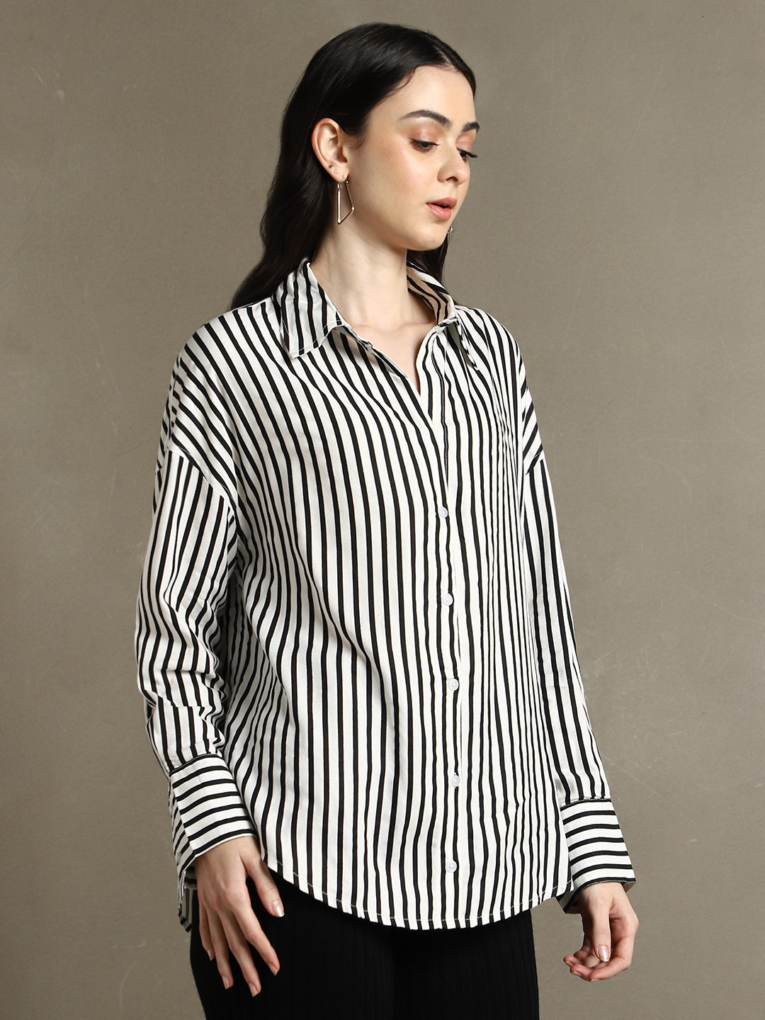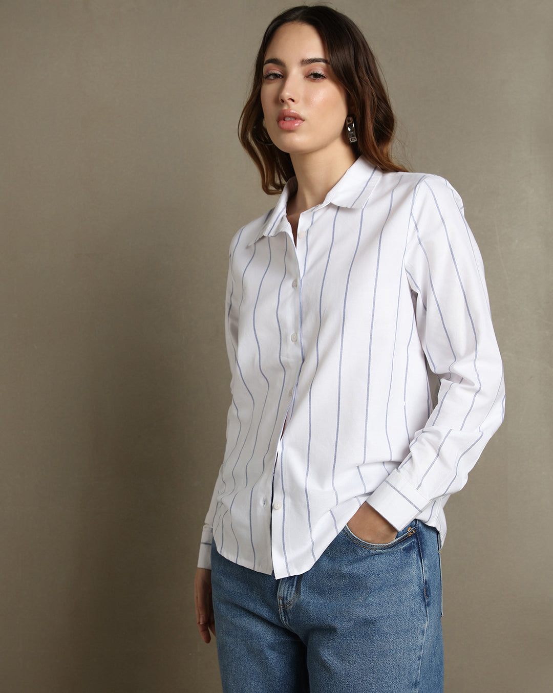 DL Woman White Striped Spread Collar Full Sleeves Relaxed Fit Shirt