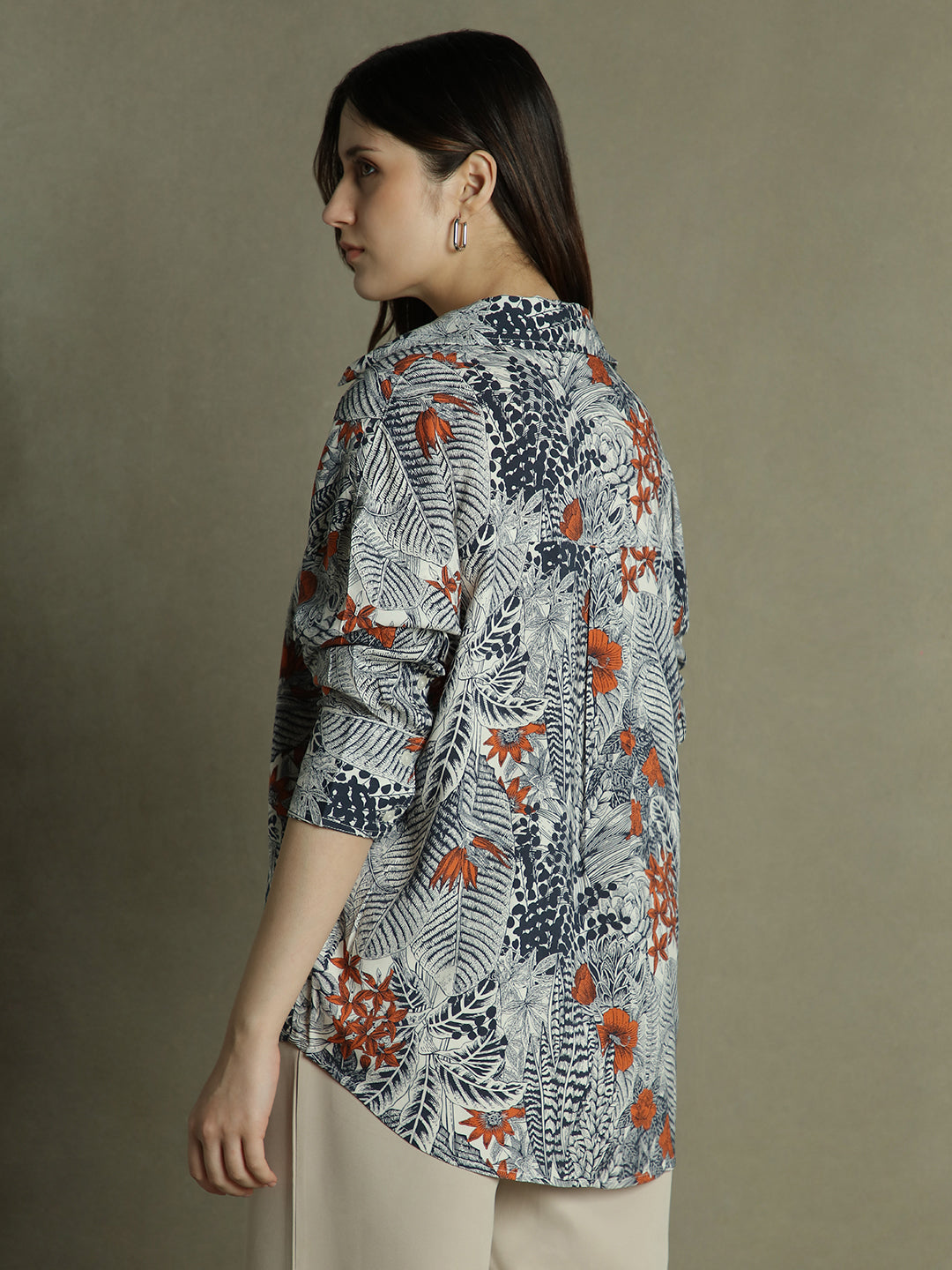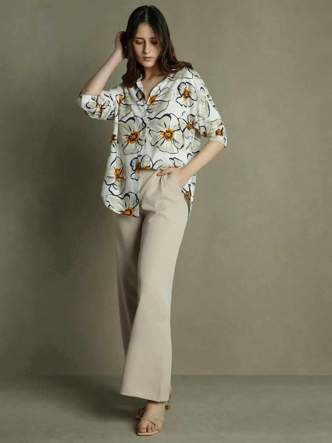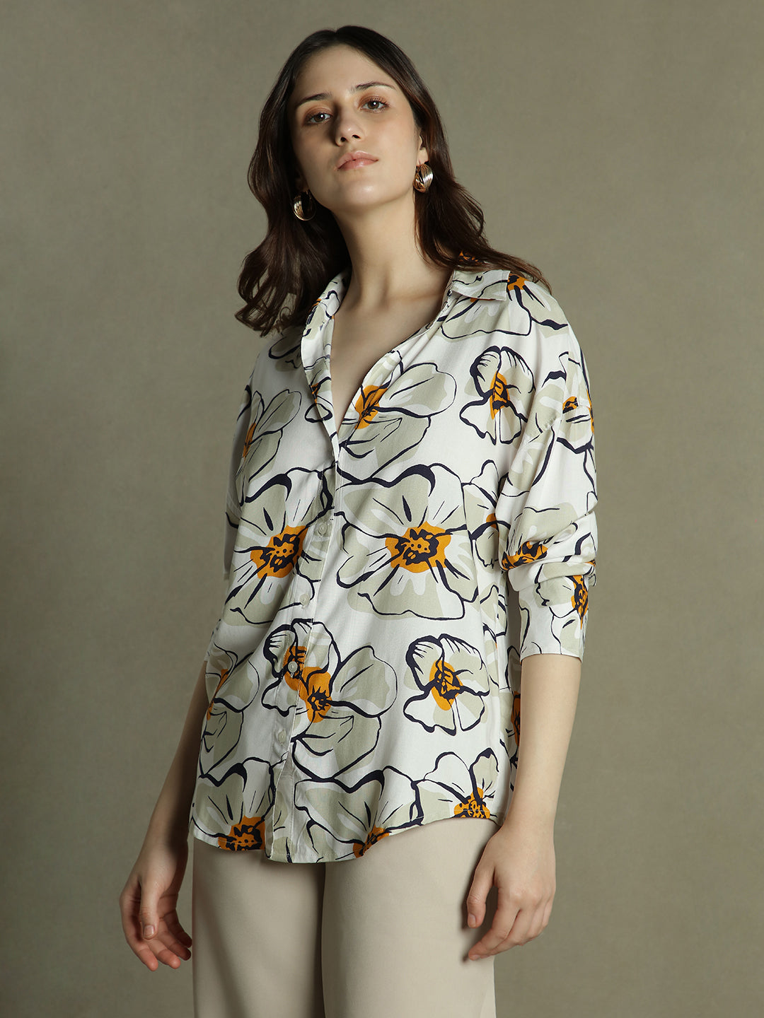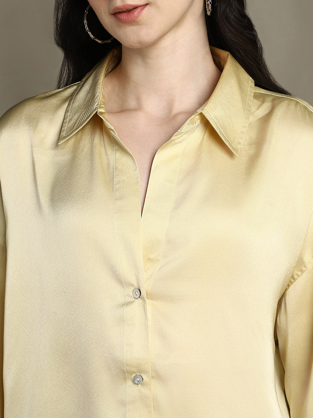 DL Woman Yellow Printed Spread Collar Full Sleeves Oversized Shirt