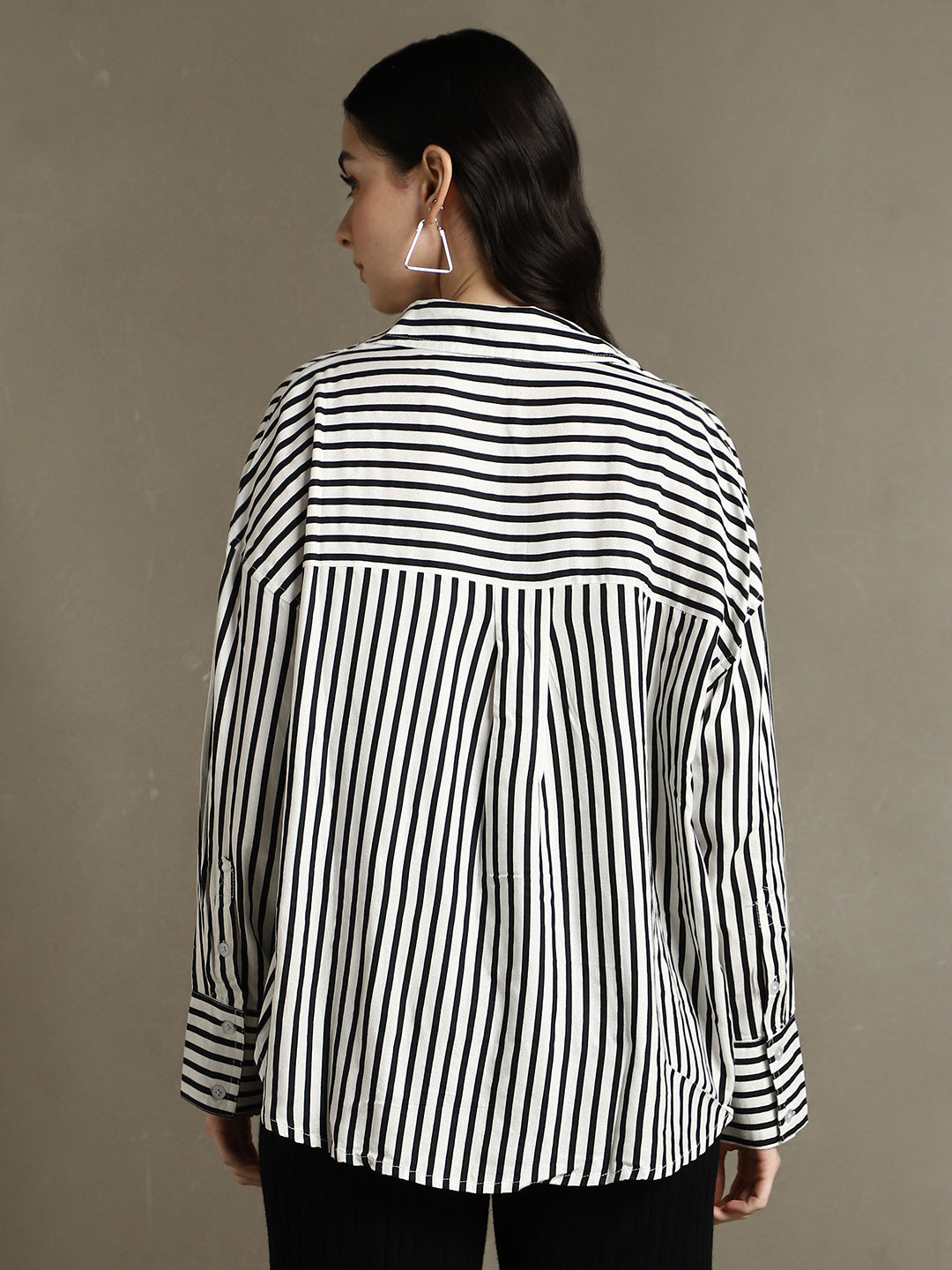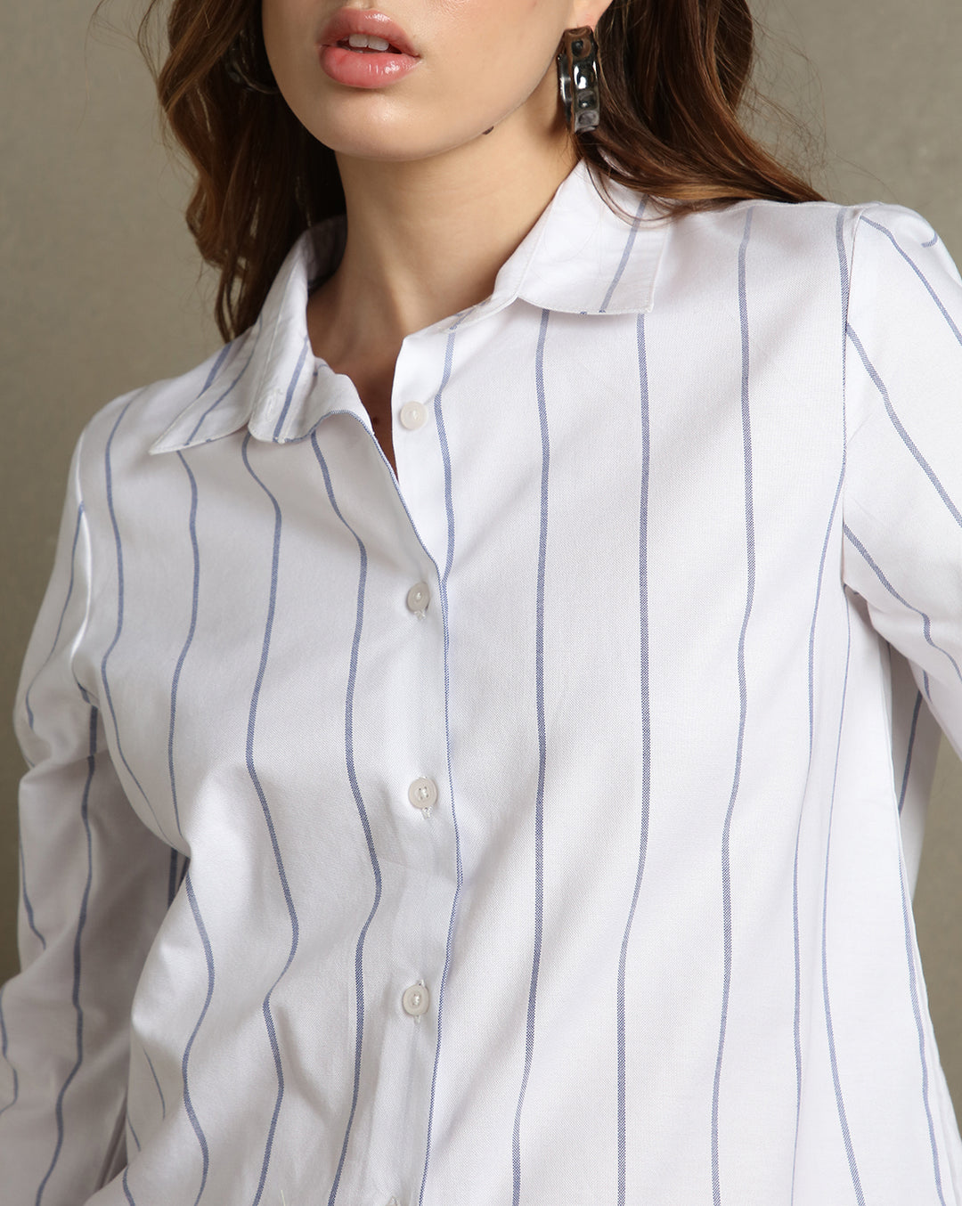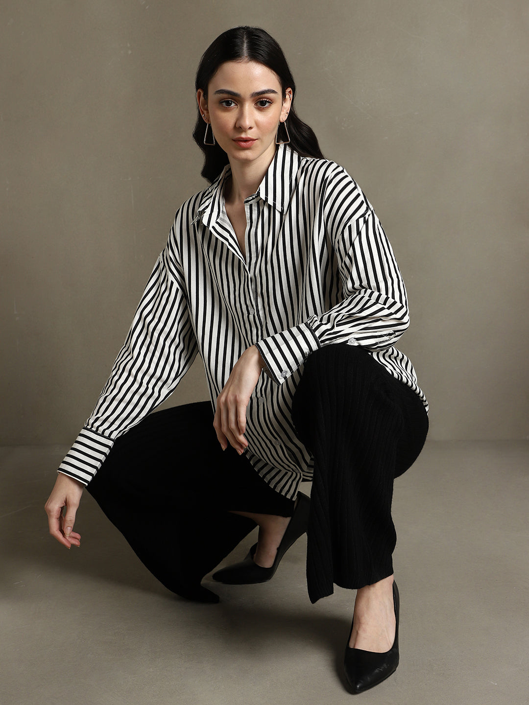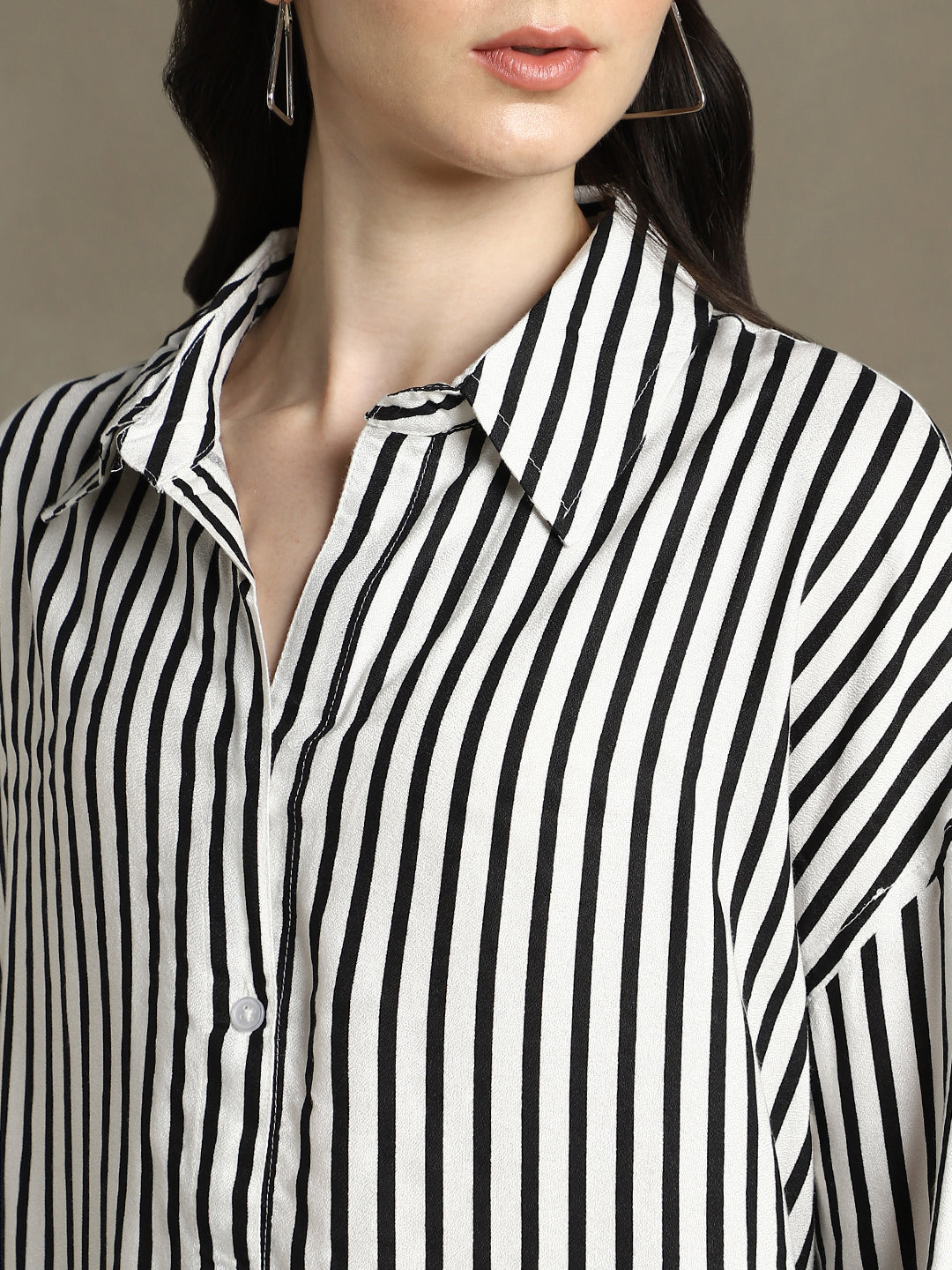 DL Woman White Striped Spread Collar Full Sleeves Oversized Shirt