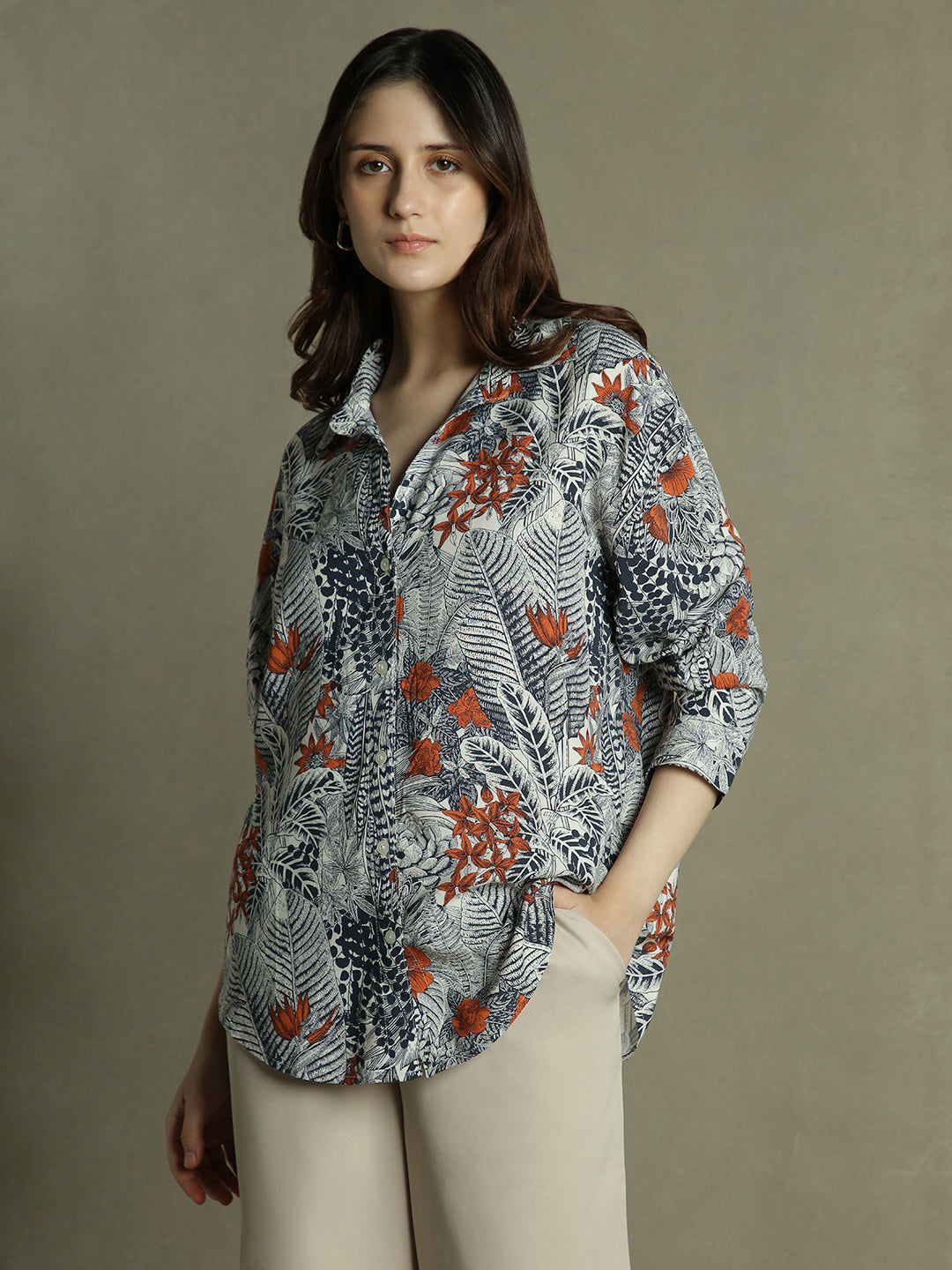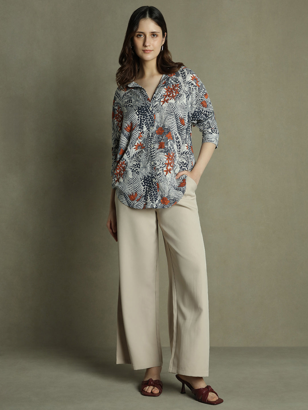 DL Woman Blue Floral Print Collared Cotton Shirt