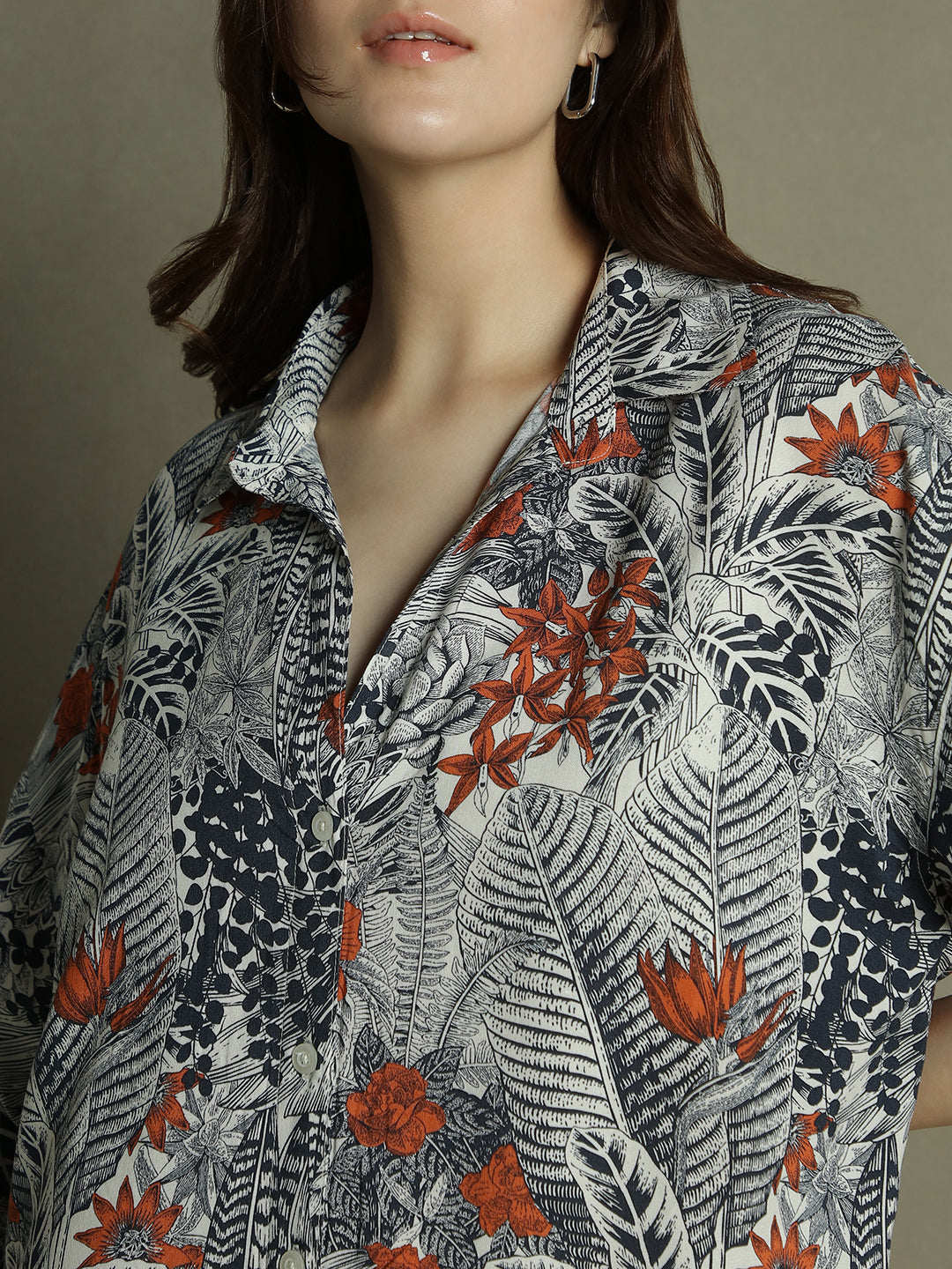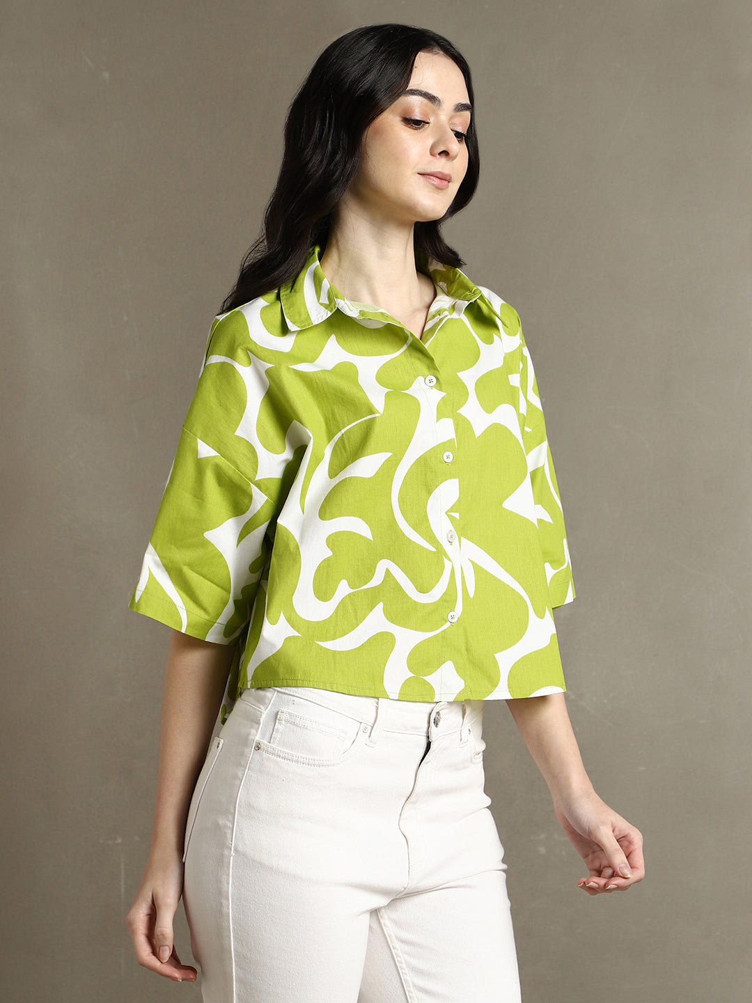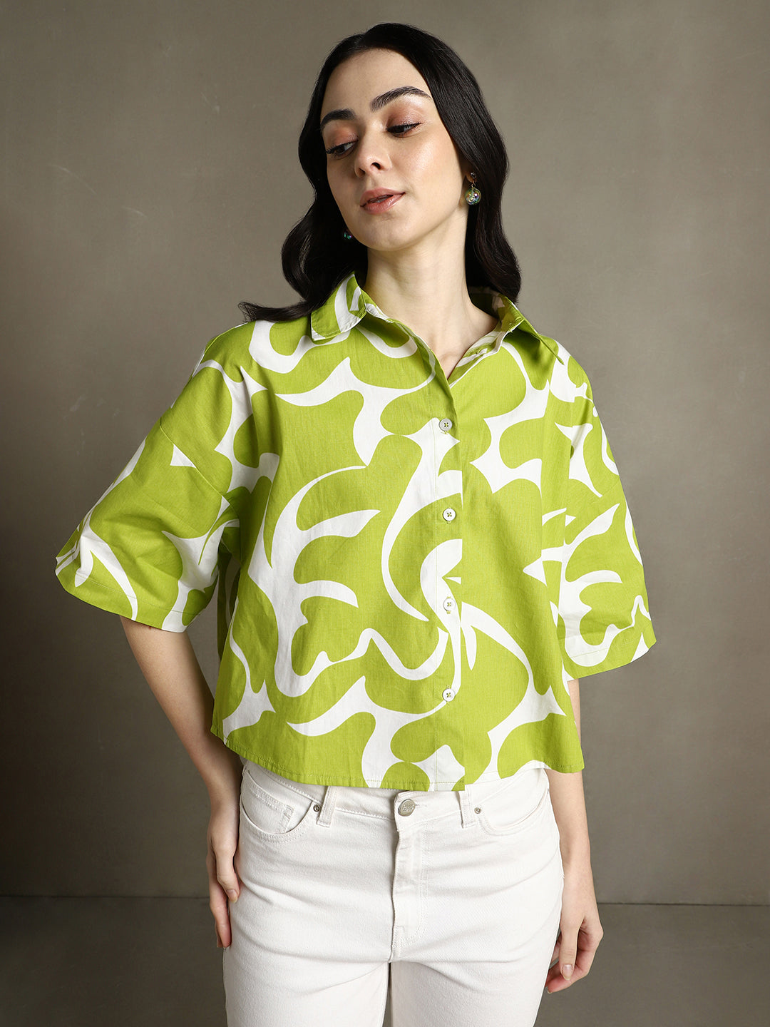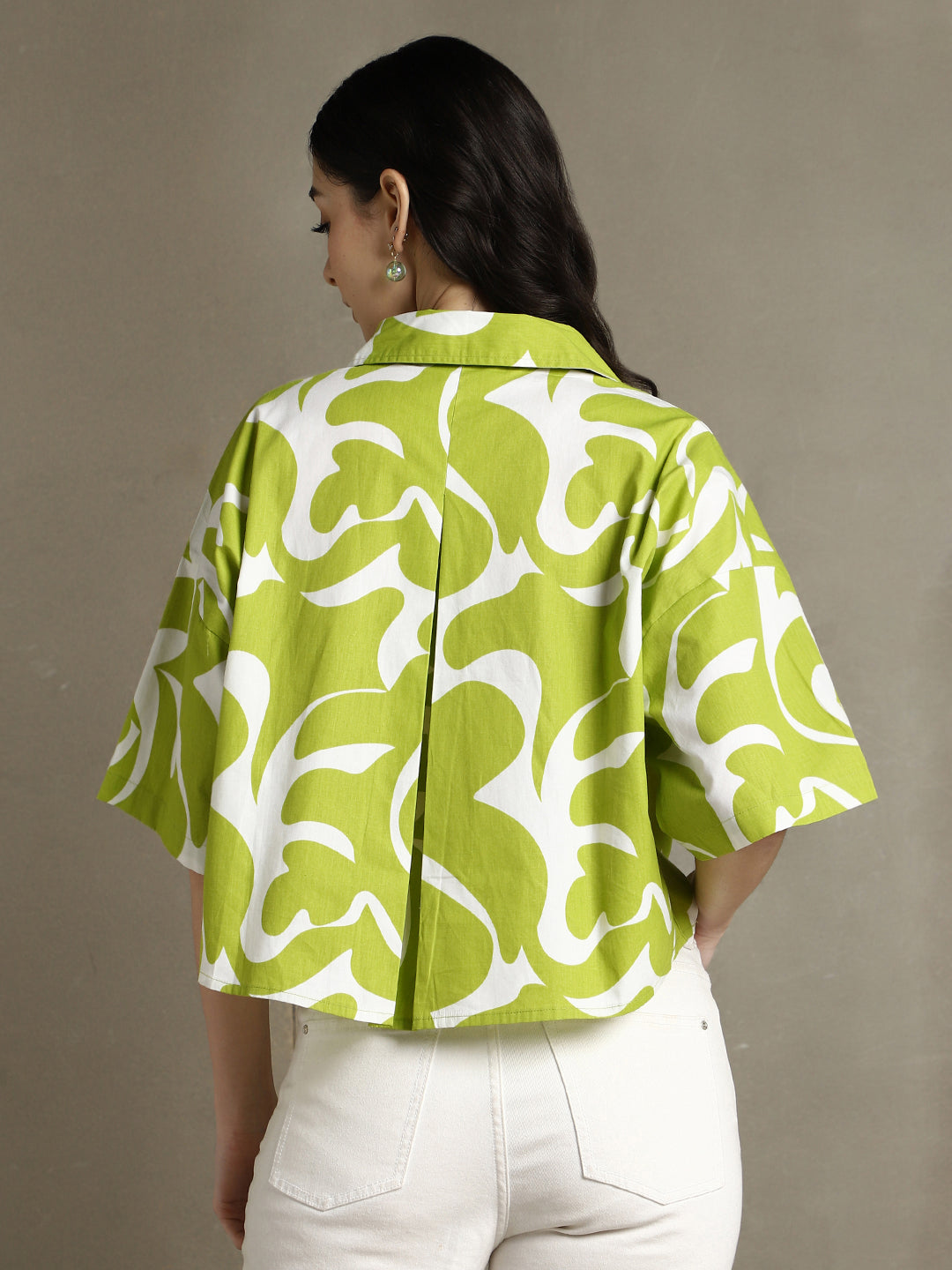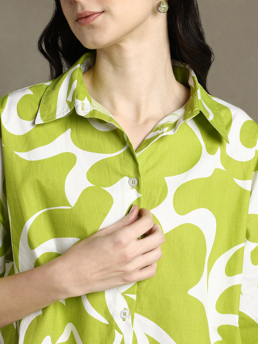 DL Woman Green Printed Spread Collar Half Sleeves Oversized Shirt