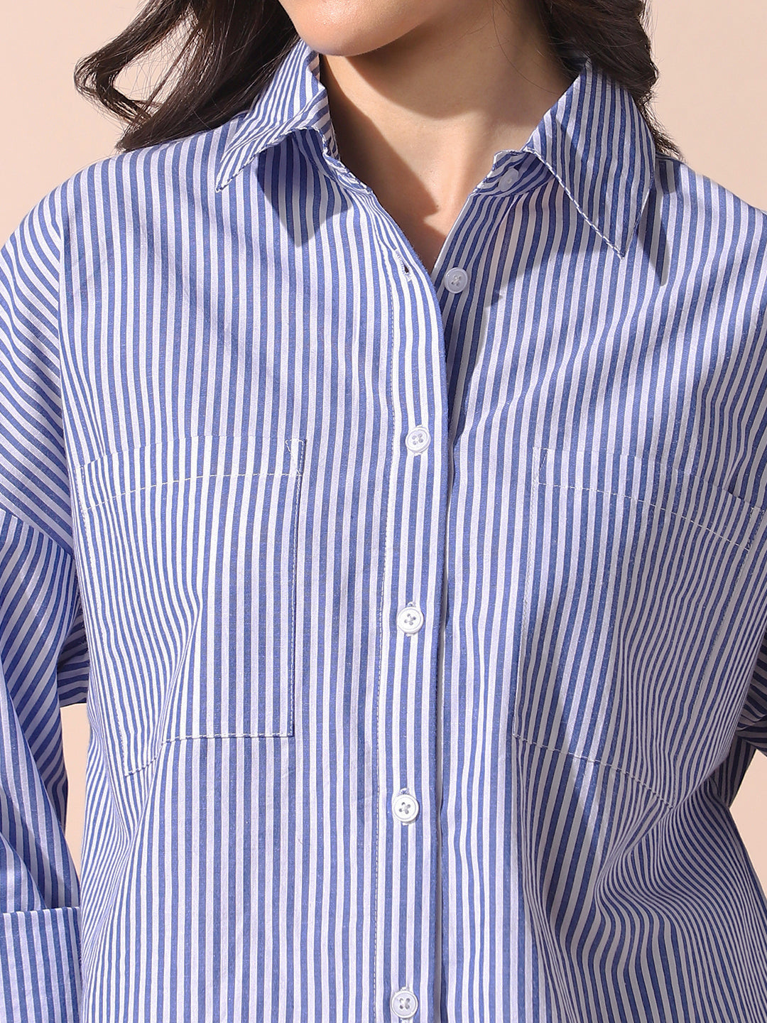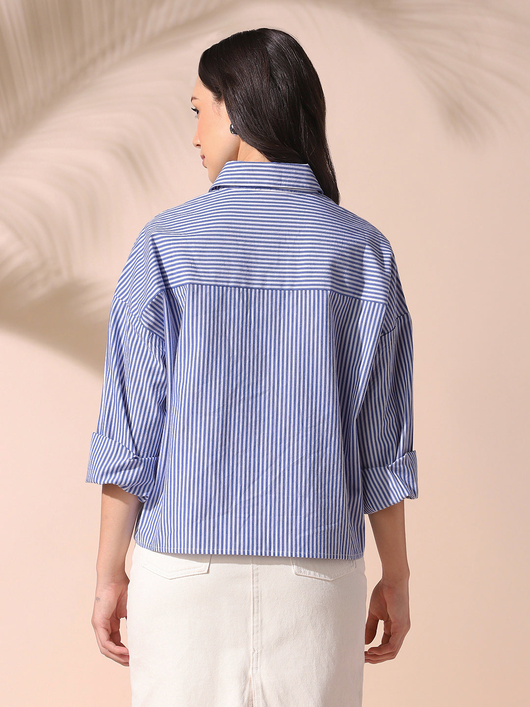 DL Woman Blue Striped Spread Collar Drop Shoulder Relaxed Cotton Shirt