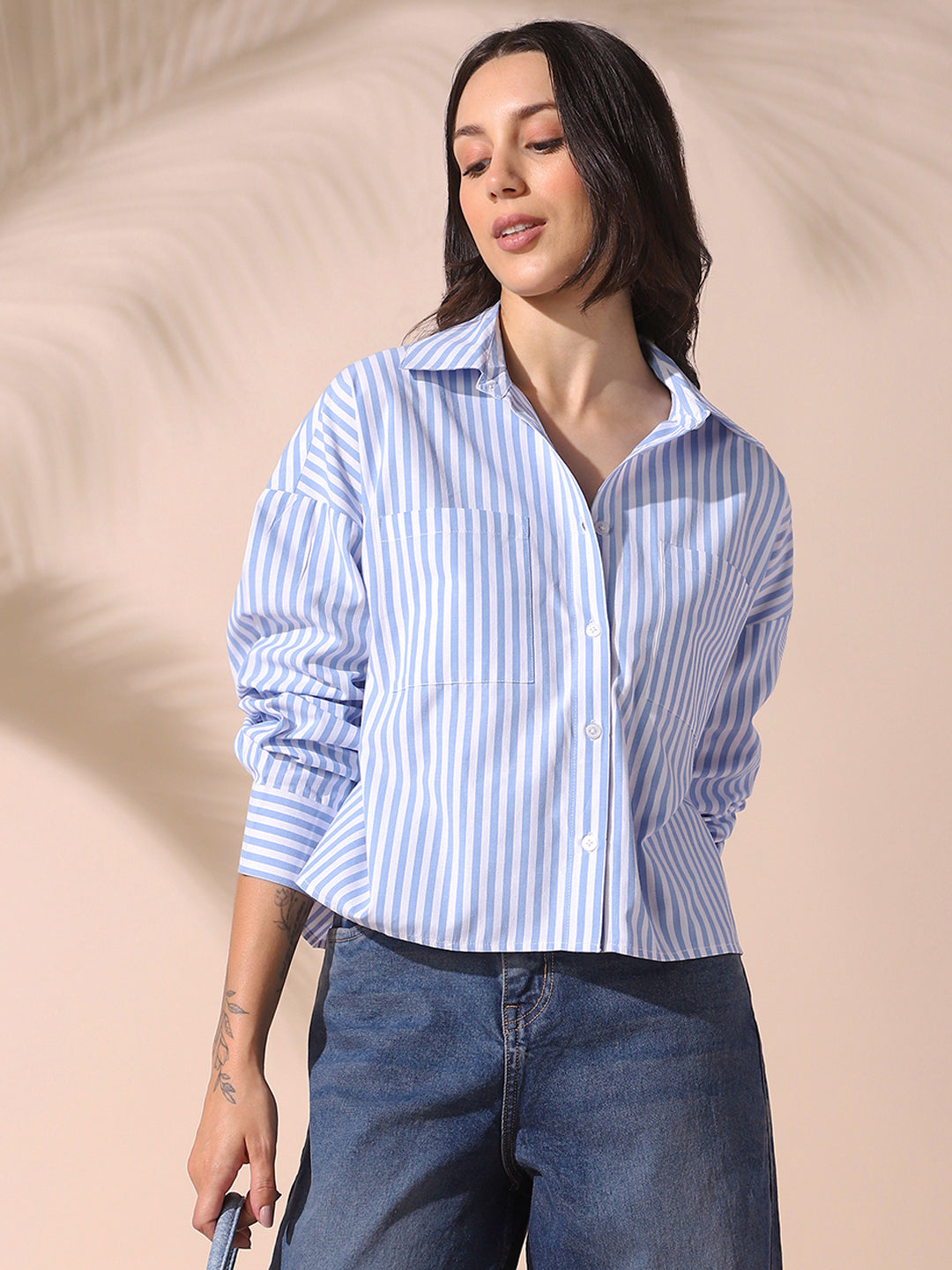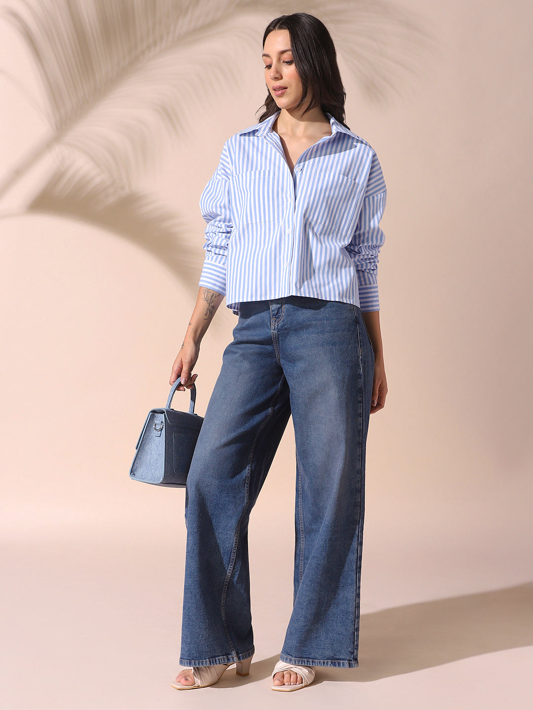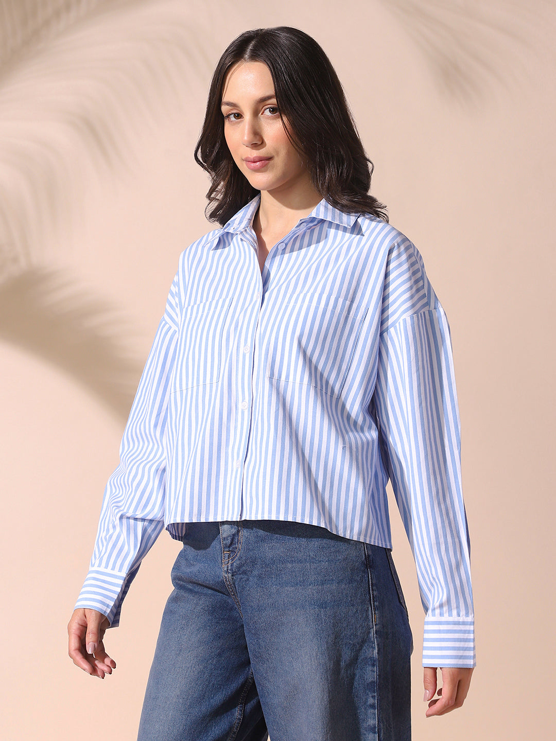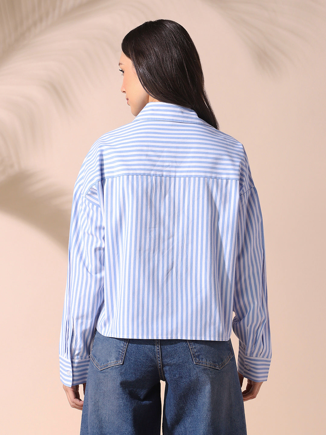 DL Woman Light Blue Striped Spread Collar Drop Shoulder Relaxed Cotton Shirt